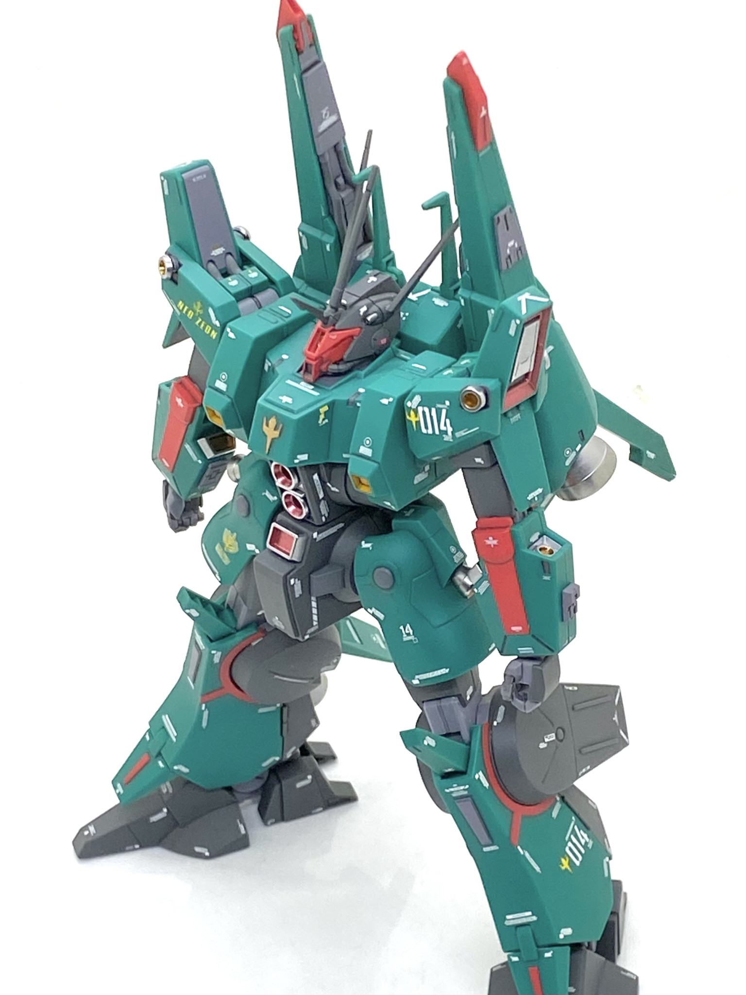 完成品見て思ったのは「かなりMETAL ROBOT魂(Ka signature)に似ている」と思いました・・・ デカール自体はほぼMGのVer.Kaのですからカトキ風になるのは当然なのですが(笑)。機体が大きいのでサイズ違いのデカールでも違和感なく、昔はデザインが良いHGシナンジュのを使ってましたがもう在庫が少ないので大きめのジオン系の機体にはMG サザビーVer.Kaのを使うつもりです。ドーベン・ウルフのキットをキチンと仕上げるには相当な労力が掛かりますが・・・プロポーション、ディテールは素晴らしいの一言で成形色仕上げでもここまで良くなるとは思いませんでした。再販でも買う事自体が困難な機体ですがガンダムZZが好きな方にはたまらない物があるので機会があれば是非作ってみて下さい。