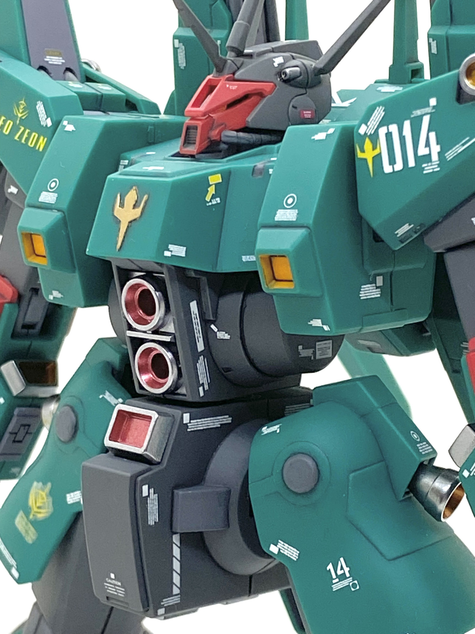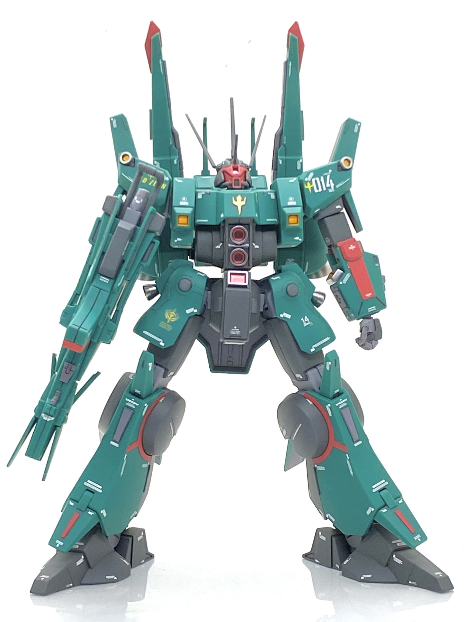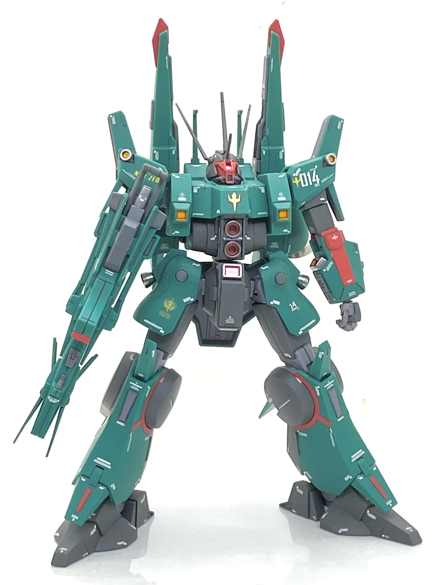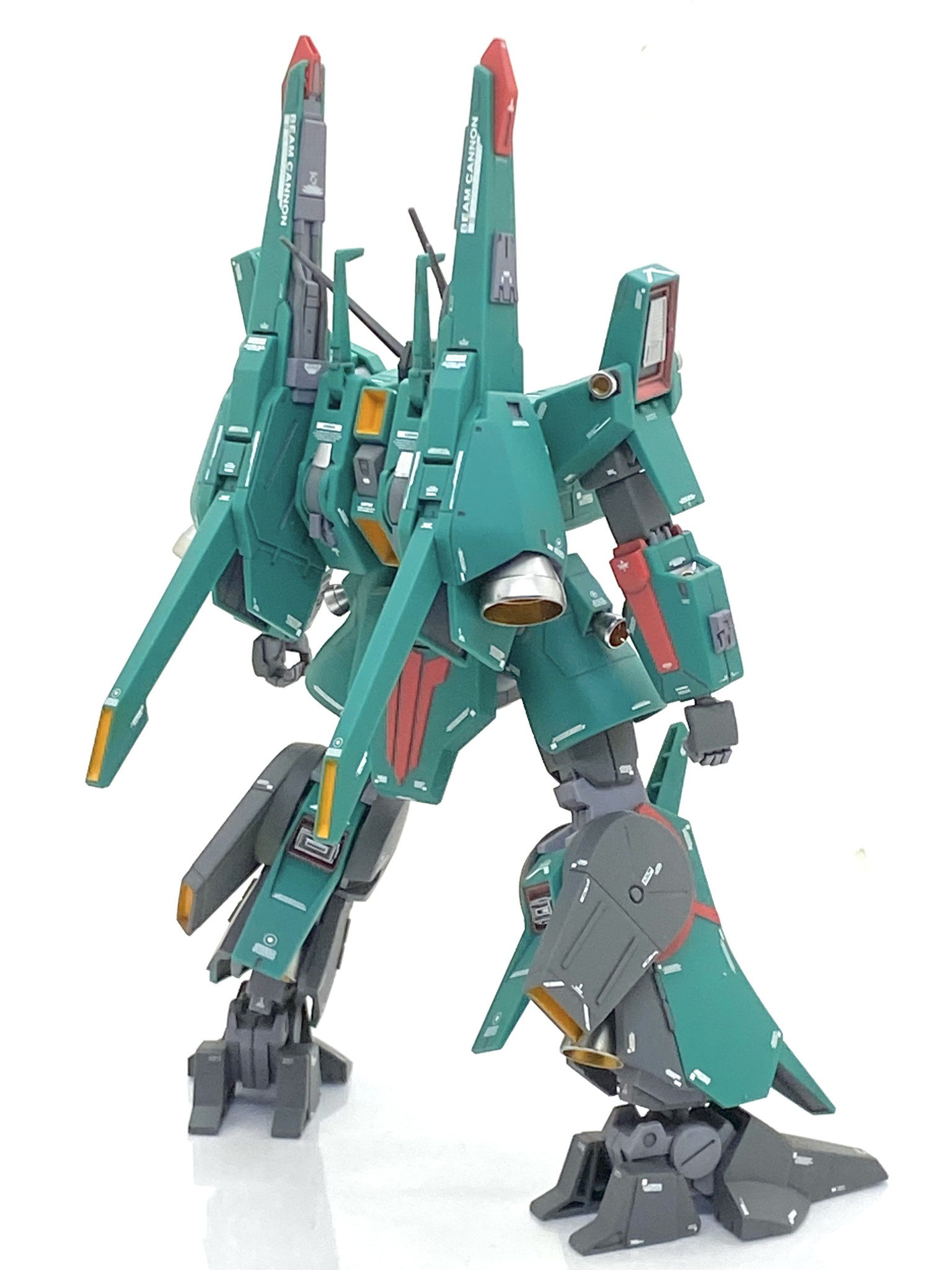 塗分けは今回は頑張りました。腰の後ろと胸にある紋章と脚にある赤いラインは大変面倒でした・・・まずはディテール状をタガネを使って彫り直してからマスキングテープを貼り、刃を立てたデザインナイフでモールドをなぞる様に切りました。慎重に切ったおかげで漏れる事もなく、ムラなく綺麗に塗れてます。オレンジの箇所もマスキングし難い箇所ばかりで下地に白塗っても中々発色しませんでした・・・やはり黄色やオレンジみたいな明るい色は鬼門です。メガ・ランチャー兼ビーム・ライフルは設定ですと緑一色でかなり単調な感じなのでグレーを差し色にして精密感を出しました。インコムもマスキングしても塗分けました・・・本体共々、グレーを差し色にして凹モールドに塗るだけでかなり良くなると思います。