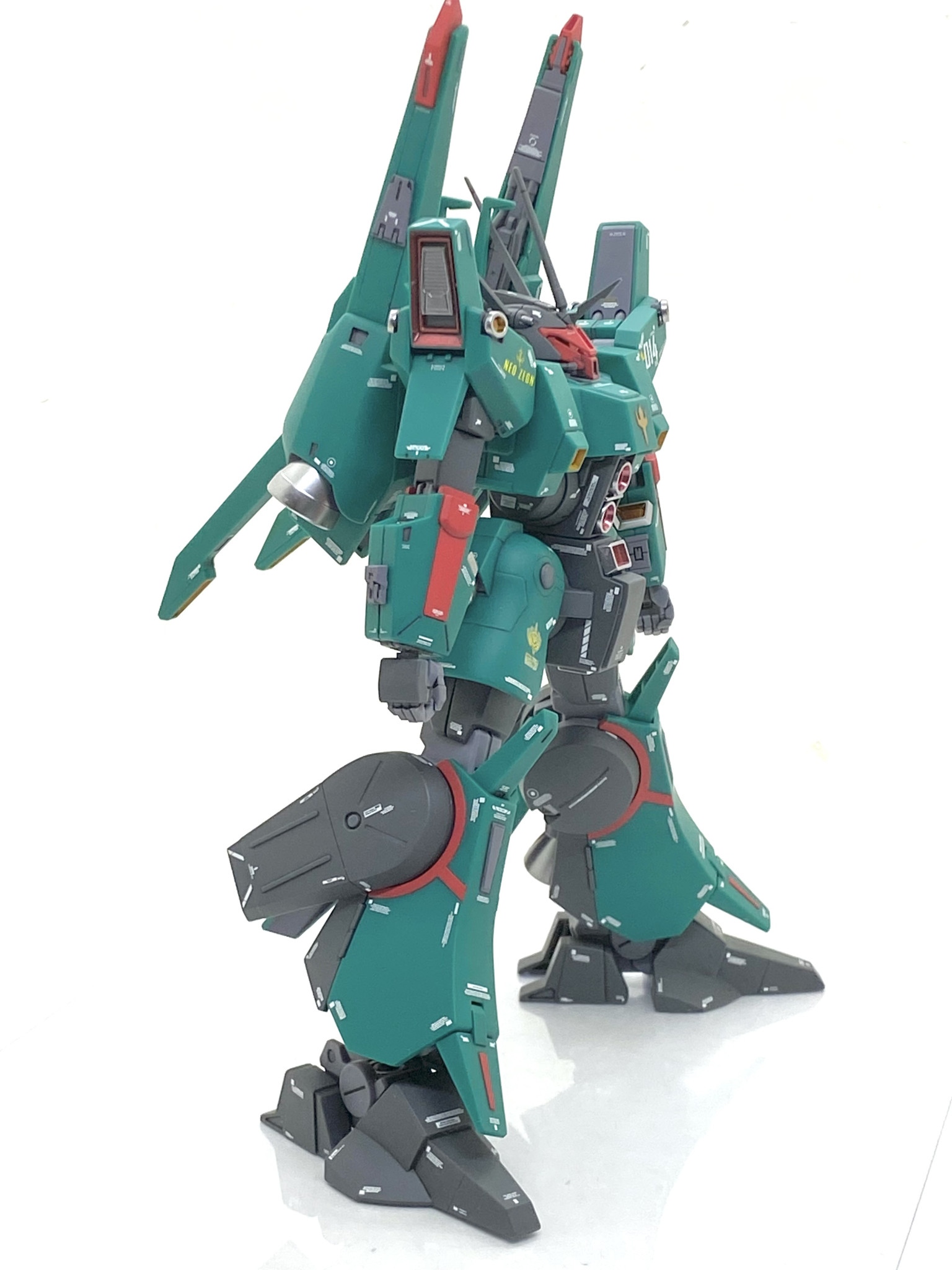ドーベン・ウルフは比較的、曲面主体の機体なので甘いモールドが多く、殆どの箇所をタガネで彫り直しています(特に腰のサイドアーマー)。墨入れが終わるとデカール貼りですが・・・この機体も相当大きいですから貼る箇所が多く、その為にMG サザビーVer.Kaを部品請求で頼んでいたのは正解でした。同じジオン系のデザインなのでサイズが違ってもほぼ違和感は無く、今回は相当数貼ってますが機体が大きいから煩くなってません。自分のデカール貼りの位置は装甲の継ぎ目やスラスター周り等の重要上な所になるべく貼っています。今もカトキハジメ氏のイラストやKa signatureのフィギュアを参考にしますが昔に比べたら自分で位置を考え貼る事が断然に多くなりました・・・仕事もそうですが人真似しかしないと成長しないですし、他人をリスペクトしなくなりがちなので失敗しても自分で位置を考えて貼る事をお勧めします。自分も考えながら作ってきたから少しは成長したと思います(笑)。