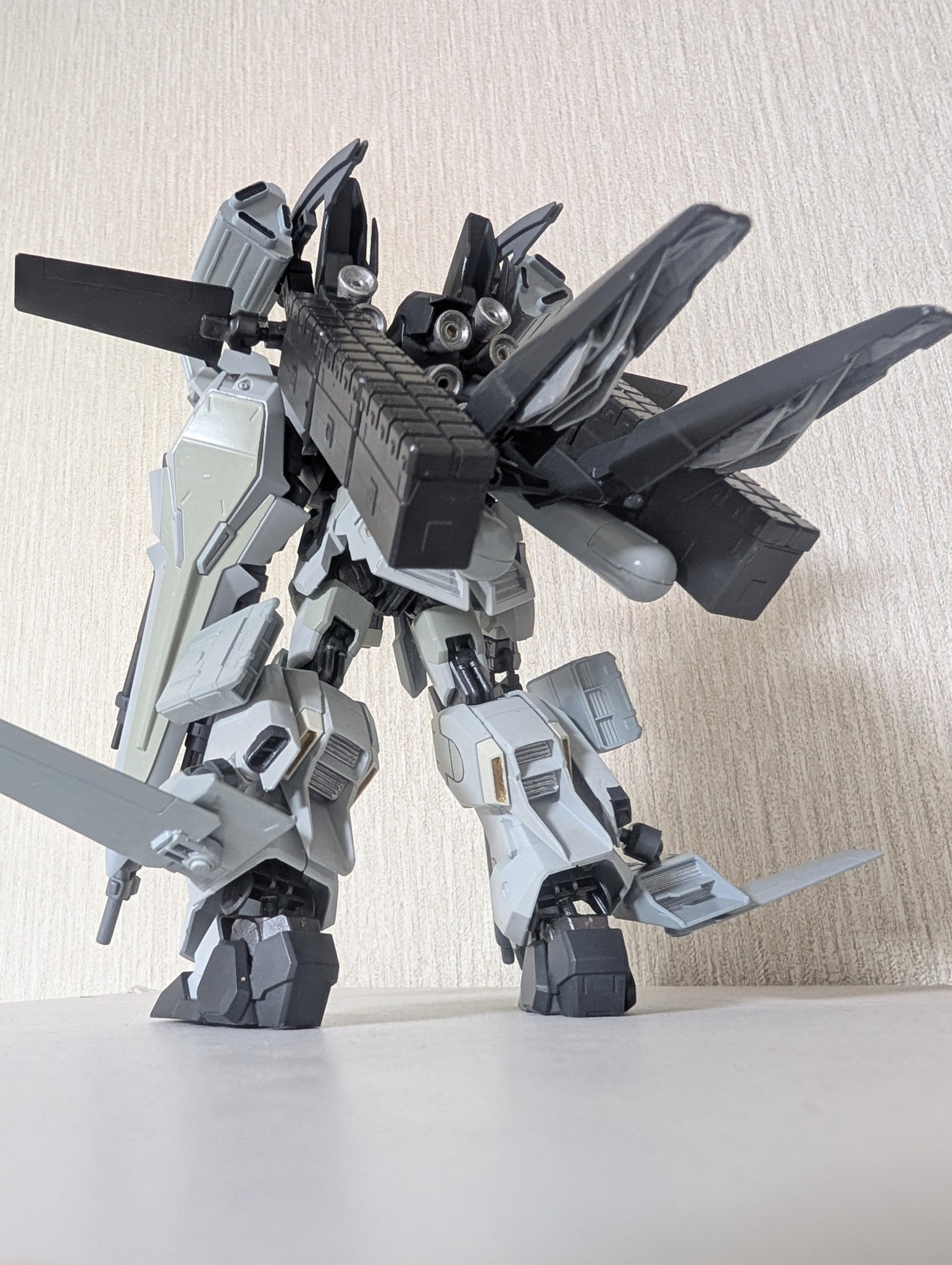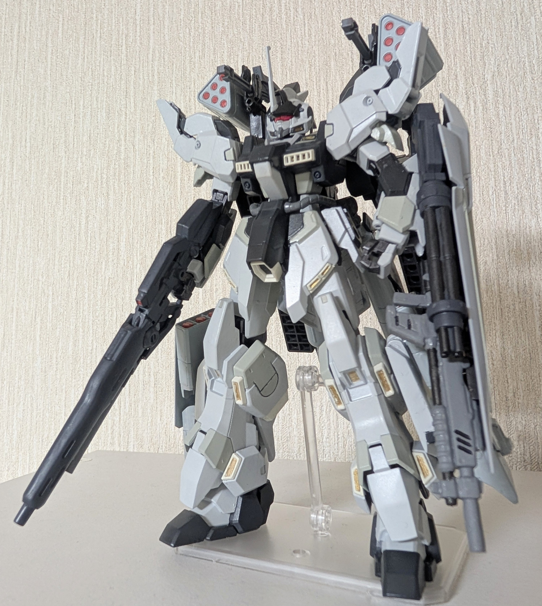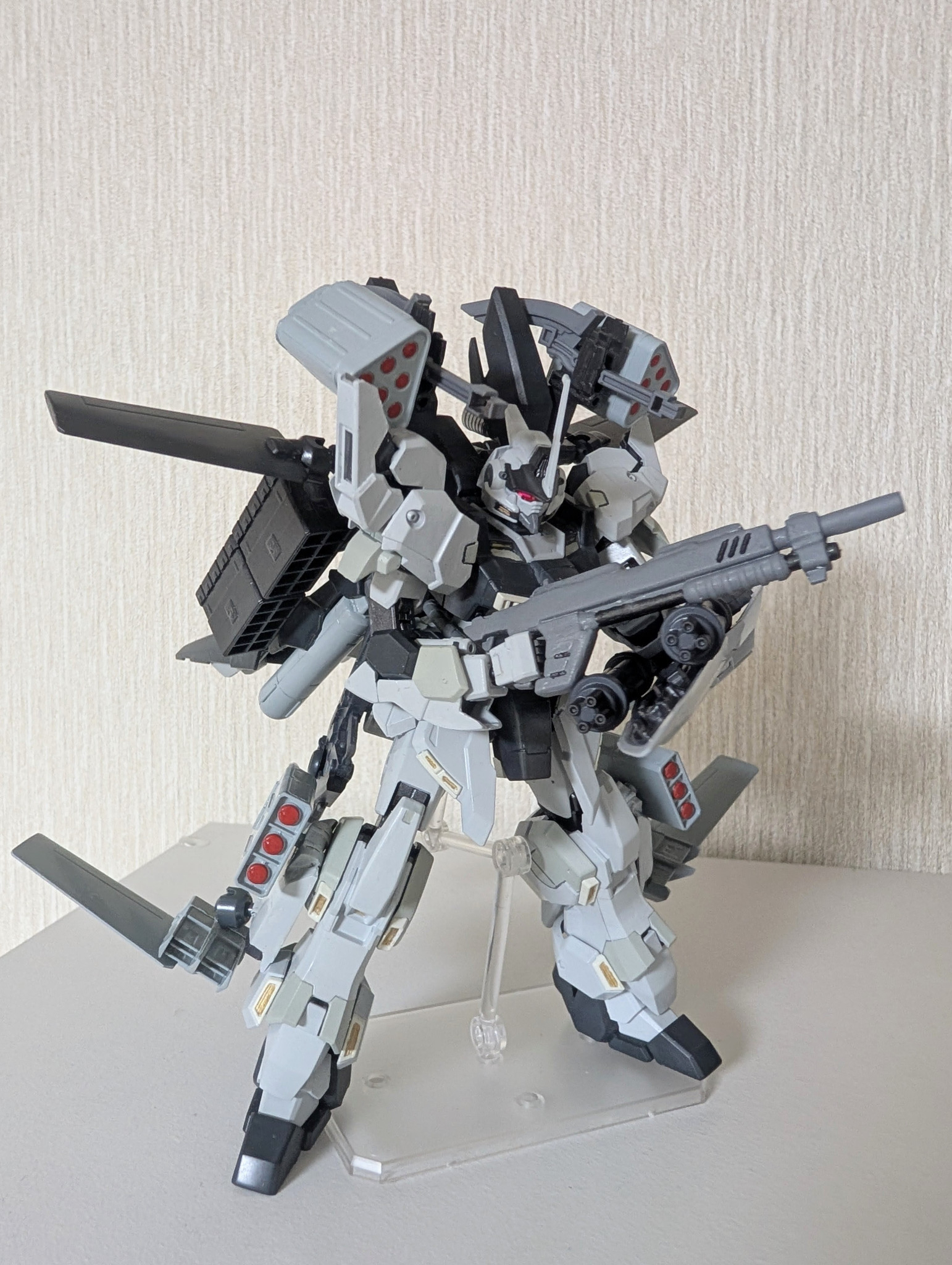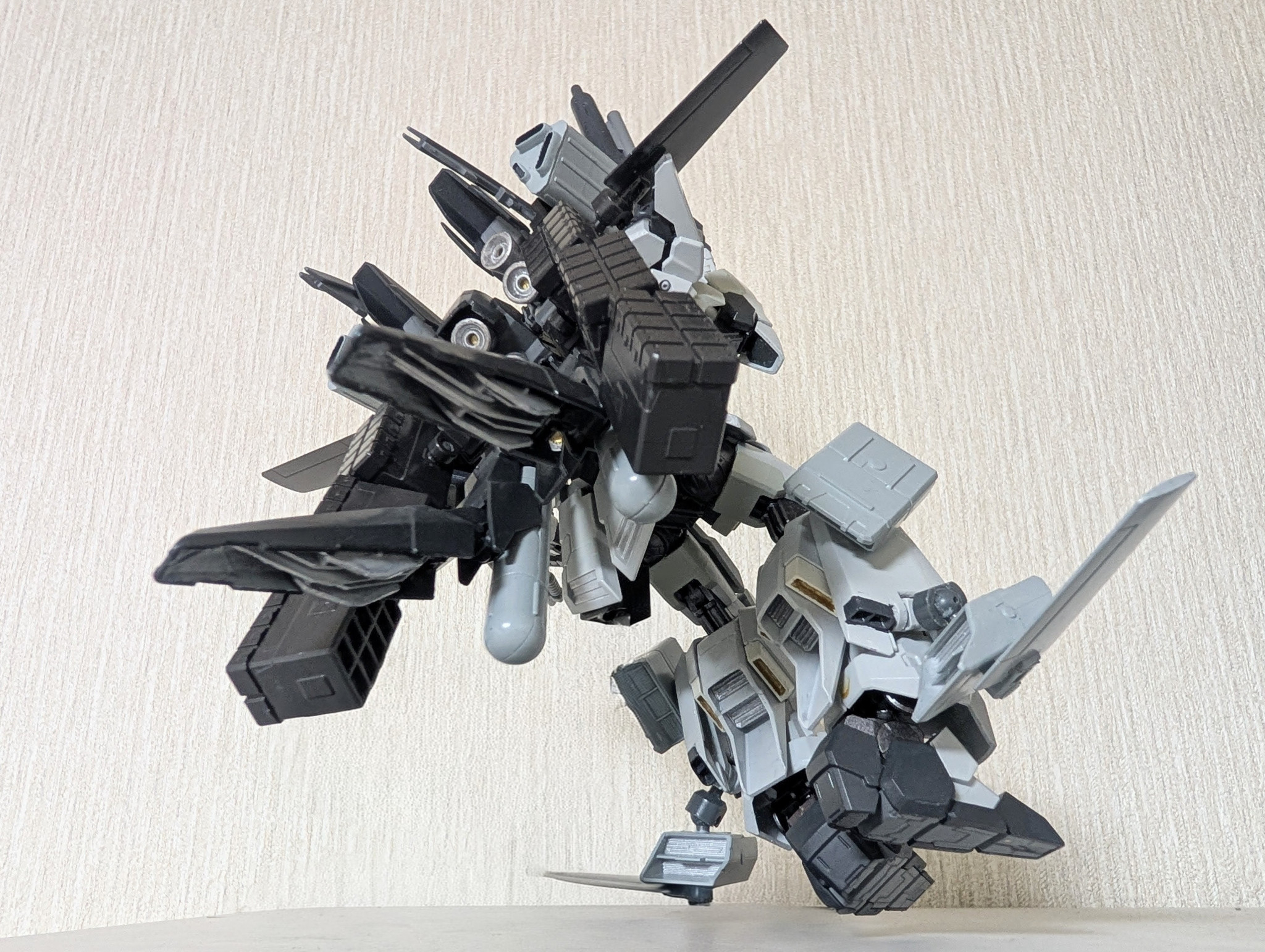 多数のミサイルとビームマシンガン、ビームガトリング、ショットガン等々面制圧用の武装で弾幕を形成、ミサイルを撃ち切って身軽になった後はホバーにより高機動戦に対応します。