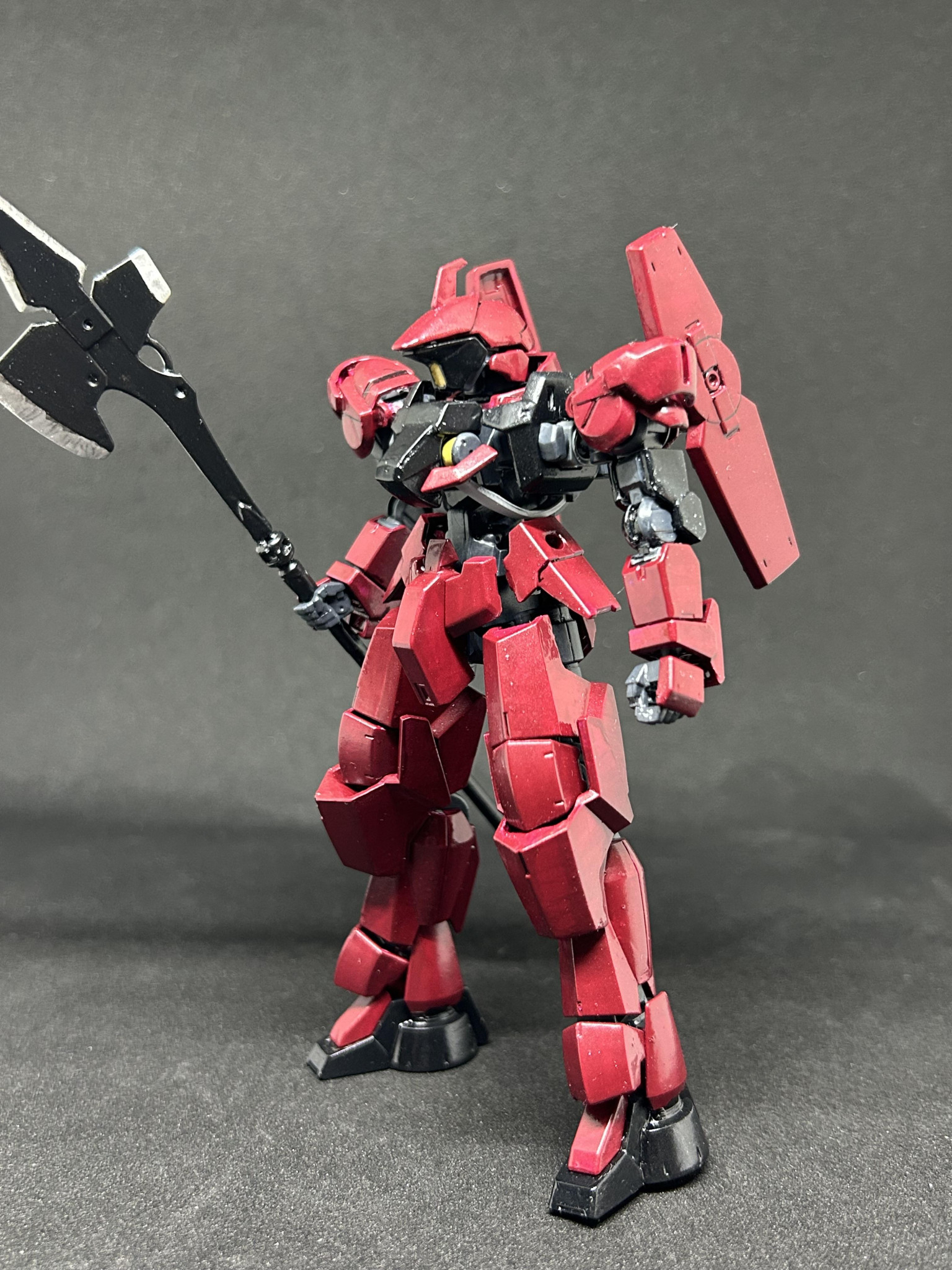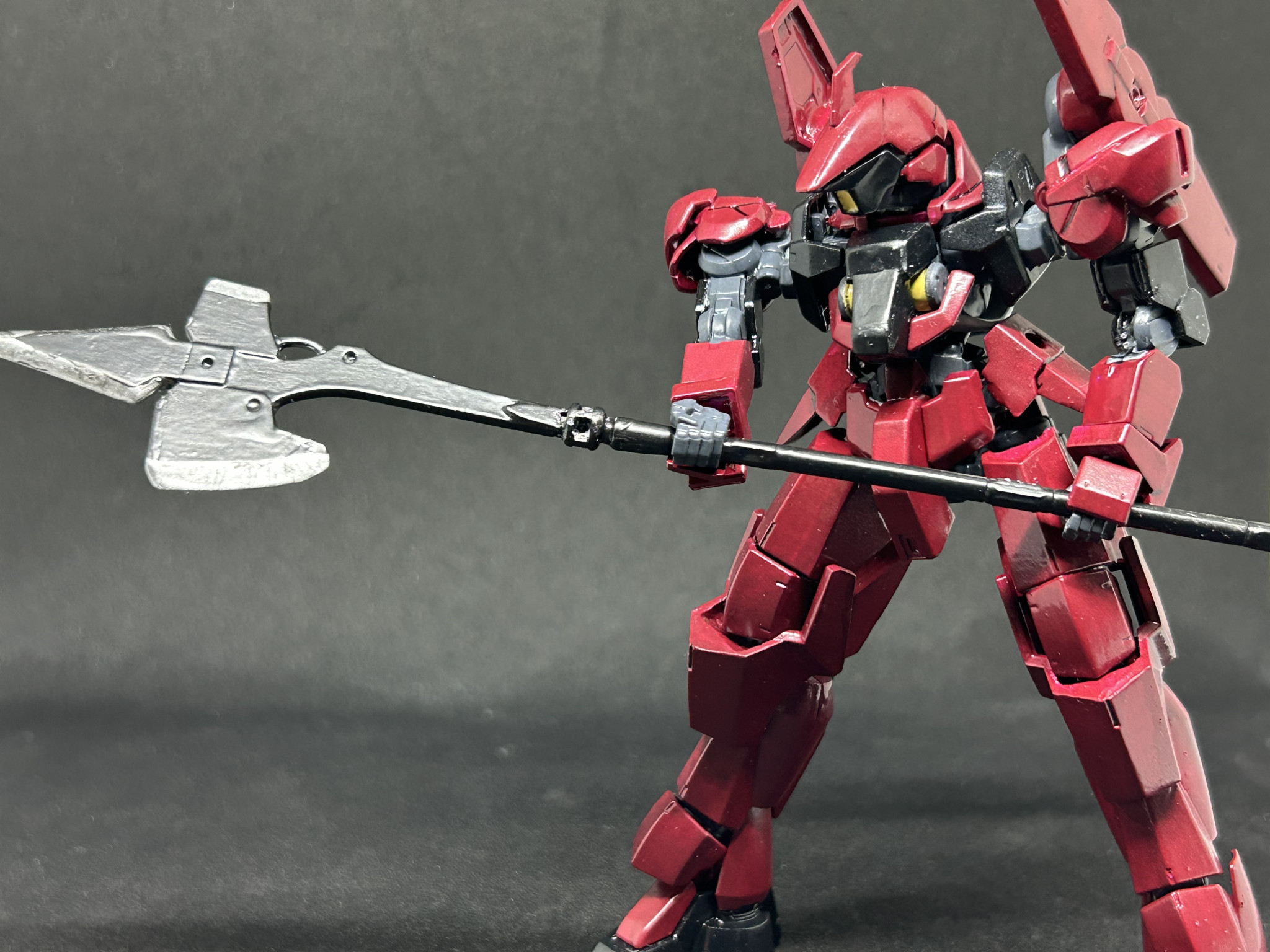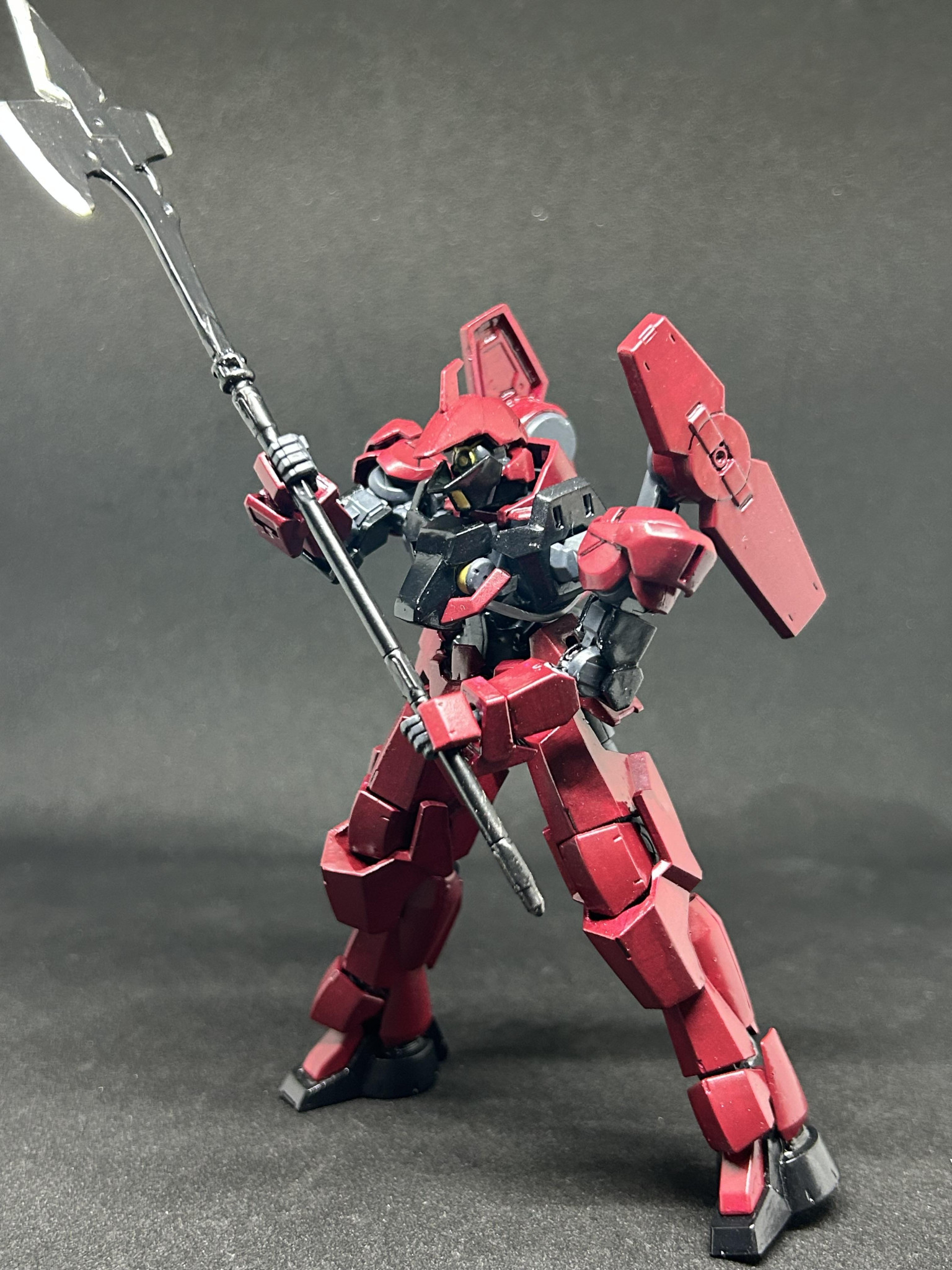 鉄血のオプションパーツの地上用グレイズの足使いたいというのと、アリアンロッドのグレイズのハルバートかっこいいー作れないかなー、でやってみたらいい感じに作れたのでグレイズに持して改造してみました。