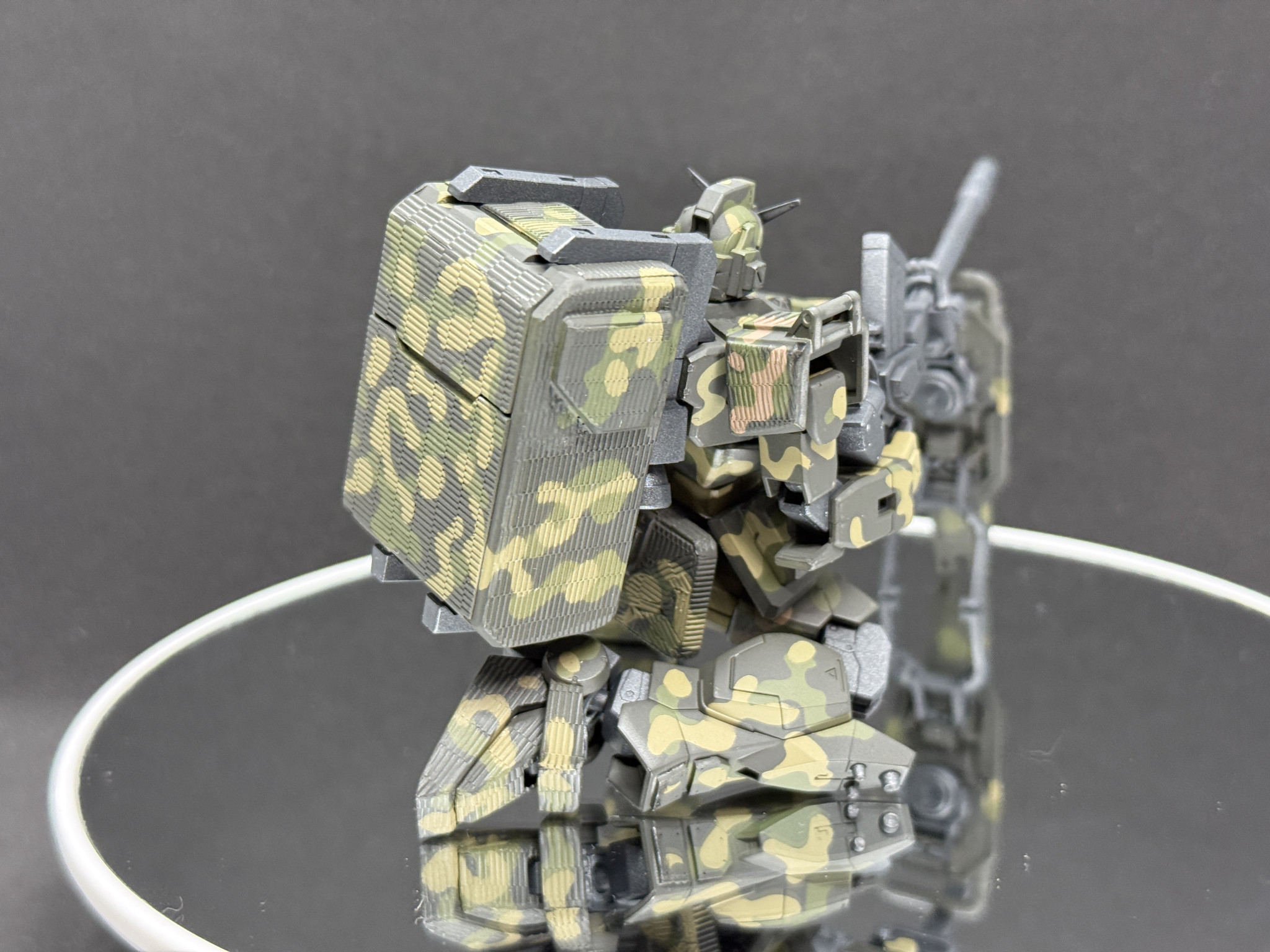 やはり陸戦型ガンダムはその名の通りに陸戦兵器ですし、迷彩の方が良いはずだ!ということで挑戦。カラーは手元にあるものを使ったのでしっかりとした色の組み合わせではないかもしれませんが、概ね満足です!これはズゴックでもやった水迷彩塗装の経験が生きました。