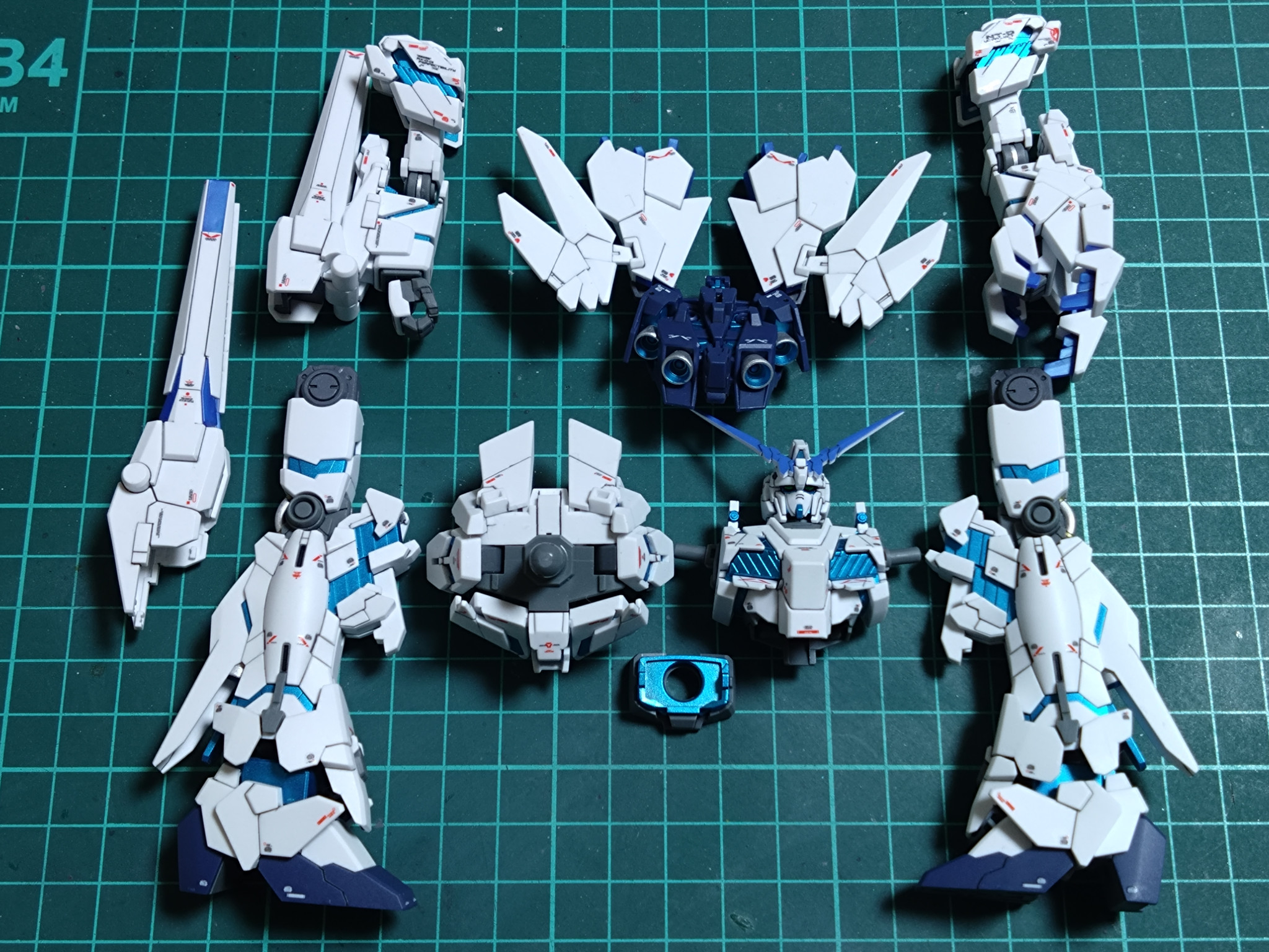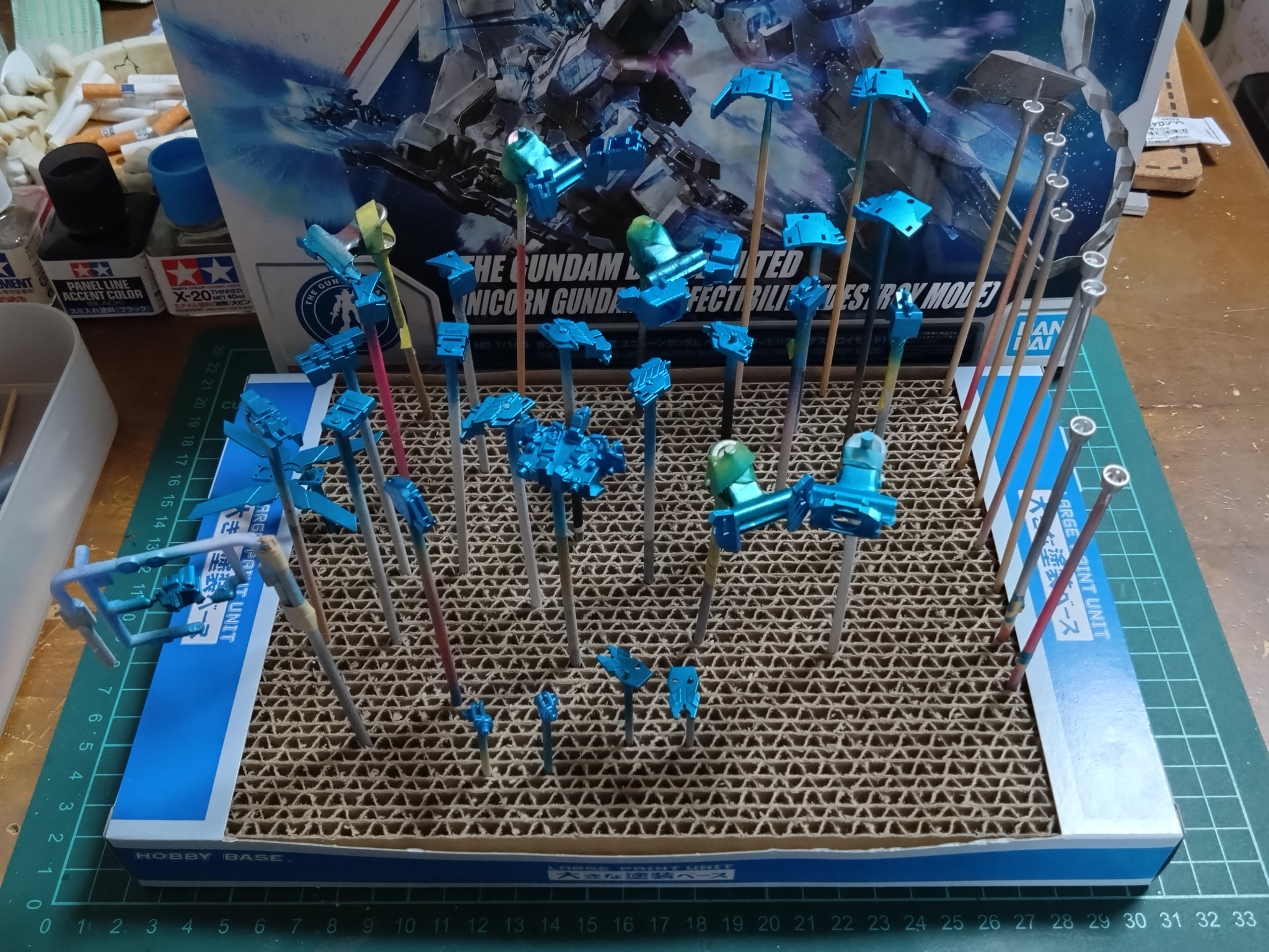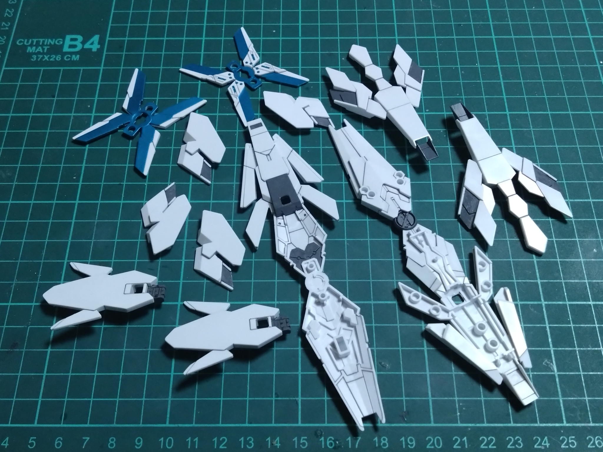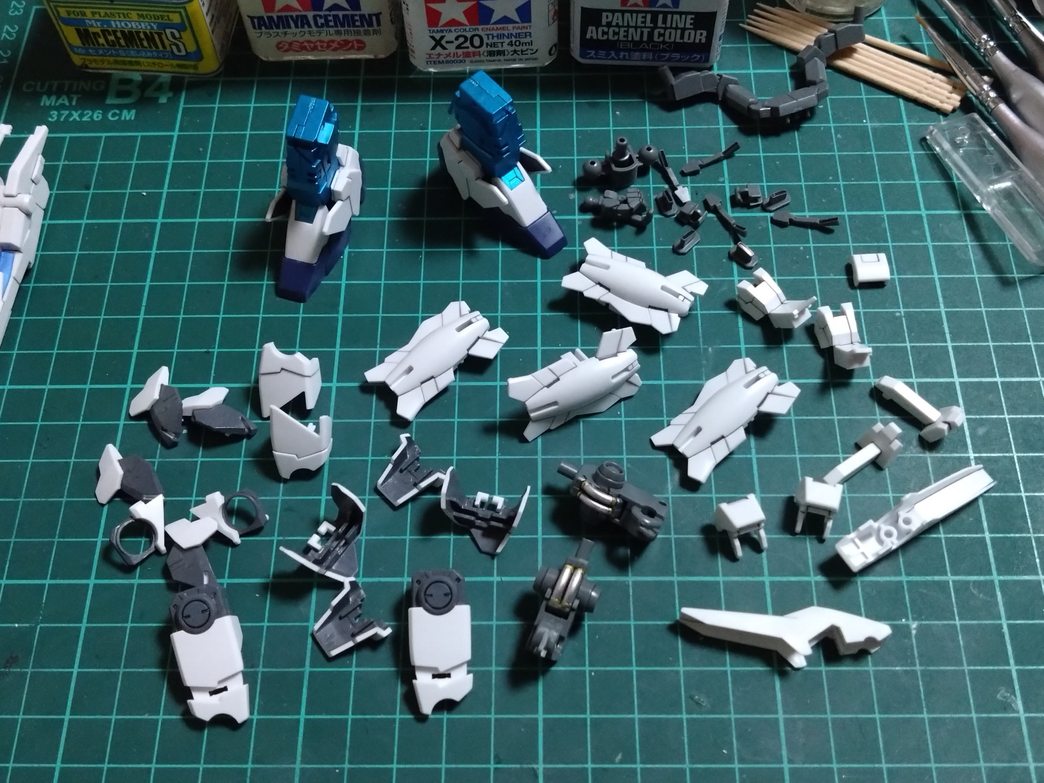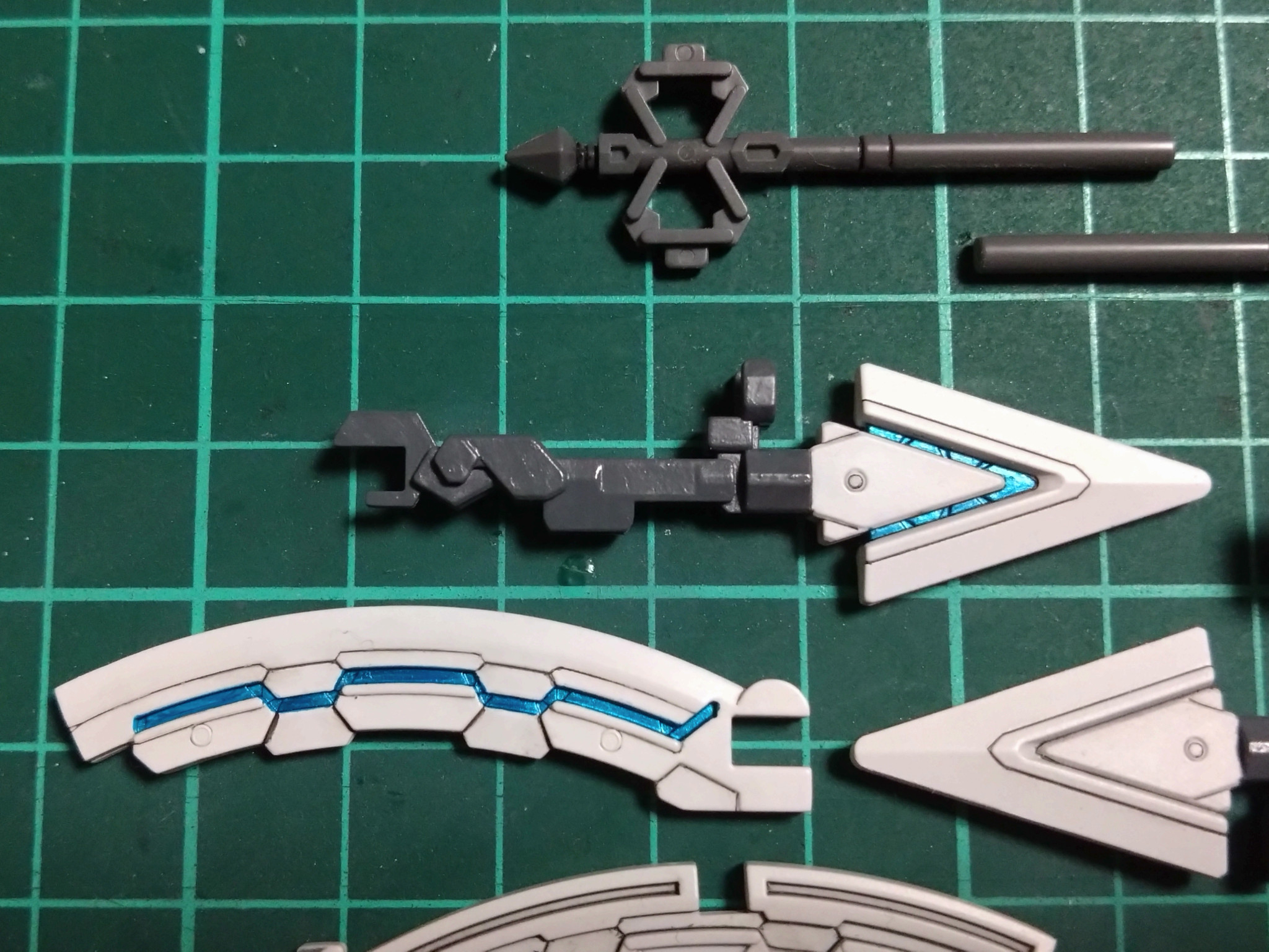 白サフを吹いて、ガンダムマーカーのコスモメタブルーで塗装しました。
