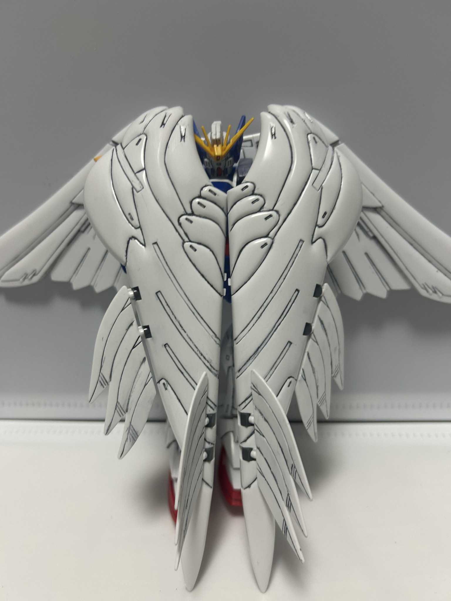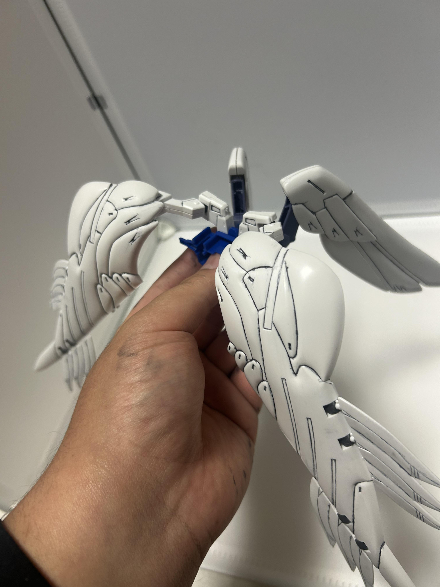 ということで制作過程。羽はすぐ作りたかったので先に。墨入れとスジ掘りやっていきましょうと。3時間以上掛かりましたが。これだけ変わるんだと…。