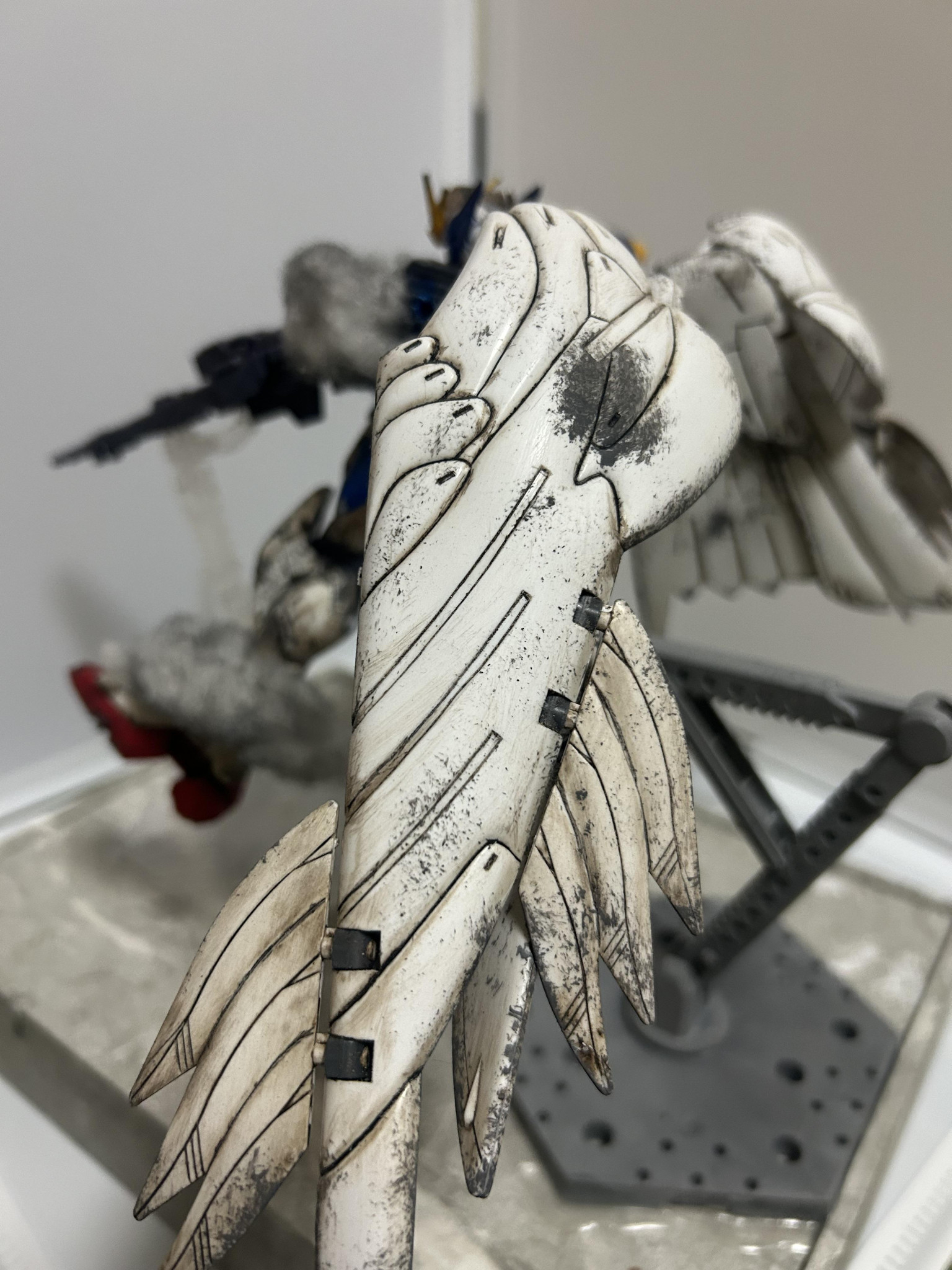 翼の汚しはダークブラウンを使用。少し汚し過ぎた部分もありましたが高い部分は控えめに出来たと思います。あとはチッピングで禿げている部分を再現。
