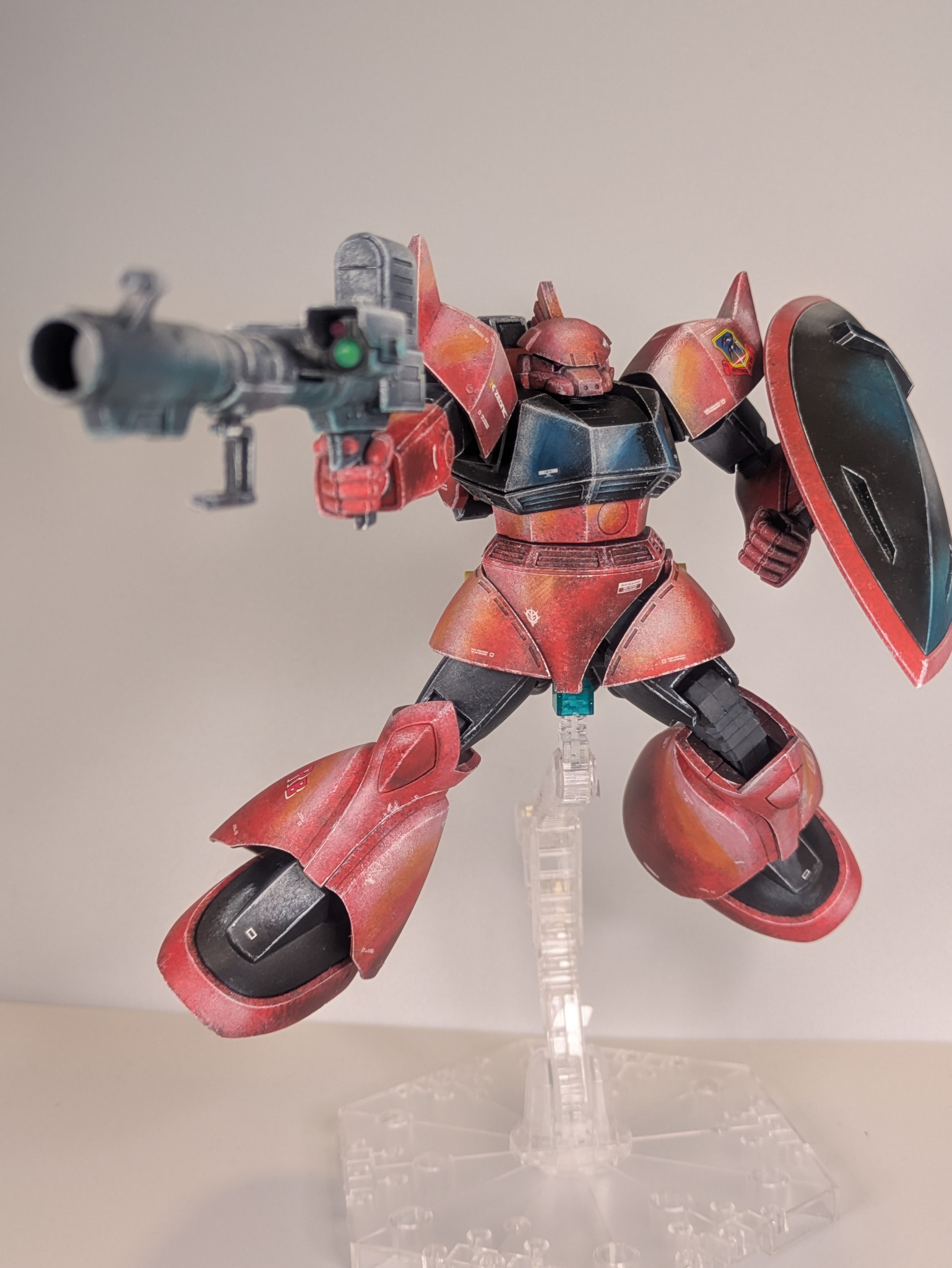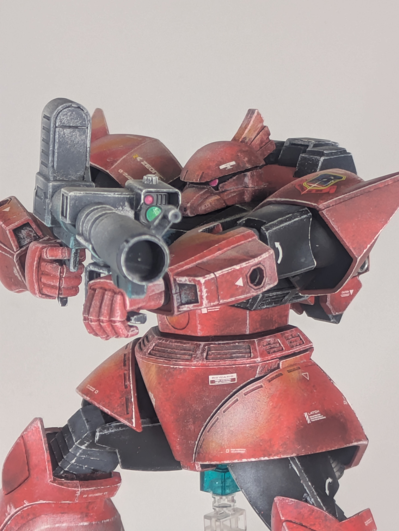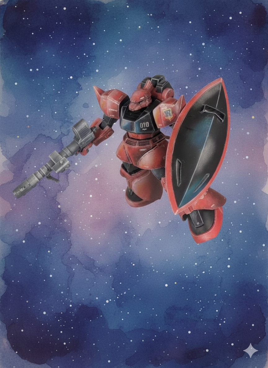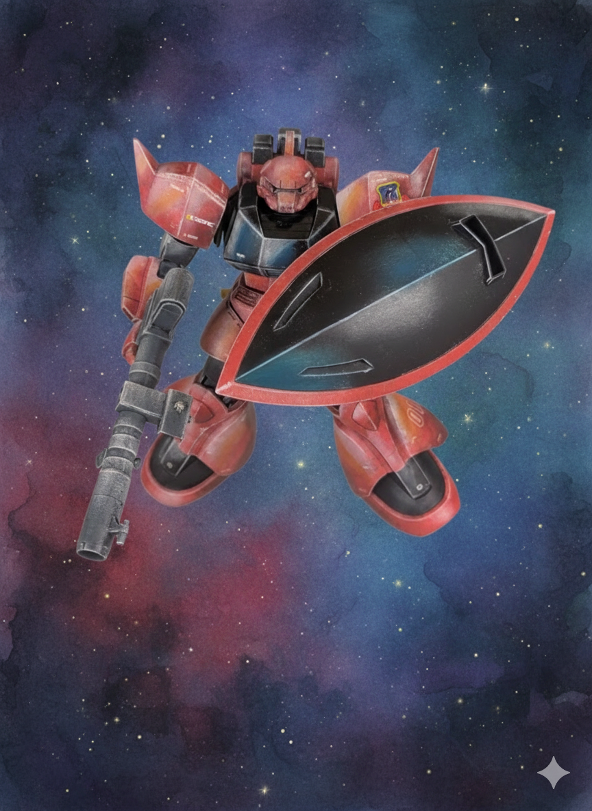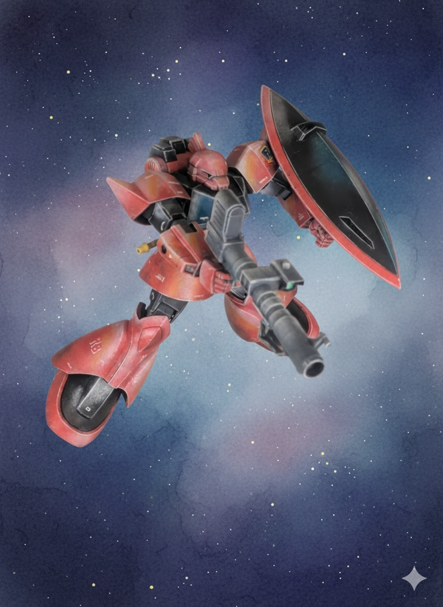 良い意味で一枚絵🖼️のような説得力に満ちた陰影、塗装方法が気になる🥳 ポージングもゲルググらしい躍動感👏😁