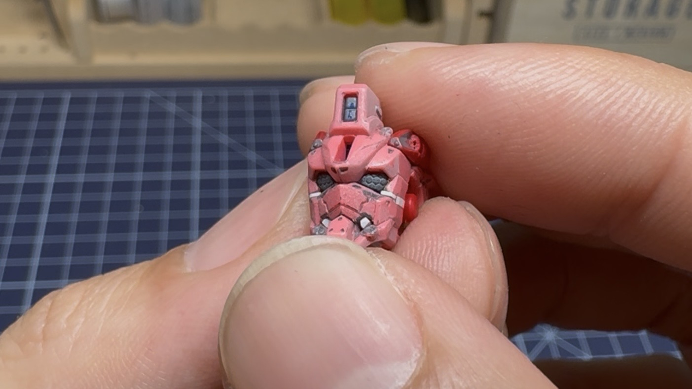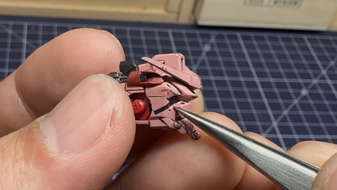 さらに頭部側面のダクト上にあるはずの丸いセンサーが再現されておらず、ディテールアップパーツでを貼り付けて再現していったりと頭だけでもいじりたくなるところが沢山ありました。