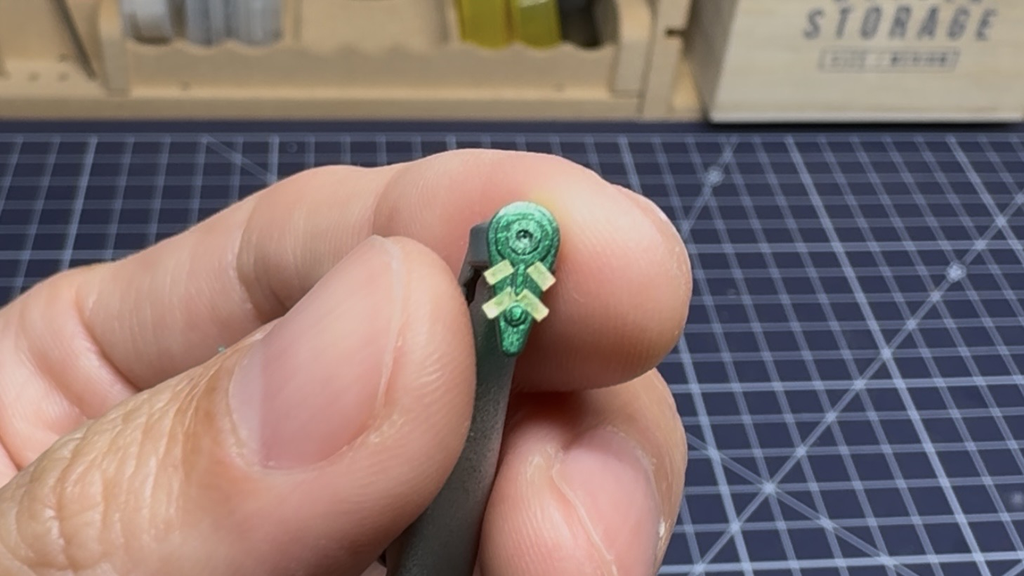 柄を再現できるようにマスキングしてからブラストダークアイアンで塗装していきました。円形部分はマスキングゾルを使用しています。
