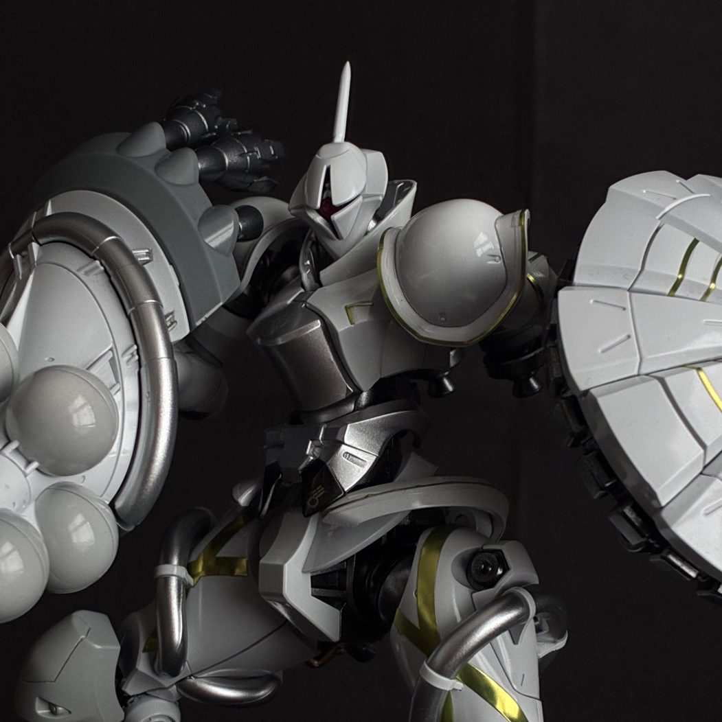 下地シルバーの上に、無色クリアーと白を一対一で混ぜたもので発色させています。ハクジ装備のバーニアはビルダーズパーツのかっこいいやつに換装。モノアイもビルダーズパーツのものを埋め込んでいます。元キットのモノアイはかなり小さかったので。