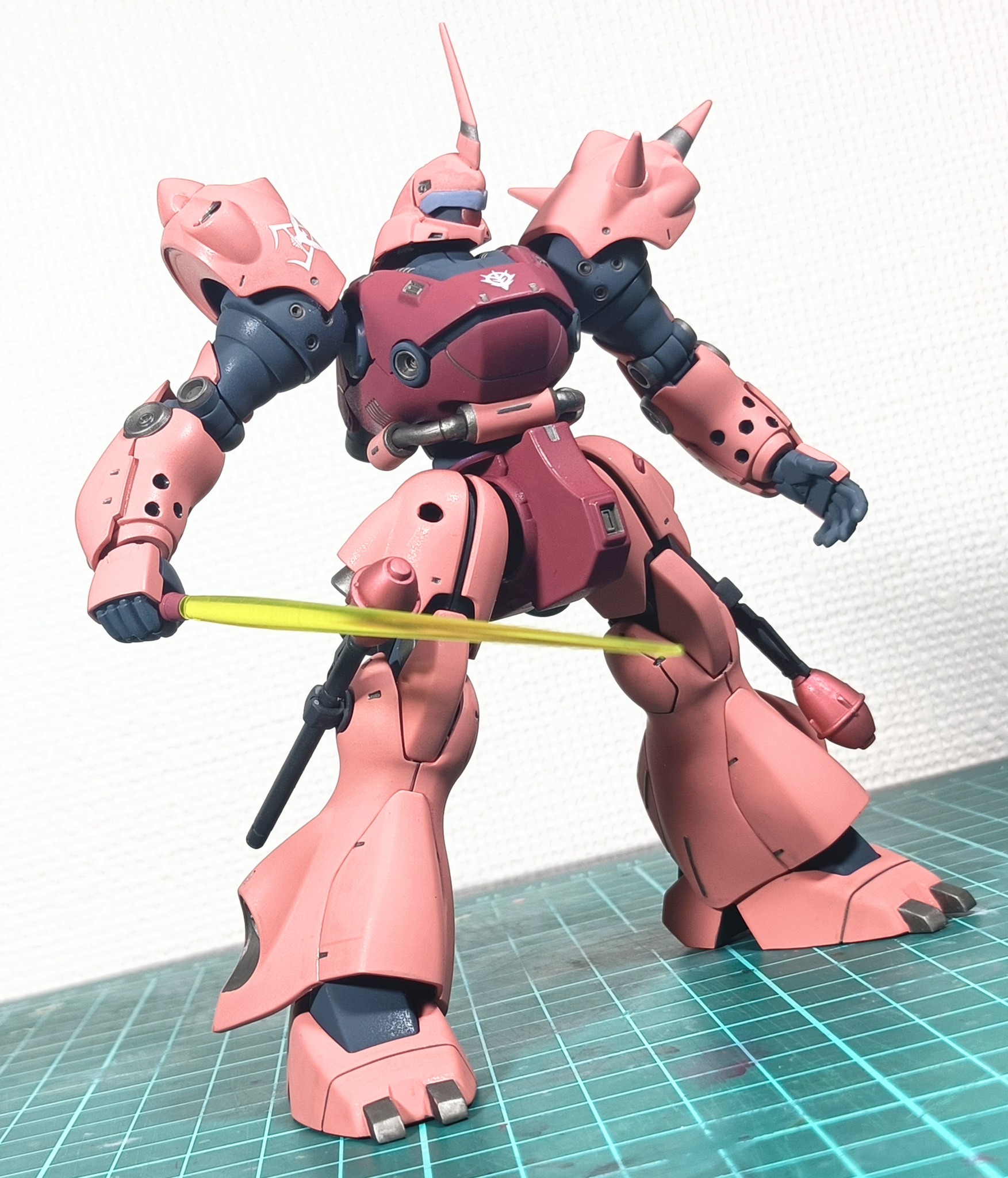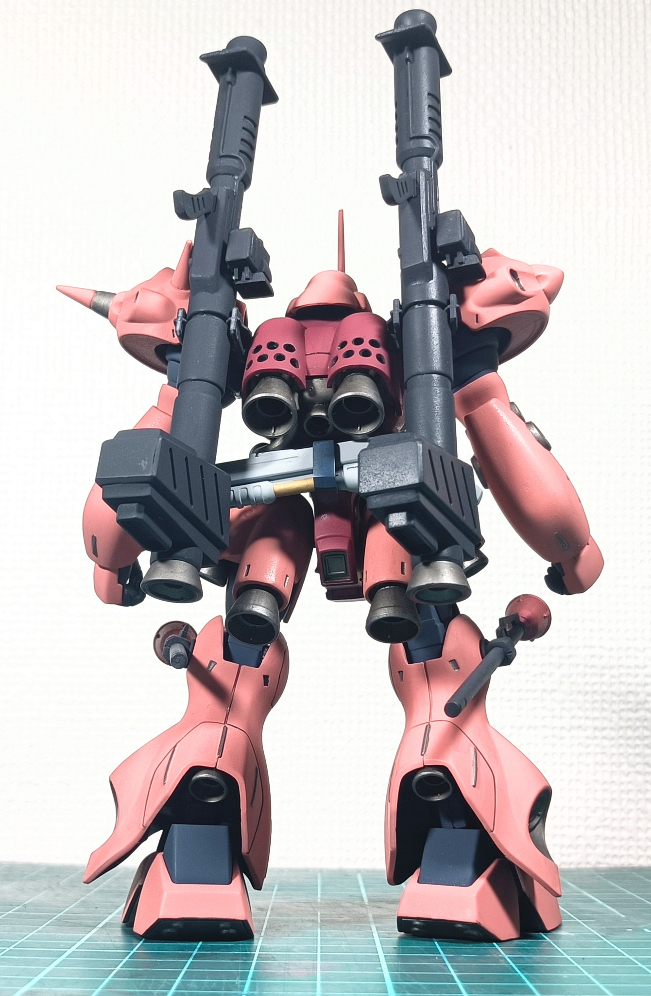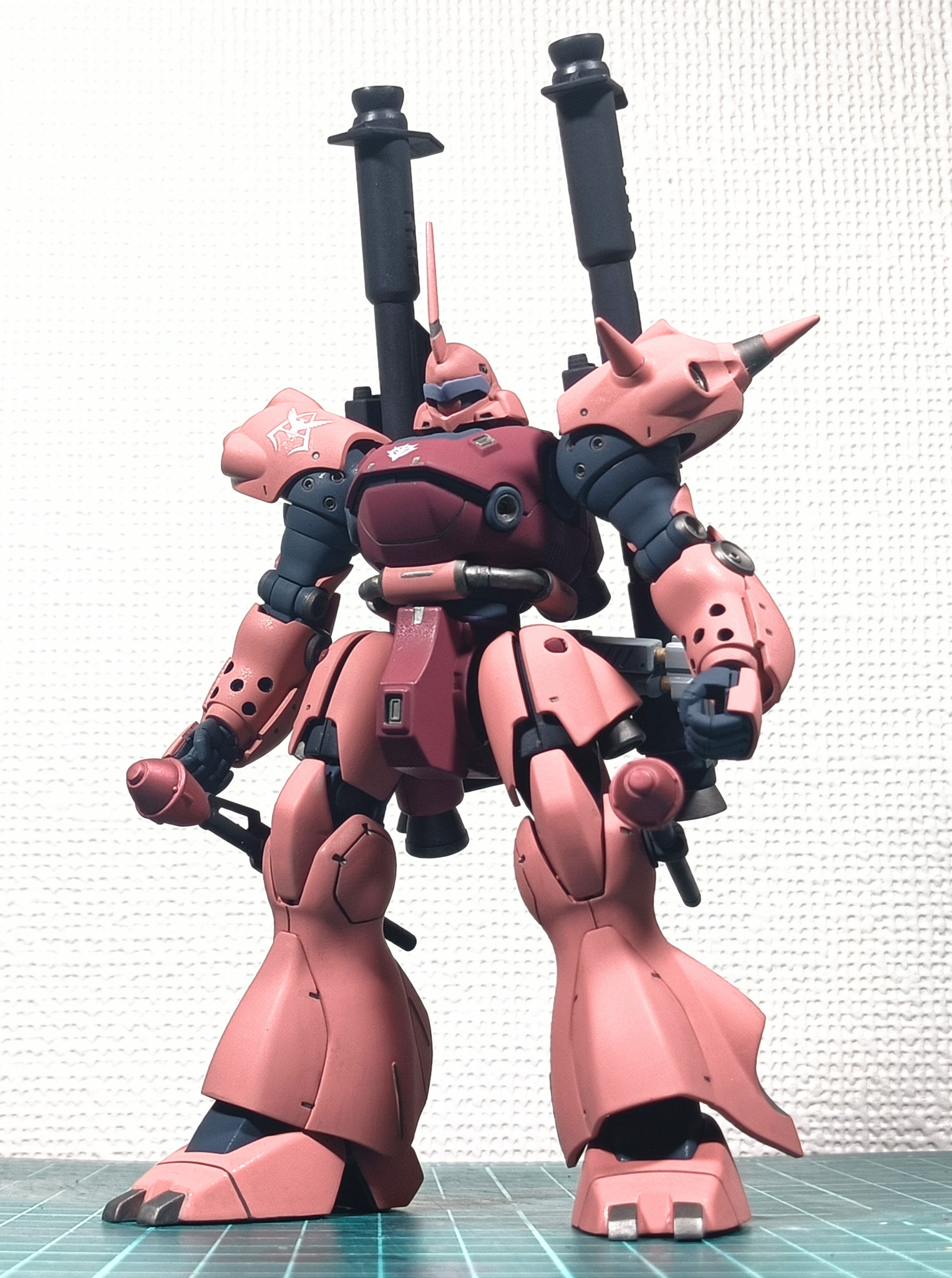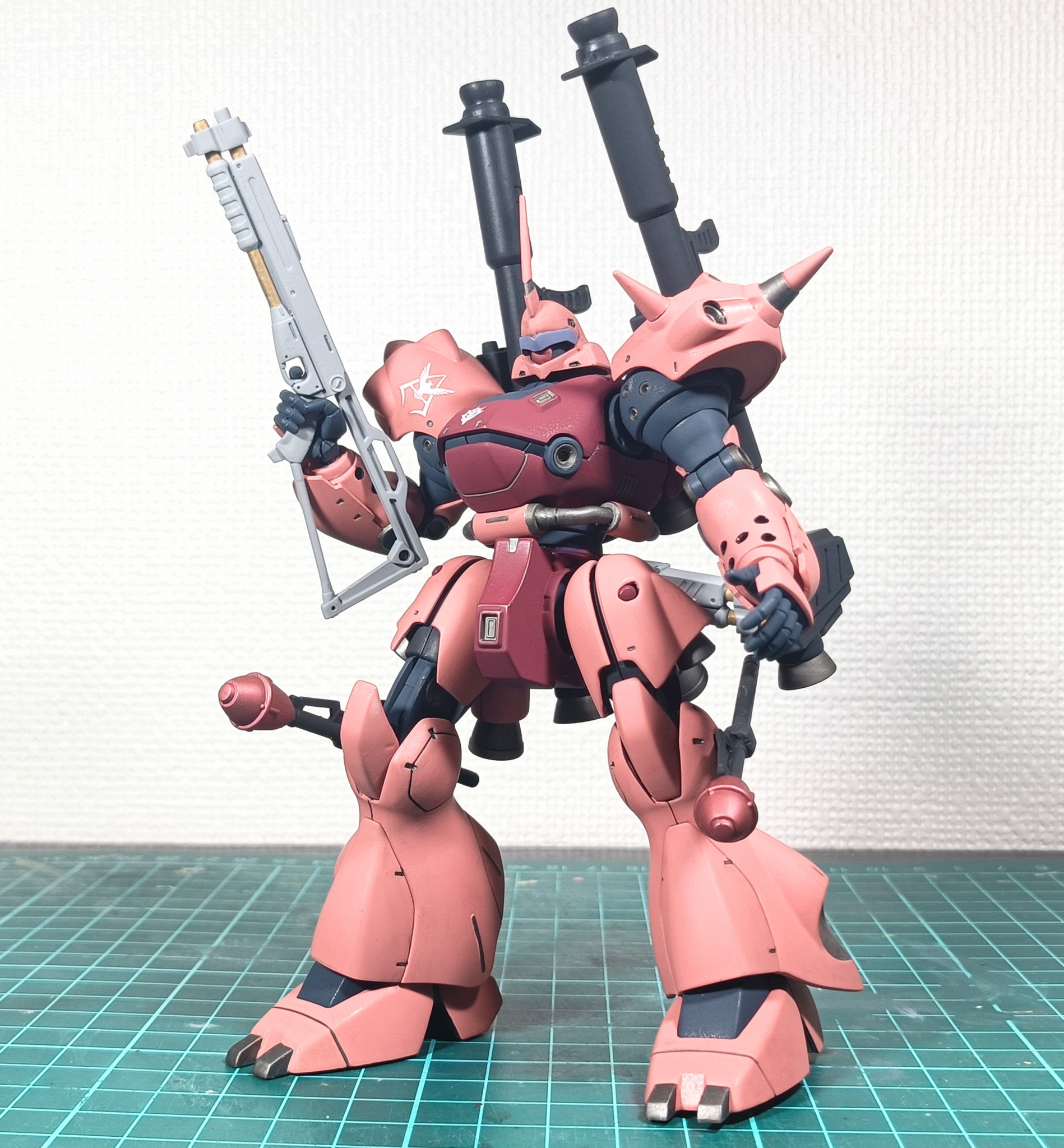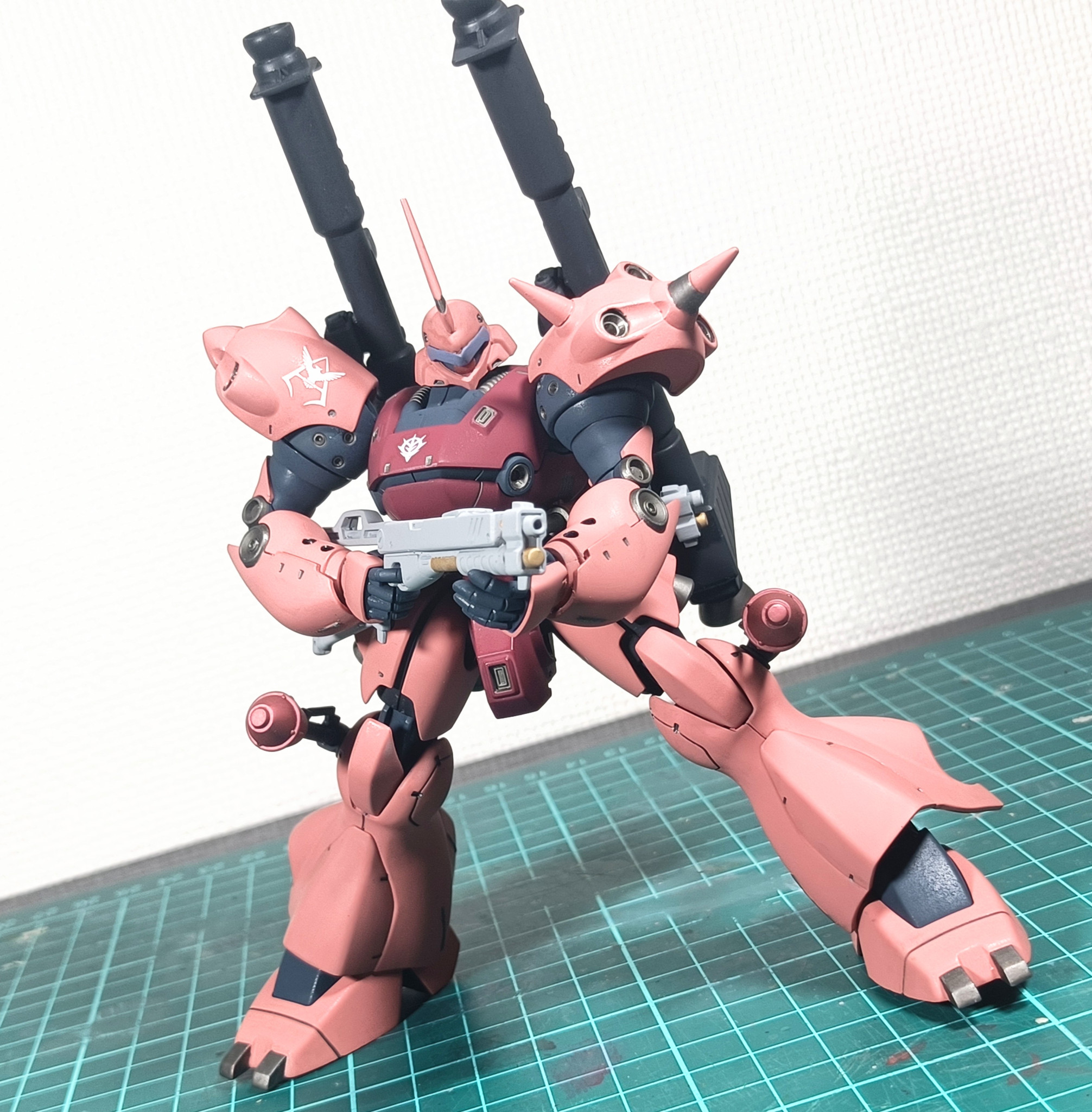 メインの塗料はMSシャアレッドとピンク、Mr.カラーディープオーシャンブルー、部分にディスペイのガンメタを使用。プレミアムなんたらのつや消しトップコートを最後に吹いてます。