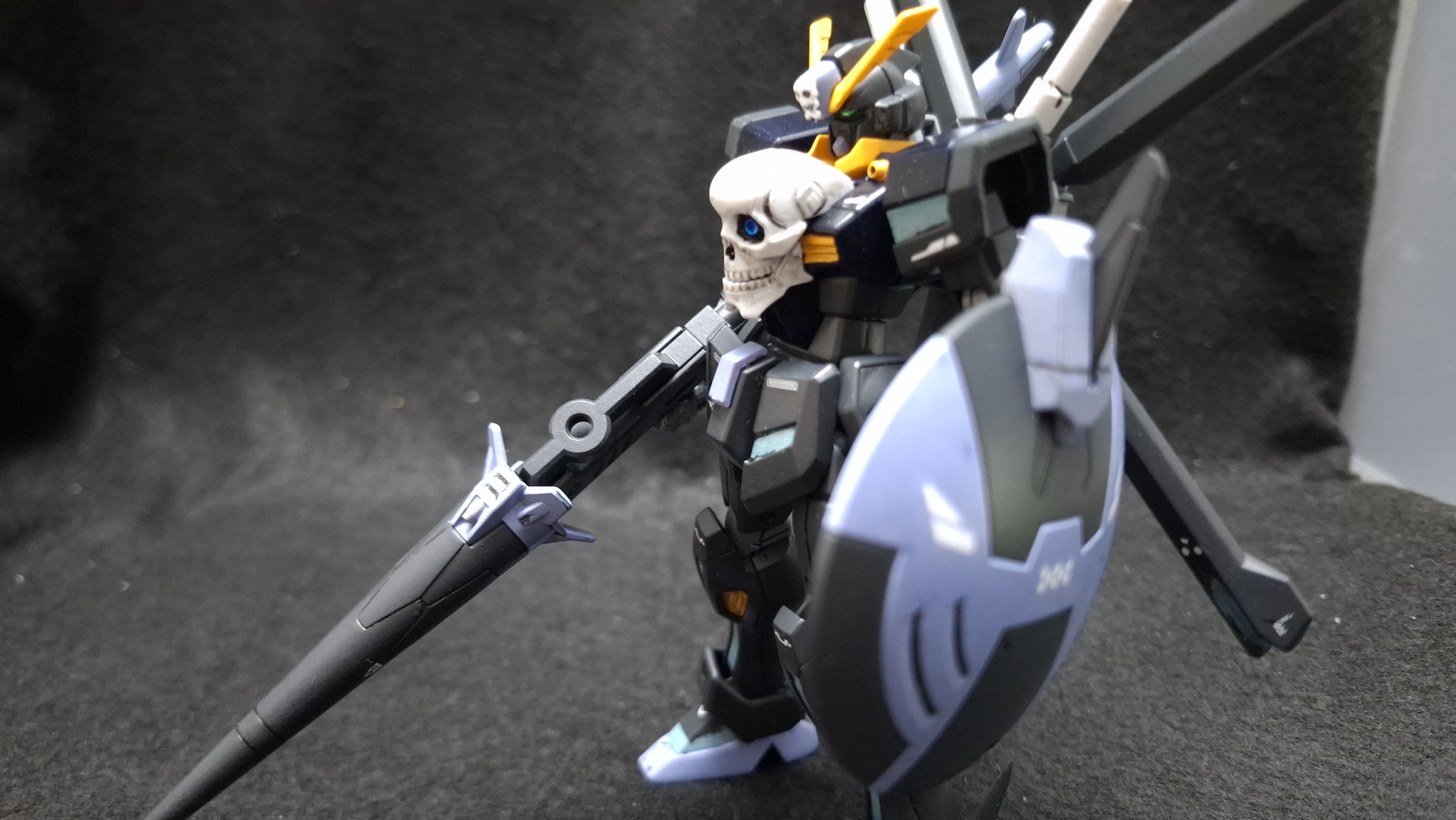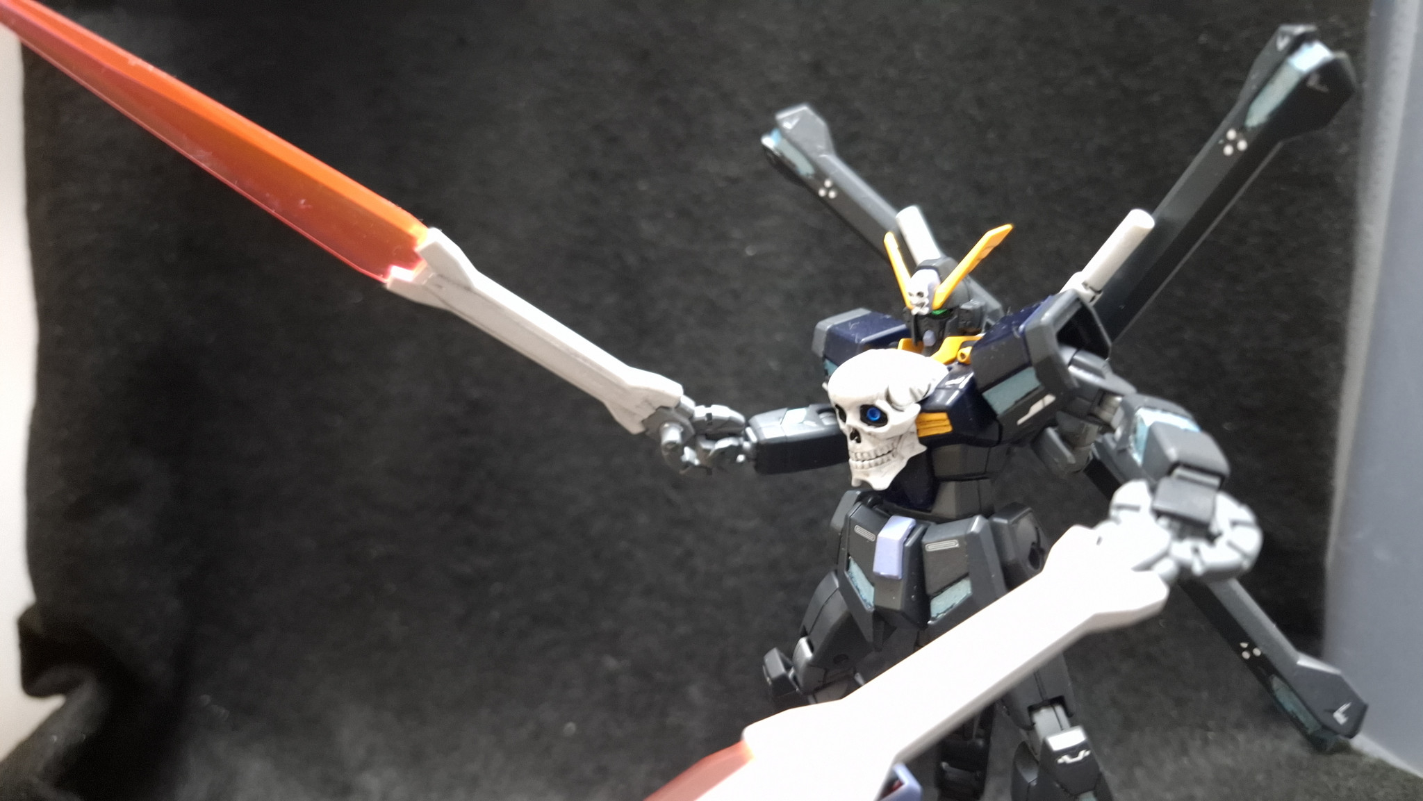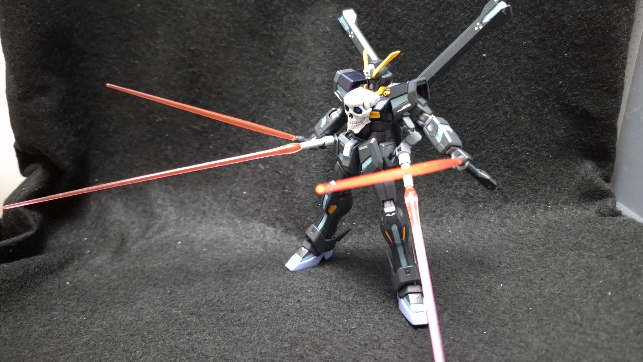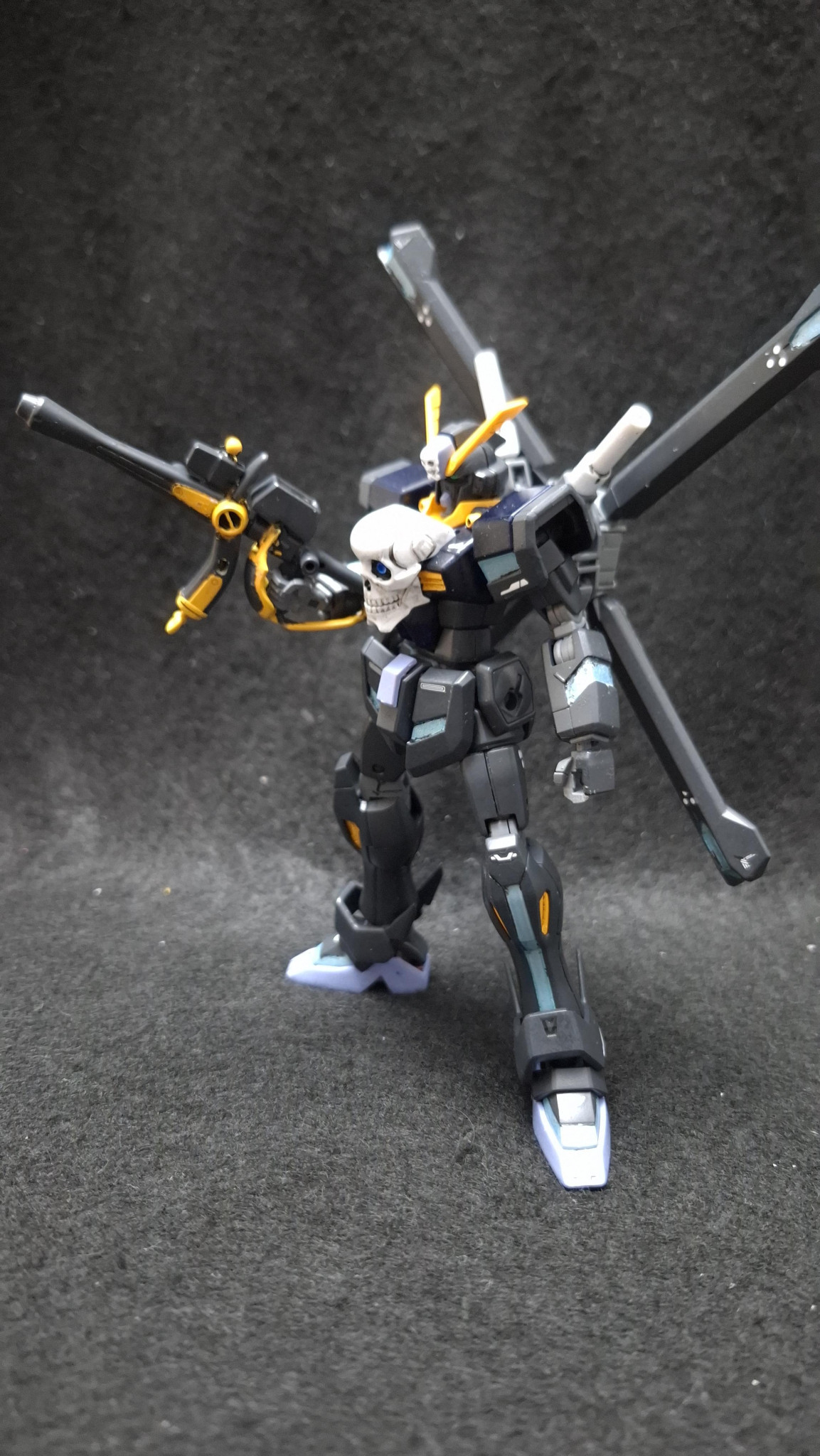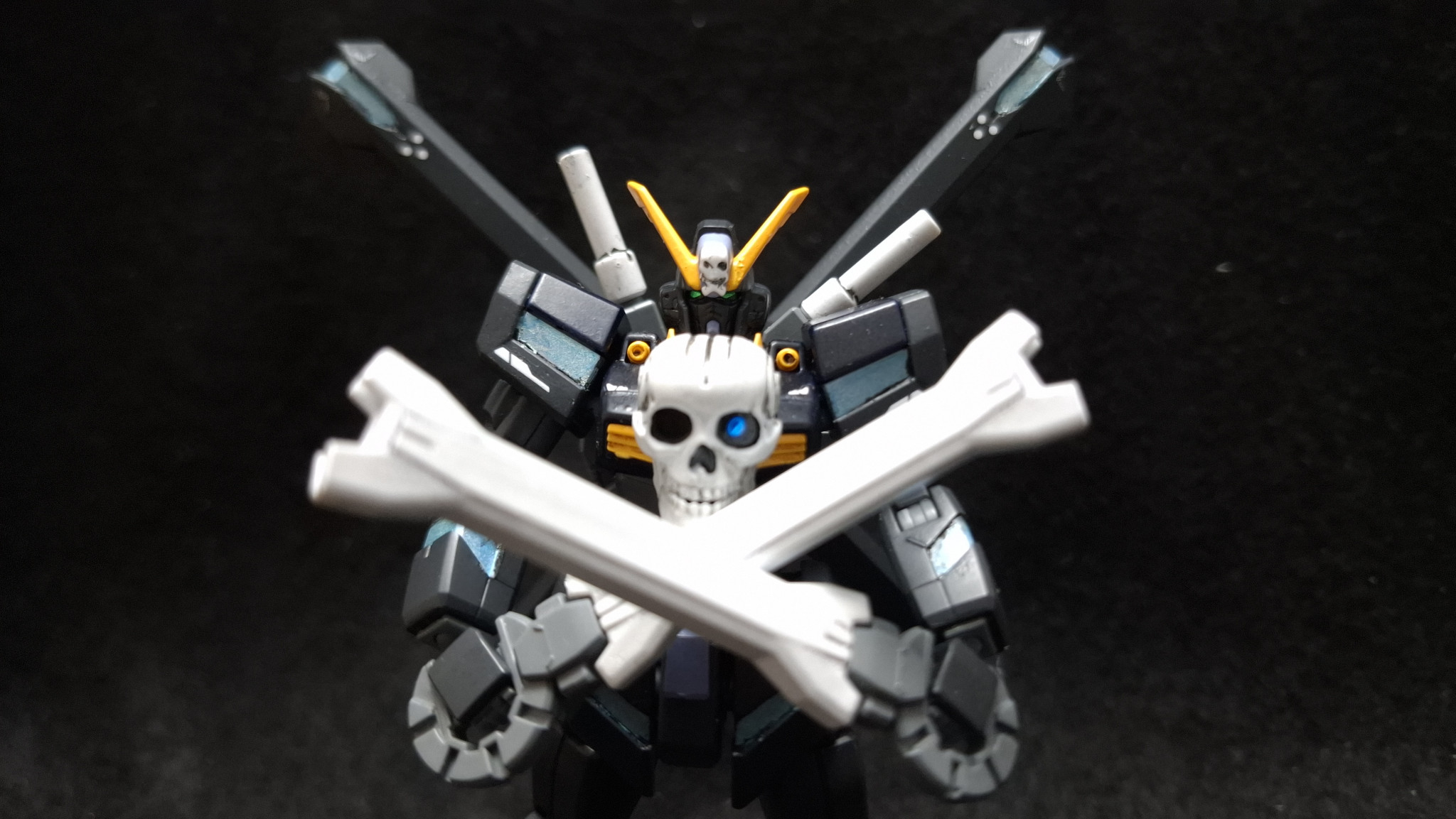 『ガンダムビルドファイターズ』に登場したヤサカ・マオのガンプラ、クロスボーンガンダム魔王。レリーフではなくサテライトキャノンを仕込んだ胸部ドクロやリフレクターミラーユニットを兼ねた背部スラスターなど、ガンダムXとクロスボーンガンダムX1の要素が合わさった強力なガンプラです。安直なんですが頭部をX2改に入れ替えて塗装したらオリジナルになるな、ということで作ってみました。