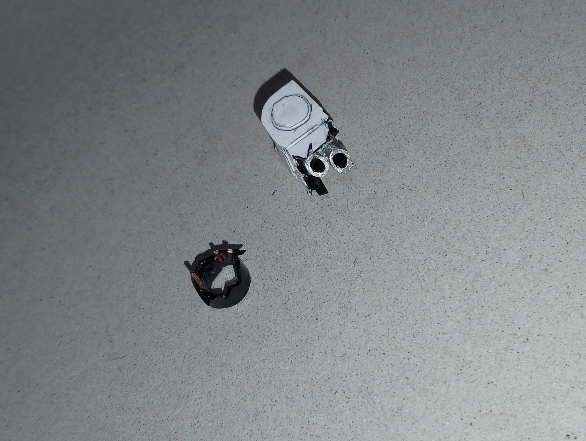 また首の方は、細いプラ板の切りクズを何本か張り付けてカッパー(銅)で塗装し、ちぎれた配線を再現してあります。