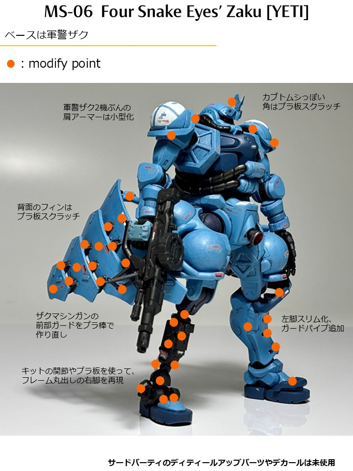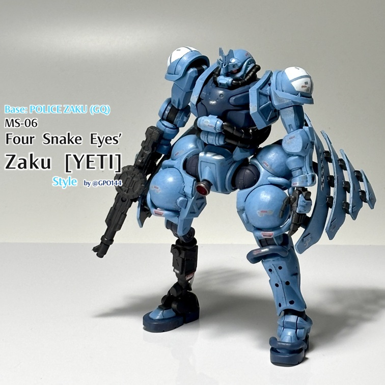 ![「ザク フォースネークアイズ仕様[イエティ]」は、「機動戦士Gundamジークアクス」でジークアクスに搭乗するマチュが初めてクラバ(クランバトル)に参戦した時の相手チームのMSです。チーム「フォースネークアイズ」のザクの特徴は背面の大型のフィン(?)。こちらの[イエティ]は機体色がブルー系、片足がフレーム丸見え、両肩に肩アーマーが装備されていることが特徴ですね。今回も軍警ザクで再現してみました(出張時にガンプラと工具、塗料、プラ板などマテリアルを持参して、宿泊先のホテルで毎晩ちまちまと作りました)。](https://gumpla.jp/wp-content/uploads/2025/12/MS06-ZakuYetiGQ-251228-03.jpg)