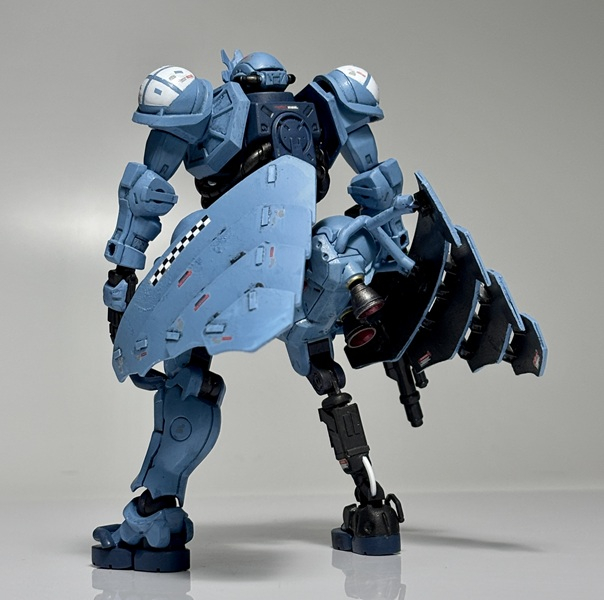 他の軍警ザクの余剰パーツを使って、両肩とも肩アーマー付きに。横や下部分をカットして形状変更、コンパクト化。