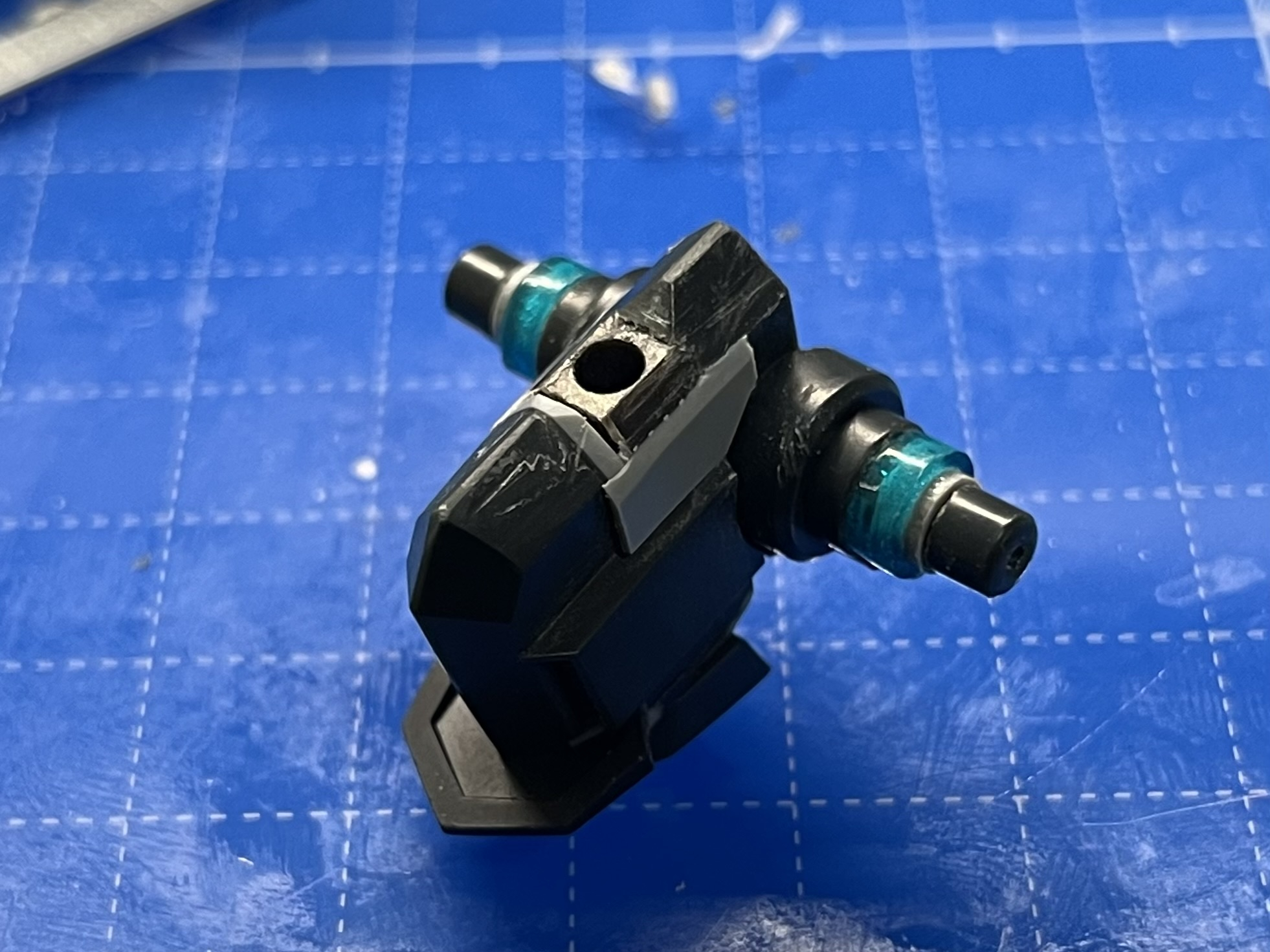 元のGNフラッグはアクションベース取り付け用の穴が背中にあるので、股関節をなんか色々やって股関節に取り付けられるように改造しています。ちなみに塗装の関係で分解もできるようにしています。