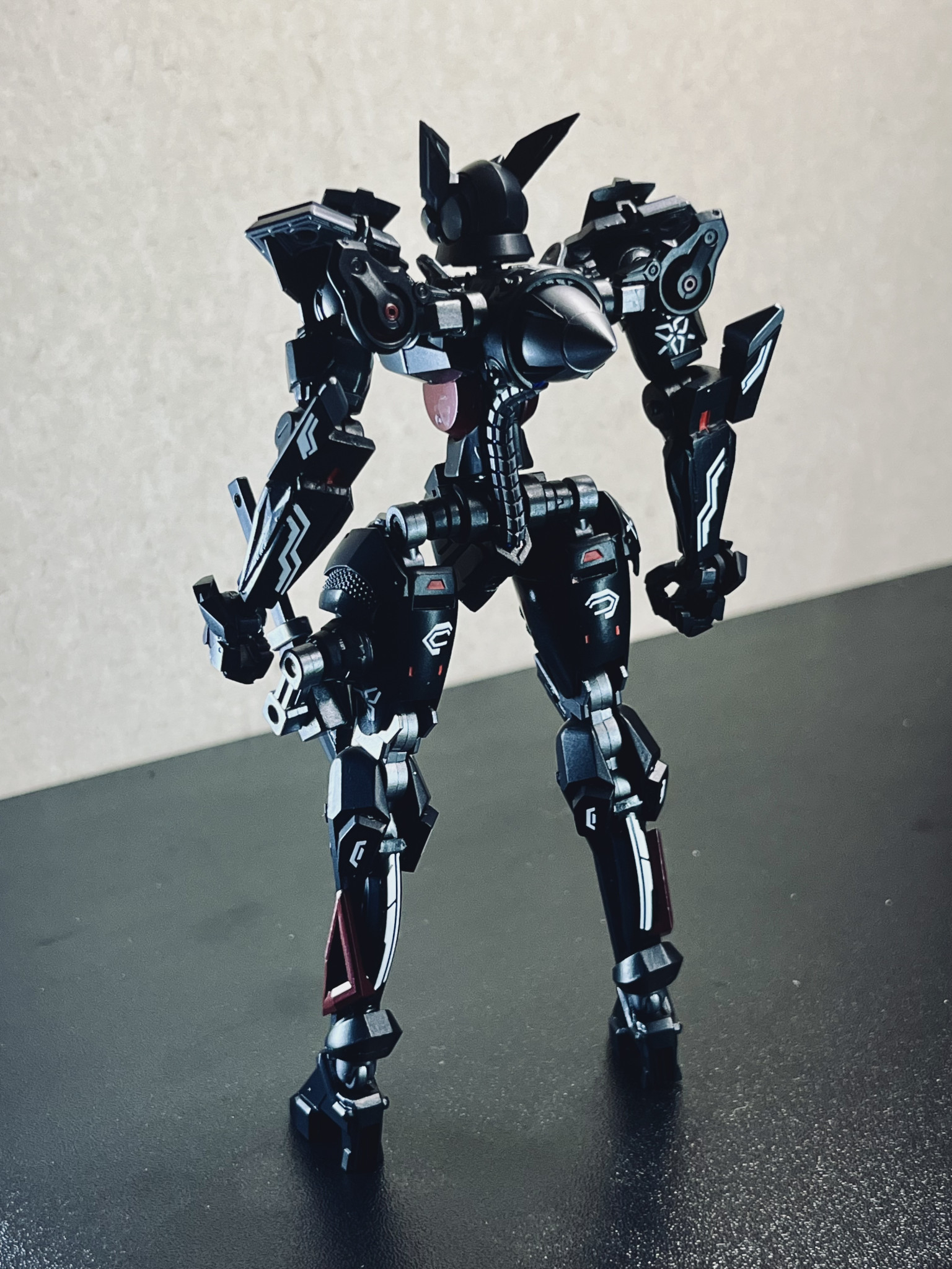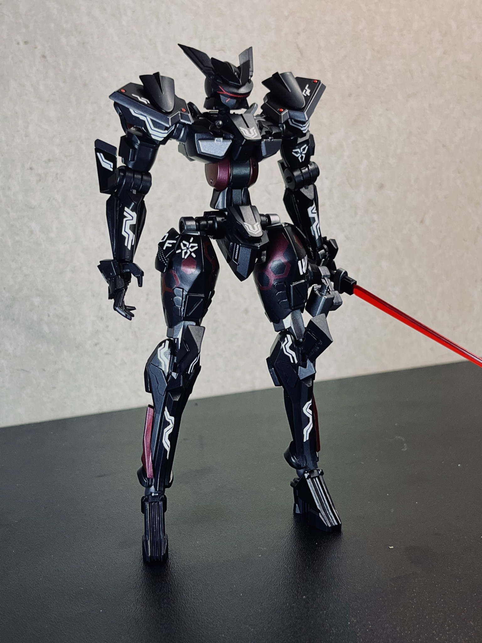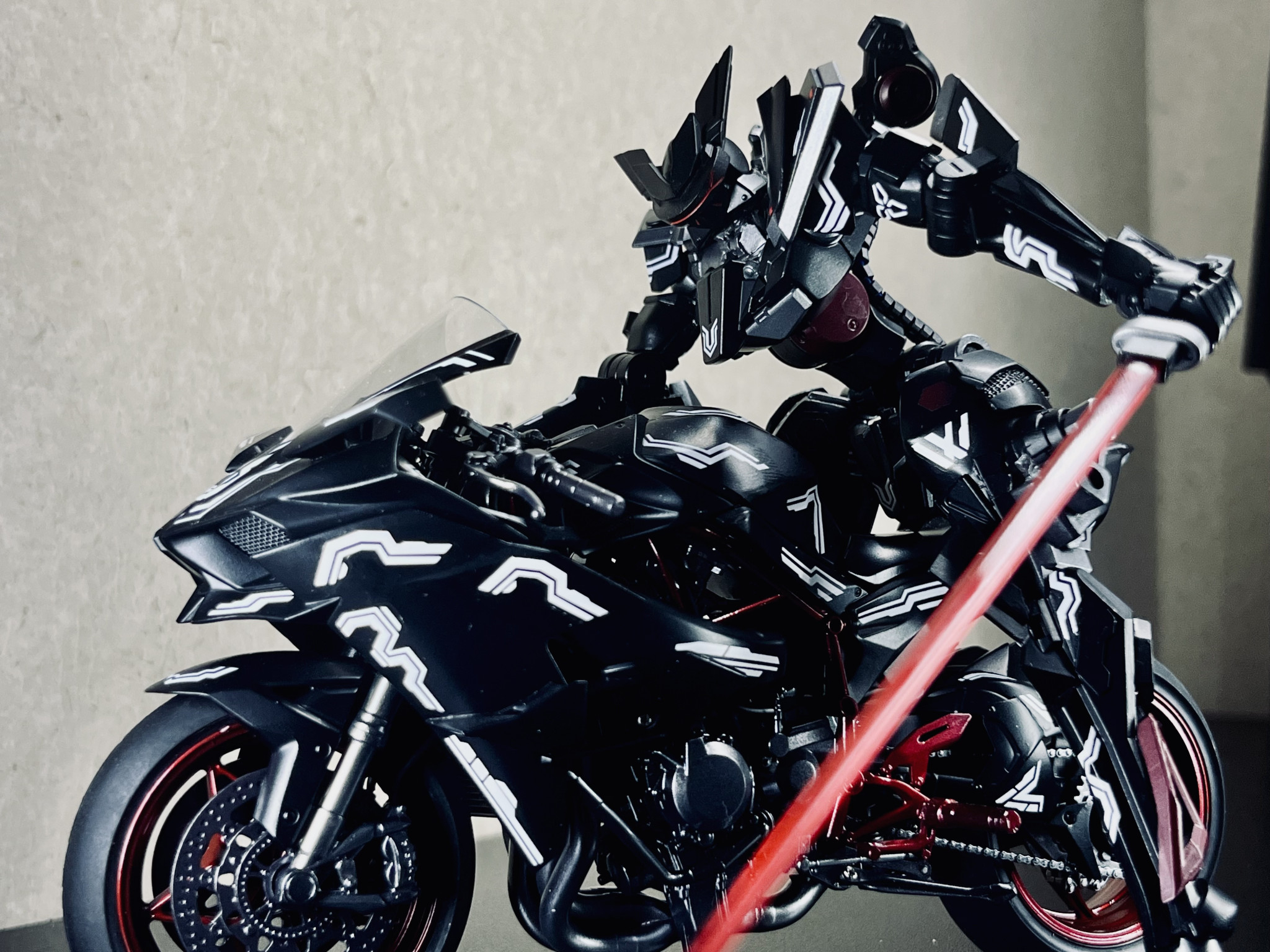 以前この機体用のサポートメカとして作ったNINJA H2Rと並べるとこんな感じ。やっぱりカラーリングやデカールを統一することで実際には異なるサイズ・世界観でも”そういうもの”というなんとなく説得力のある感じになるような気がします(あくまでも個人の意見です)。