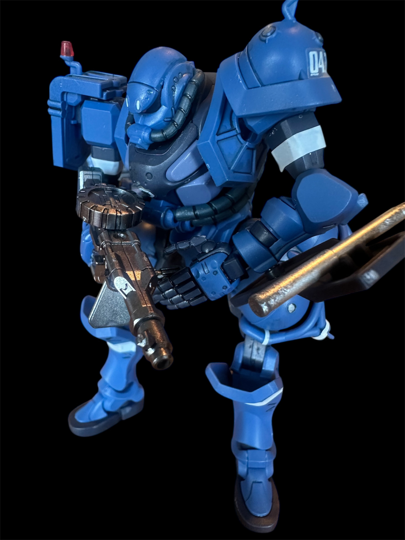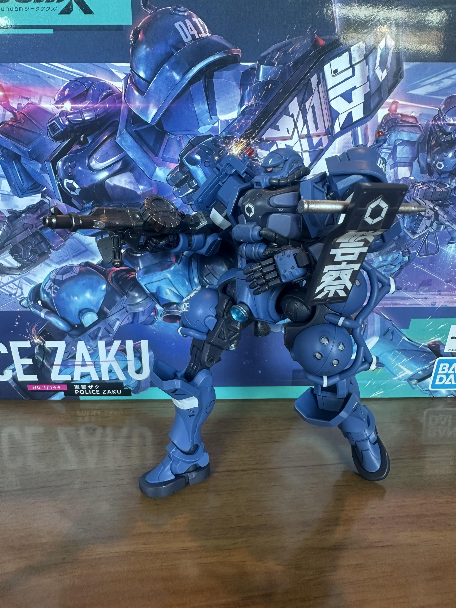 HG軍警ザクを作りました。今までにない変わった形で楽しかったです。成形色だけでとても美しいので墨入れ、部分塗装と艶消しトップコートのみで仕上げました。