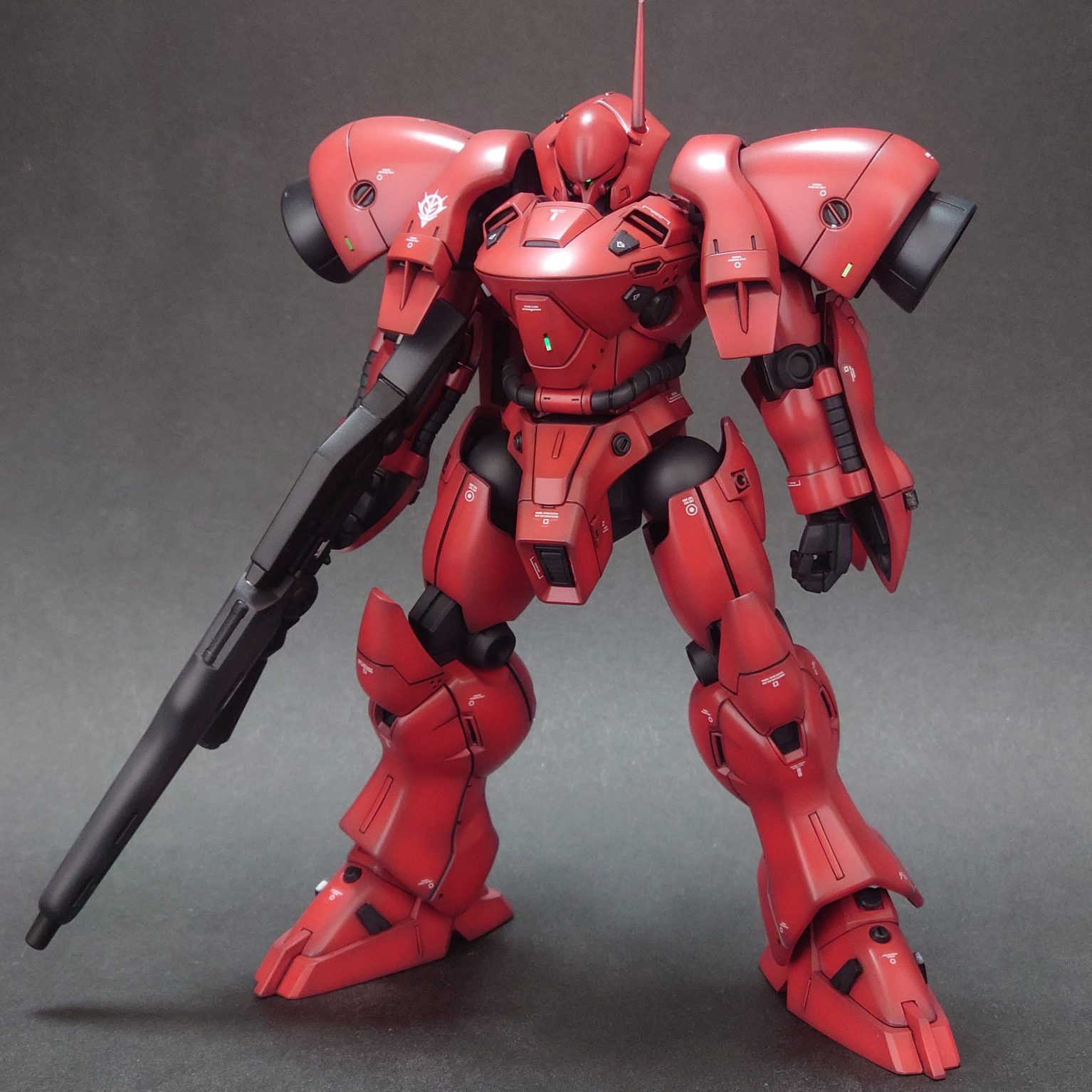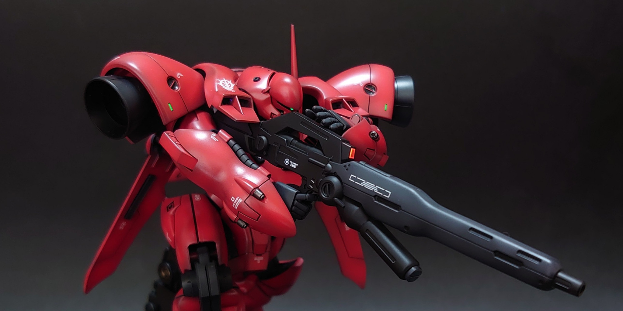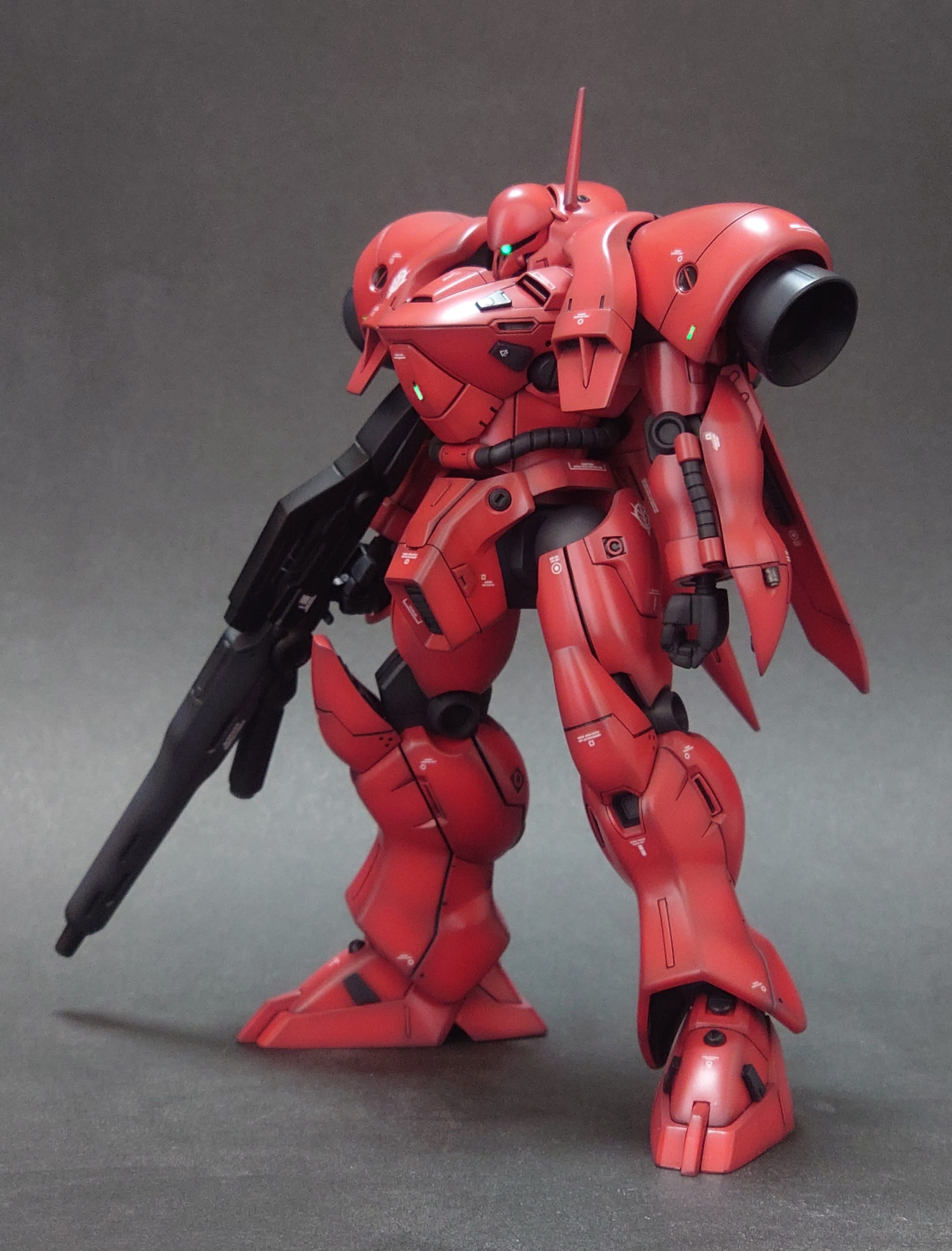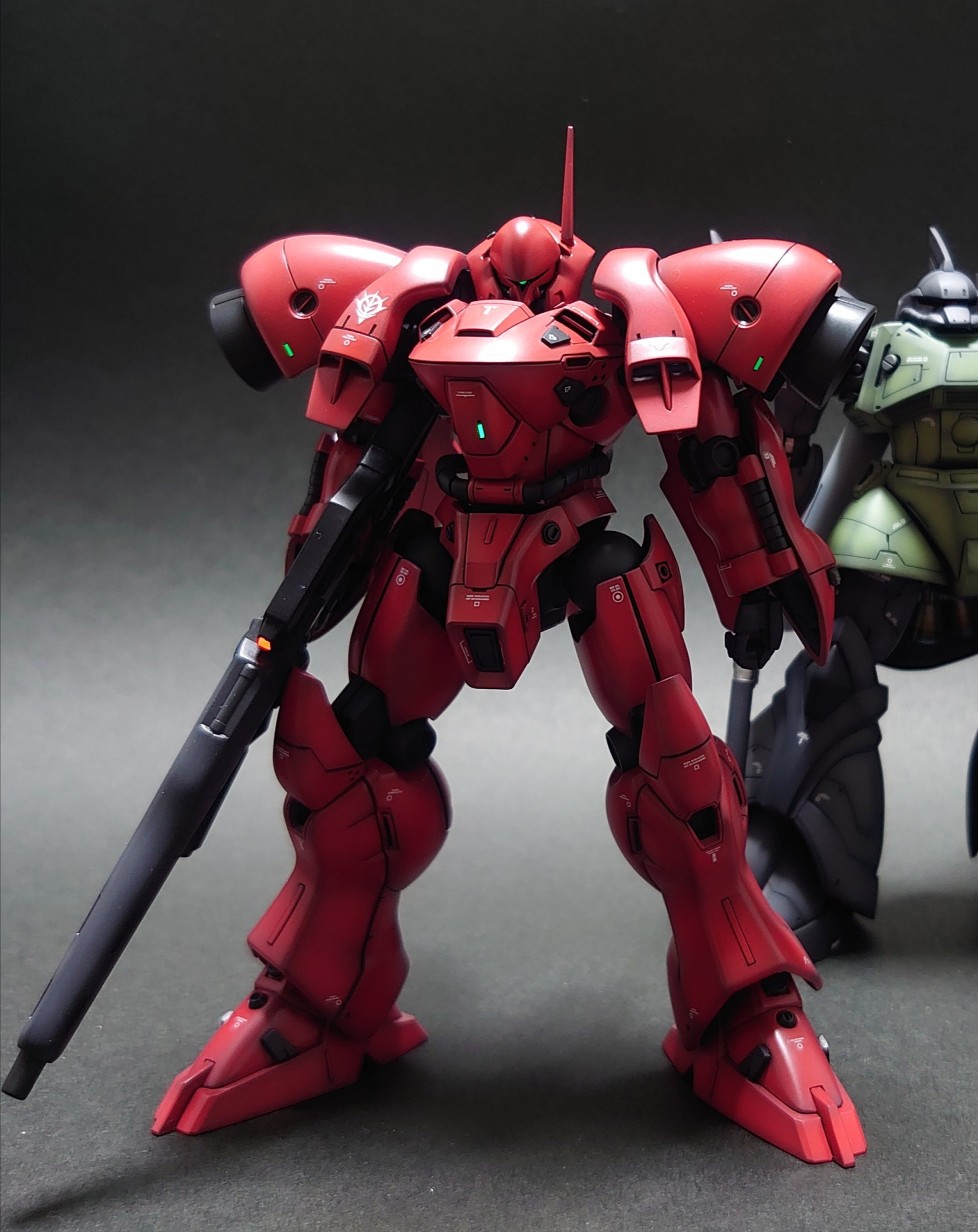 ジオン系はおおいにあるあるですが、目の部分を細めにする事で、ちょっと間の抜けた感じから、キリッと凛々しくするだけで引き締まったと思います。