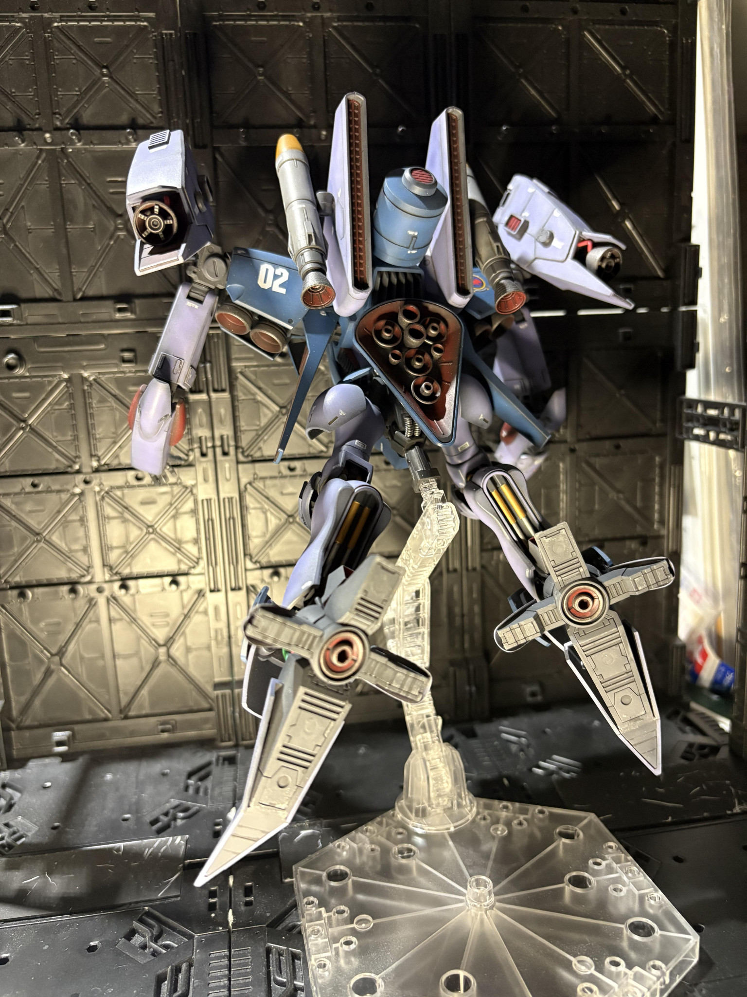 地上では足がデカく見えるが、飛行モードでは足首が伸び、足裏のスラスターが有効活用できる。アンバック機構と相待って、小回りのきく機動性に寄与という設定ですー😁