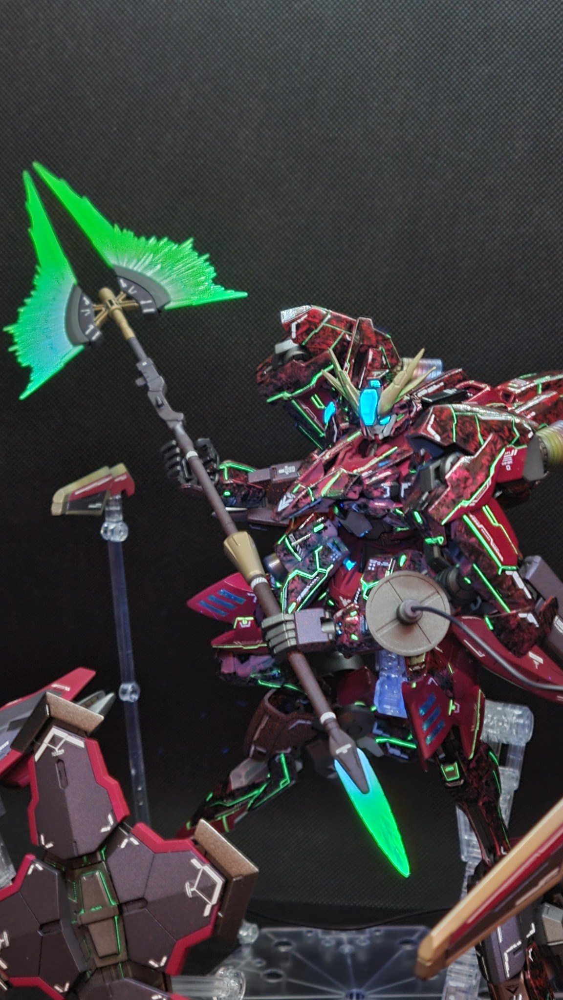 通常時は魔法使いの杖のようなイメージで、ビーム刃を発振するとハルバートに見えるように、出力最大状態は両方からド派手に吹き出して強そう笑