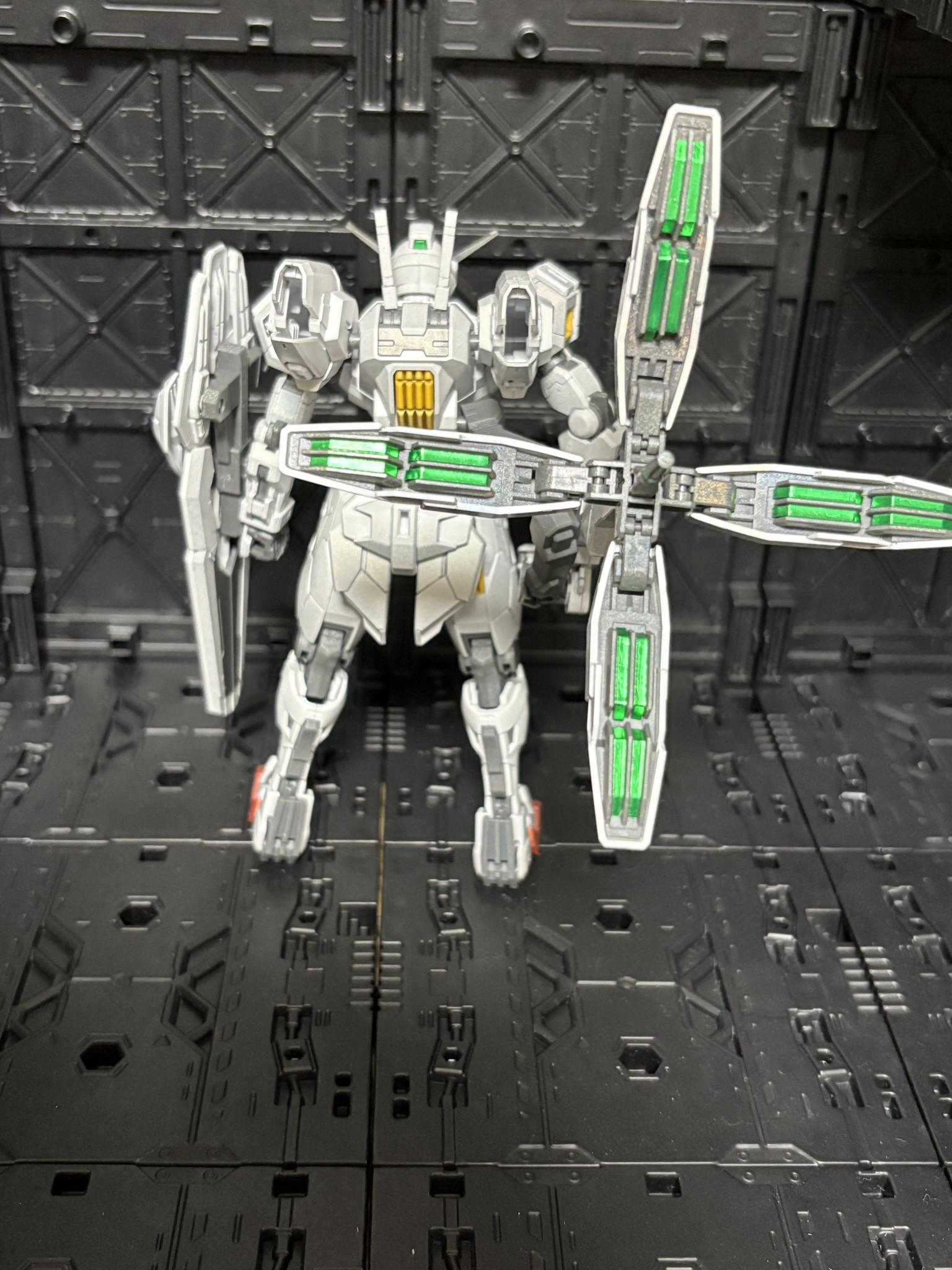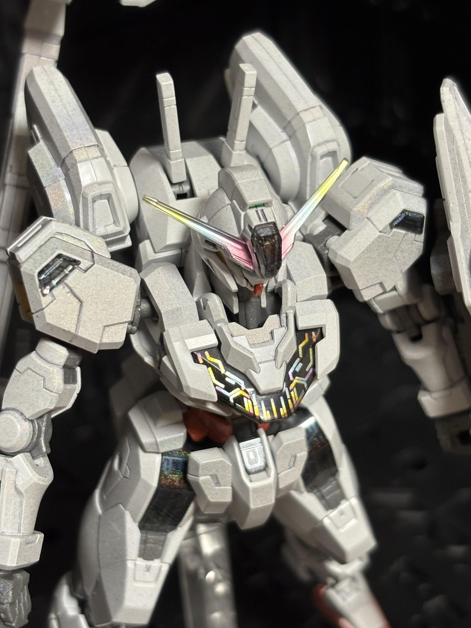 虹色のホログラム綺麗です✨✨✨白パーツのザラザラした感じの塗装で、リアル感がありますね😆シールドのグレー部分も虹色がキラリと良い感じですね😊来年もガンプラ制作頑張りましょう😁