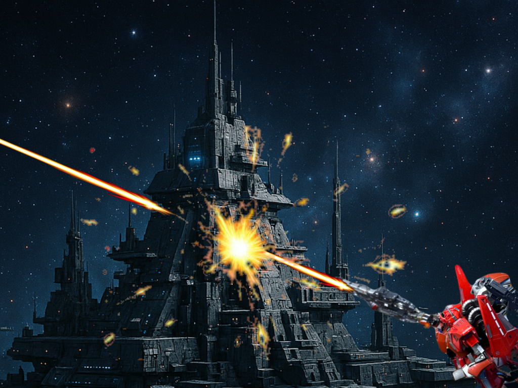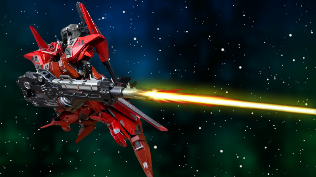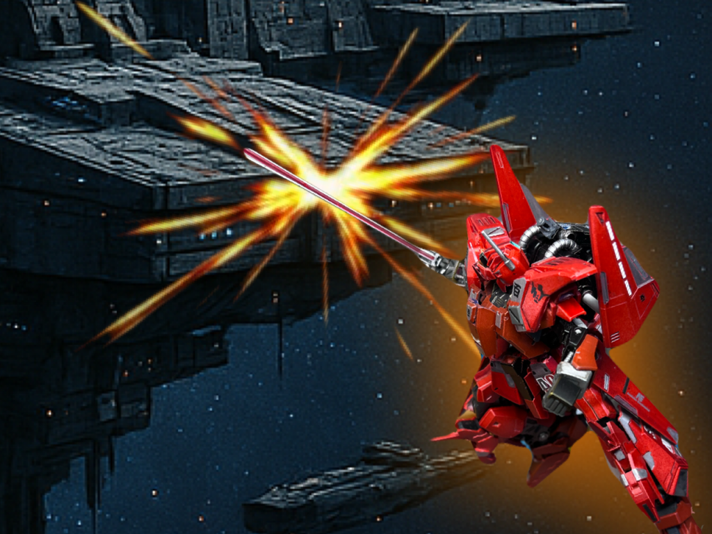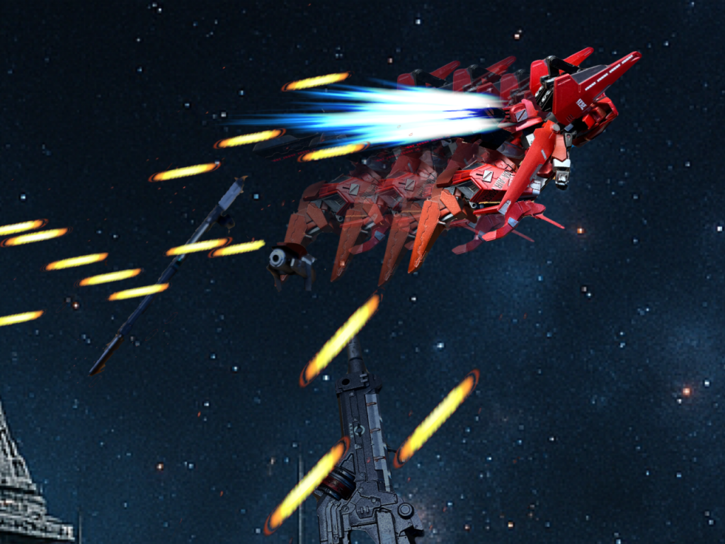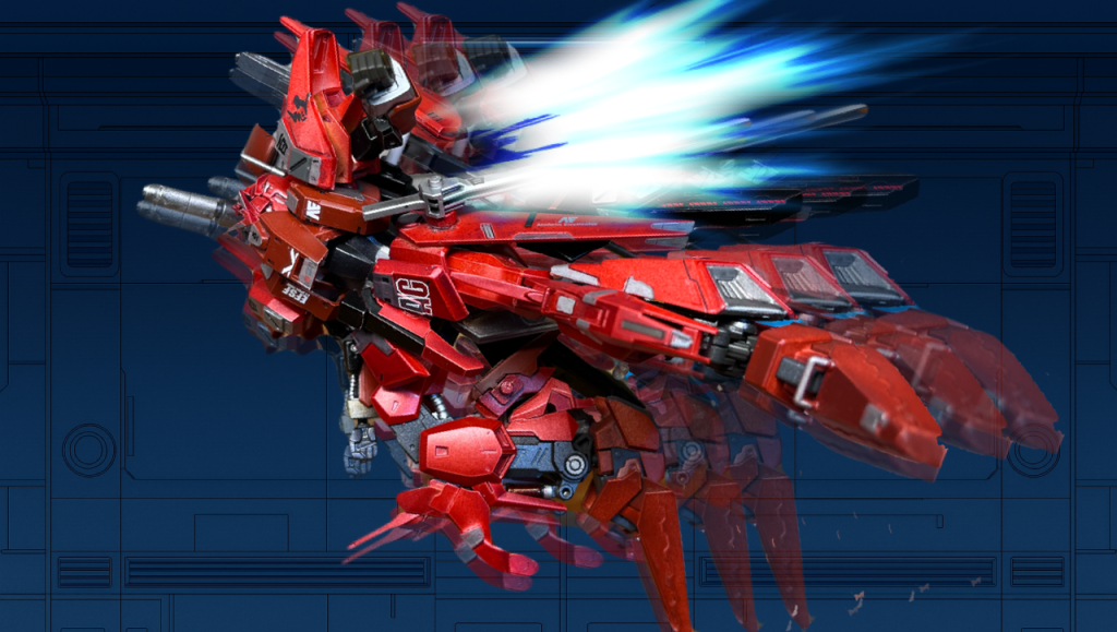 アキラは背面の遠距離武装2丁をパージし、それらをおとりにした。リミッターを解除し、赤い光の筋を描き、敵の攻撃を軽々とかわし、