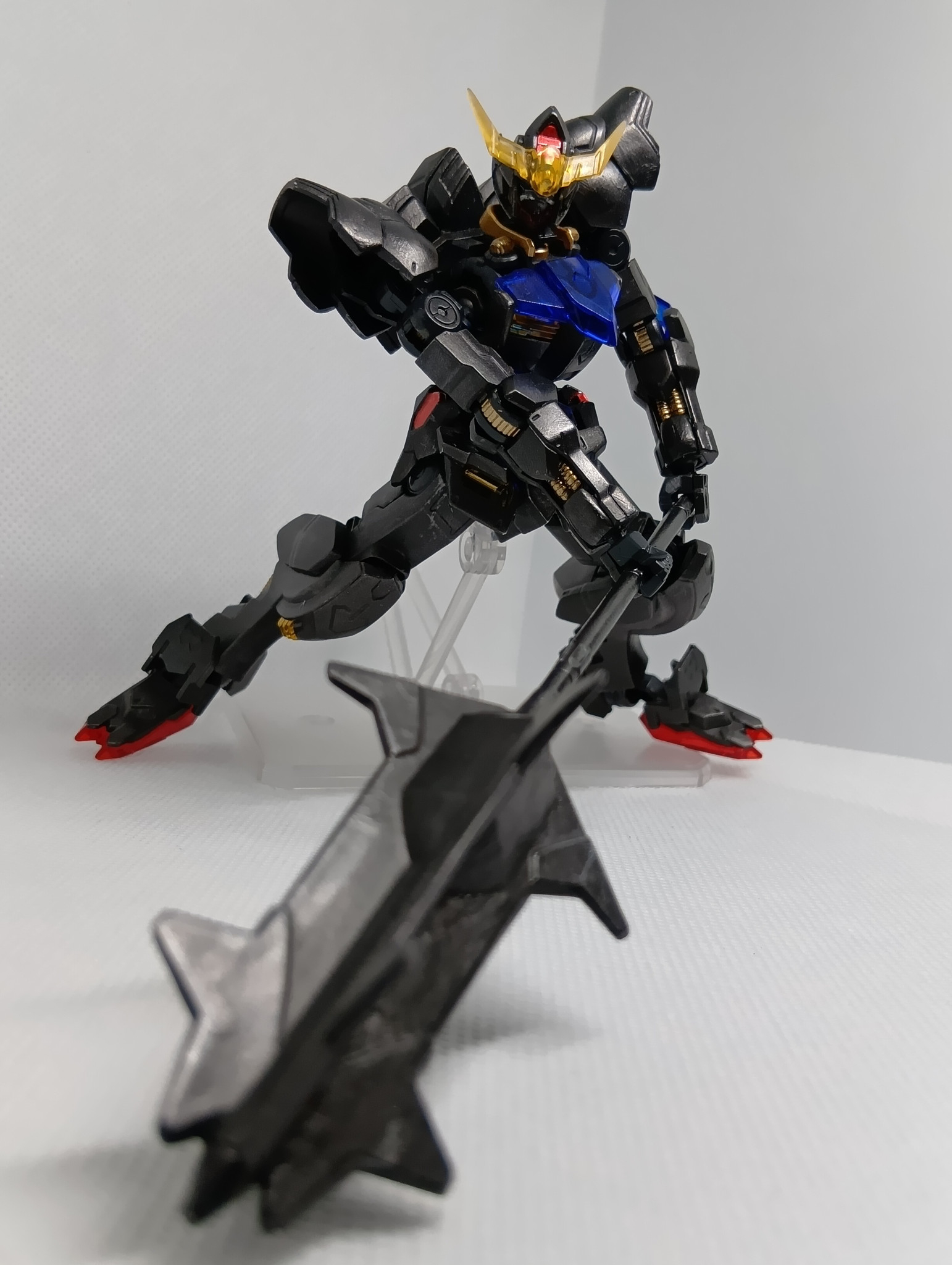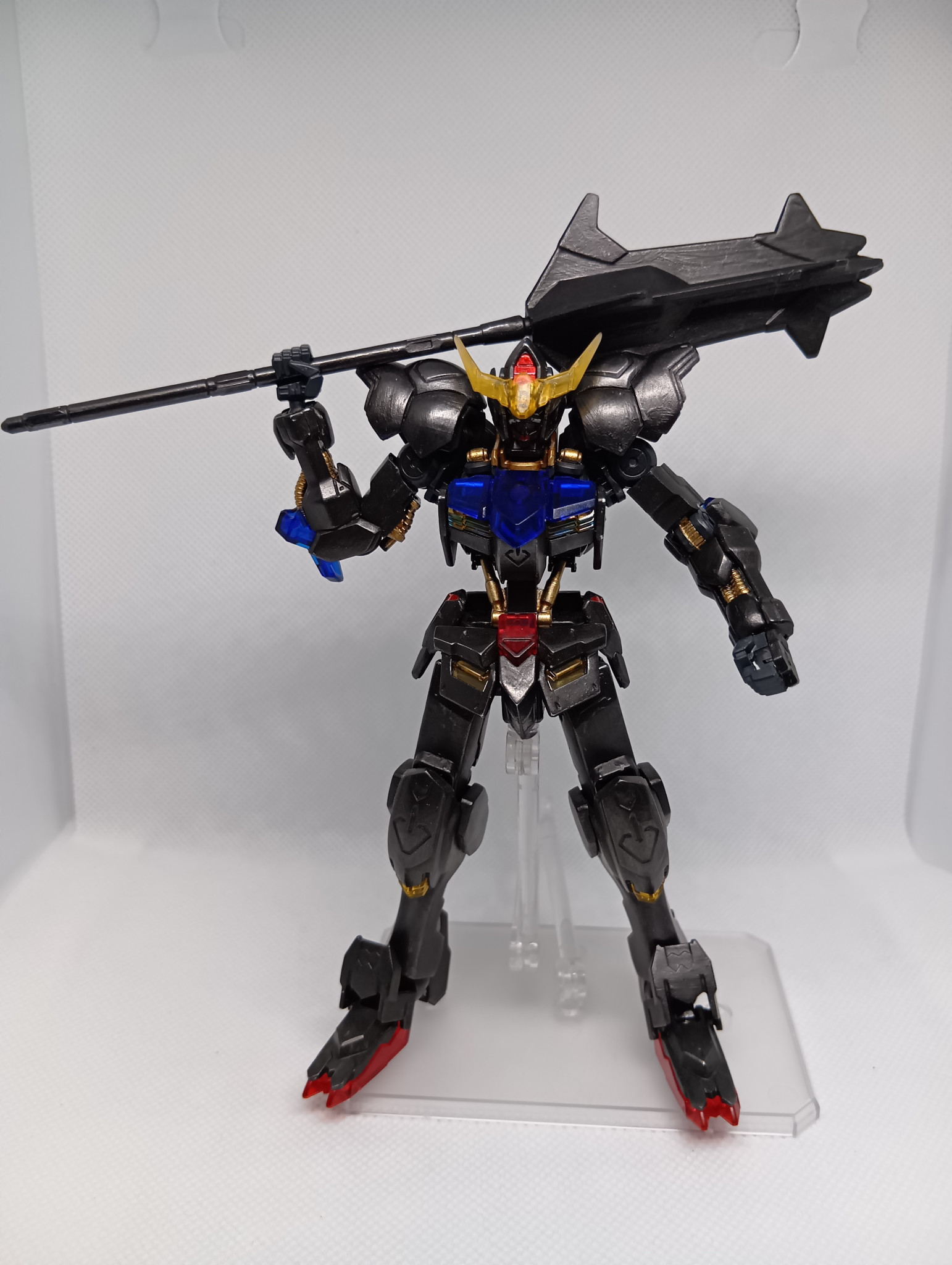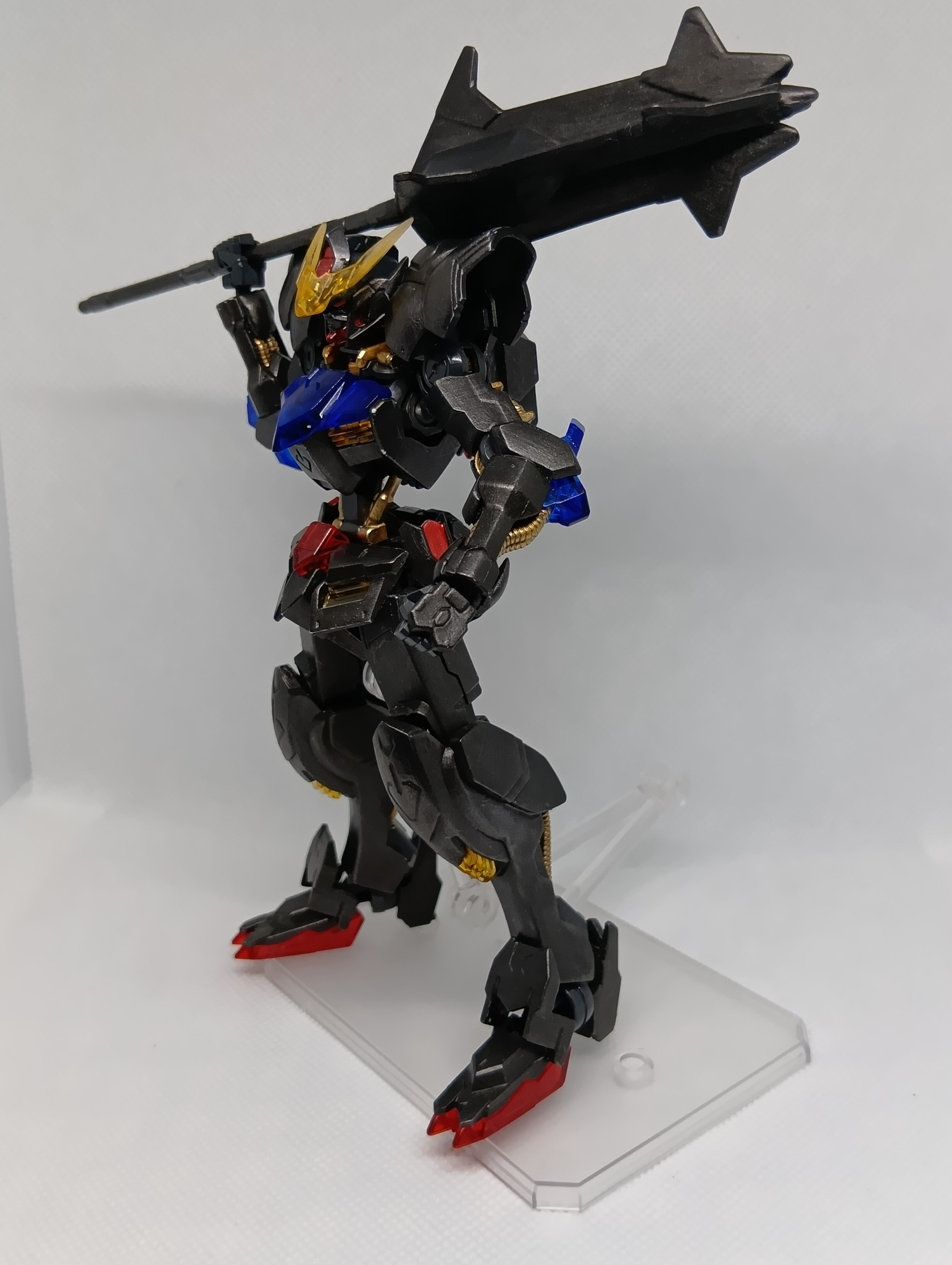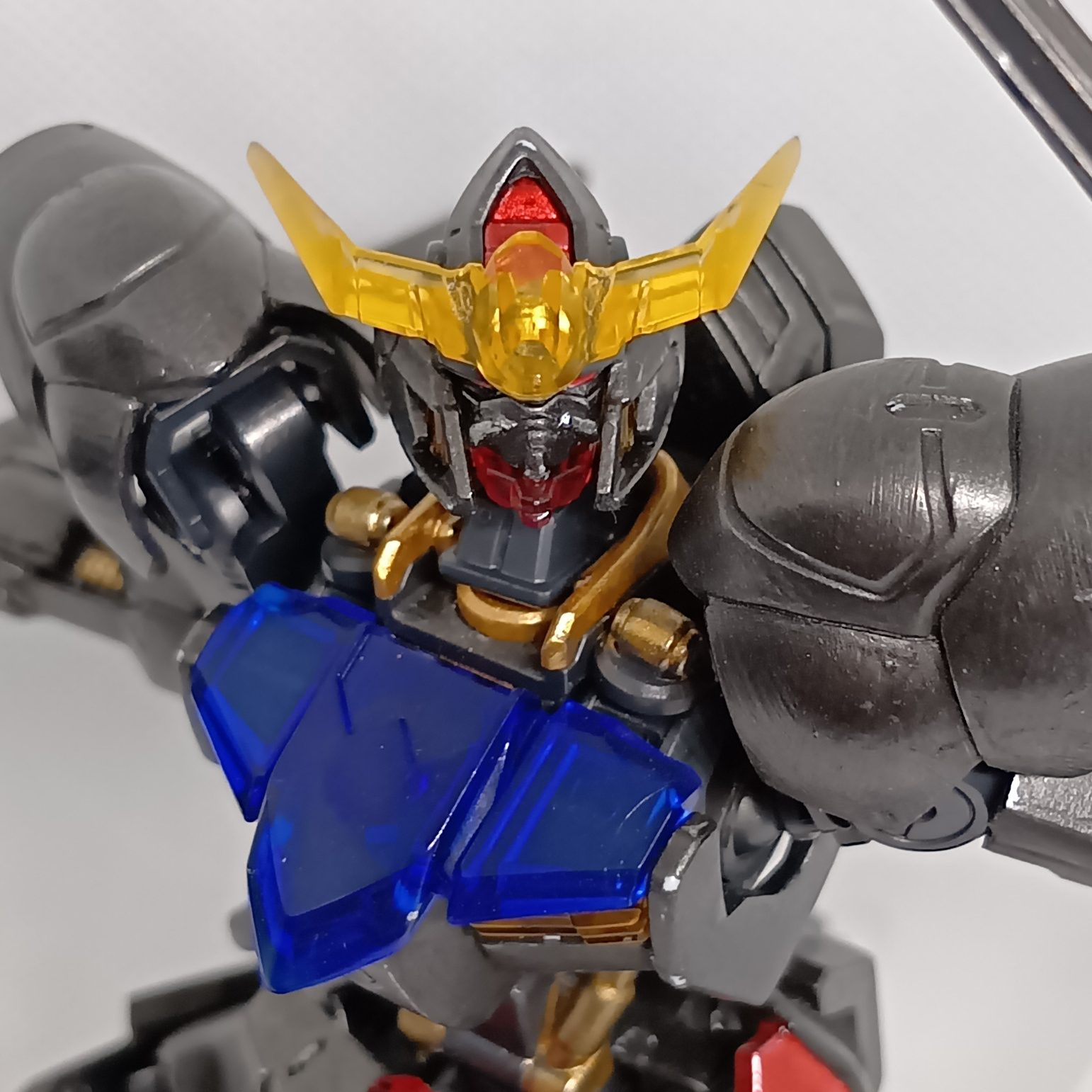 題名通りの黒歴史で、肩のモールドを埋めたのみで無改造、クリアーパーツは無塗装、白のみアイアンペイント黒皮色で塗り、フレームはティターンズブルー、ゴールドを部分塗装し、目や一部装甲をレッドのキャンディ塗装?を全部筆塗りしてます