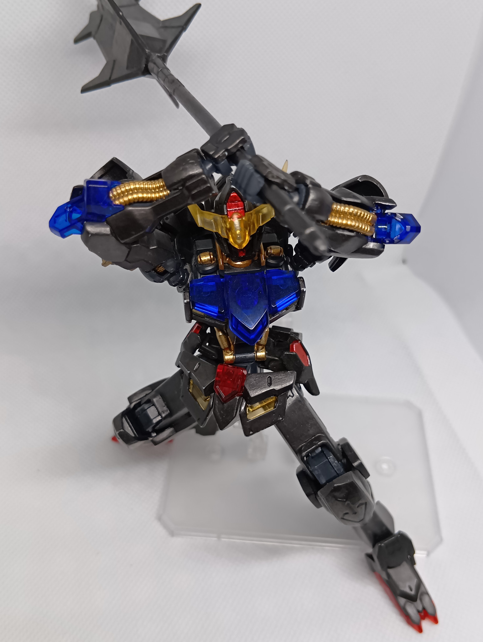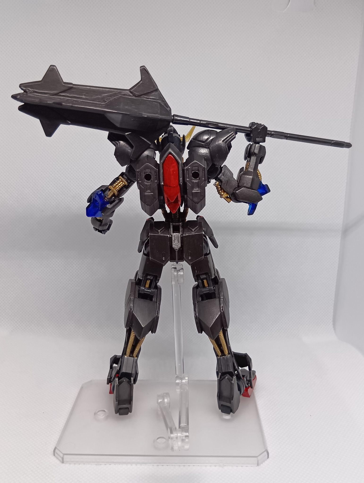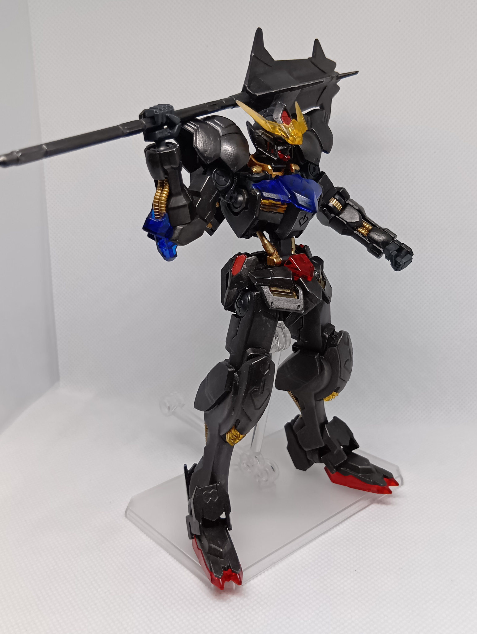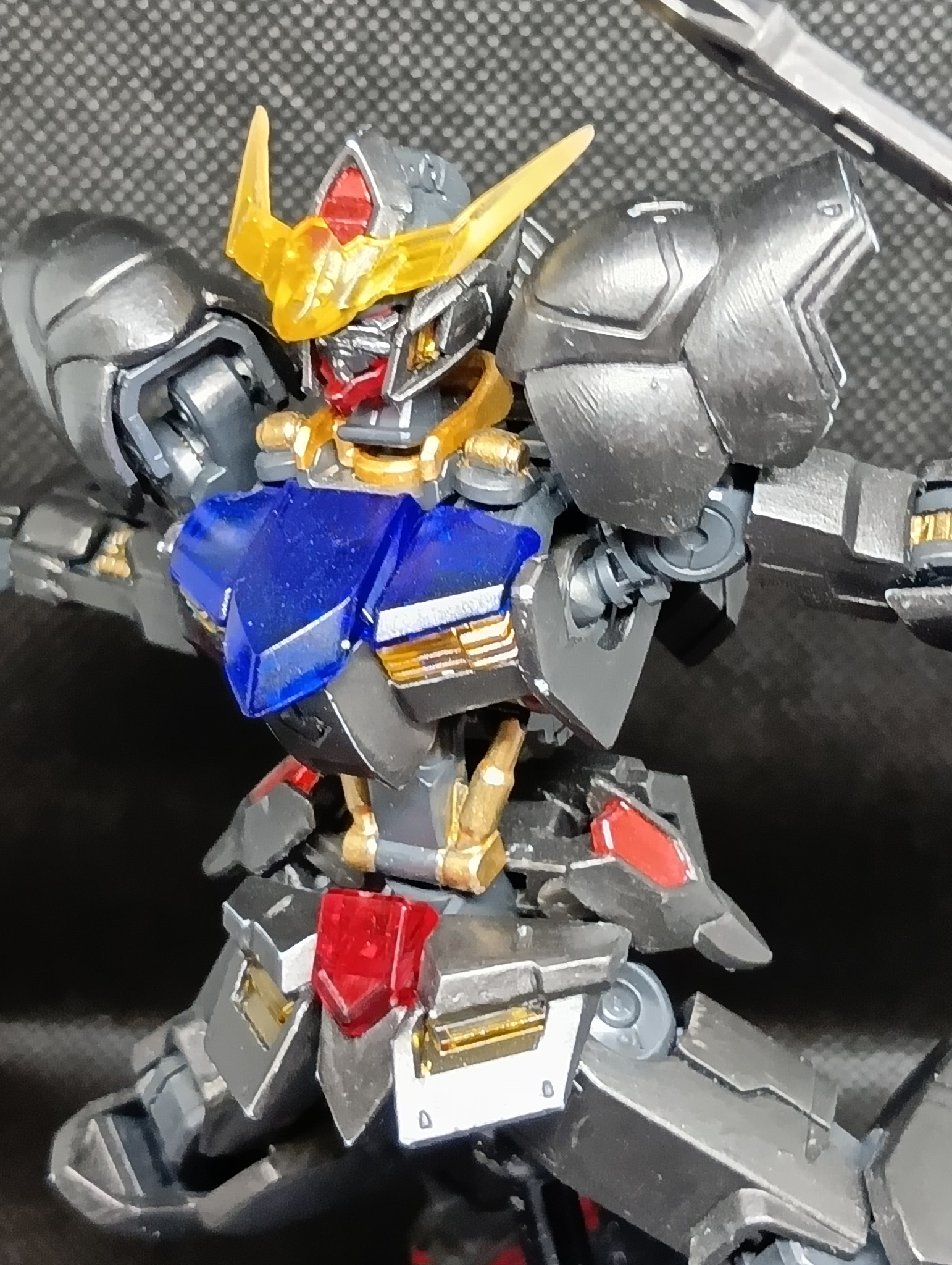 題名通りの黒歴史で、肩のモールドを埋めたのみで無改造、クリアーパーツは無塗装、白のみアイアンペイント黒皮色で塗り、フレームはティターンズブルー、ゴールドを部分塗装し、目や一部装甲をレッドのキャンディ塗装?を全部筆塗りしてます