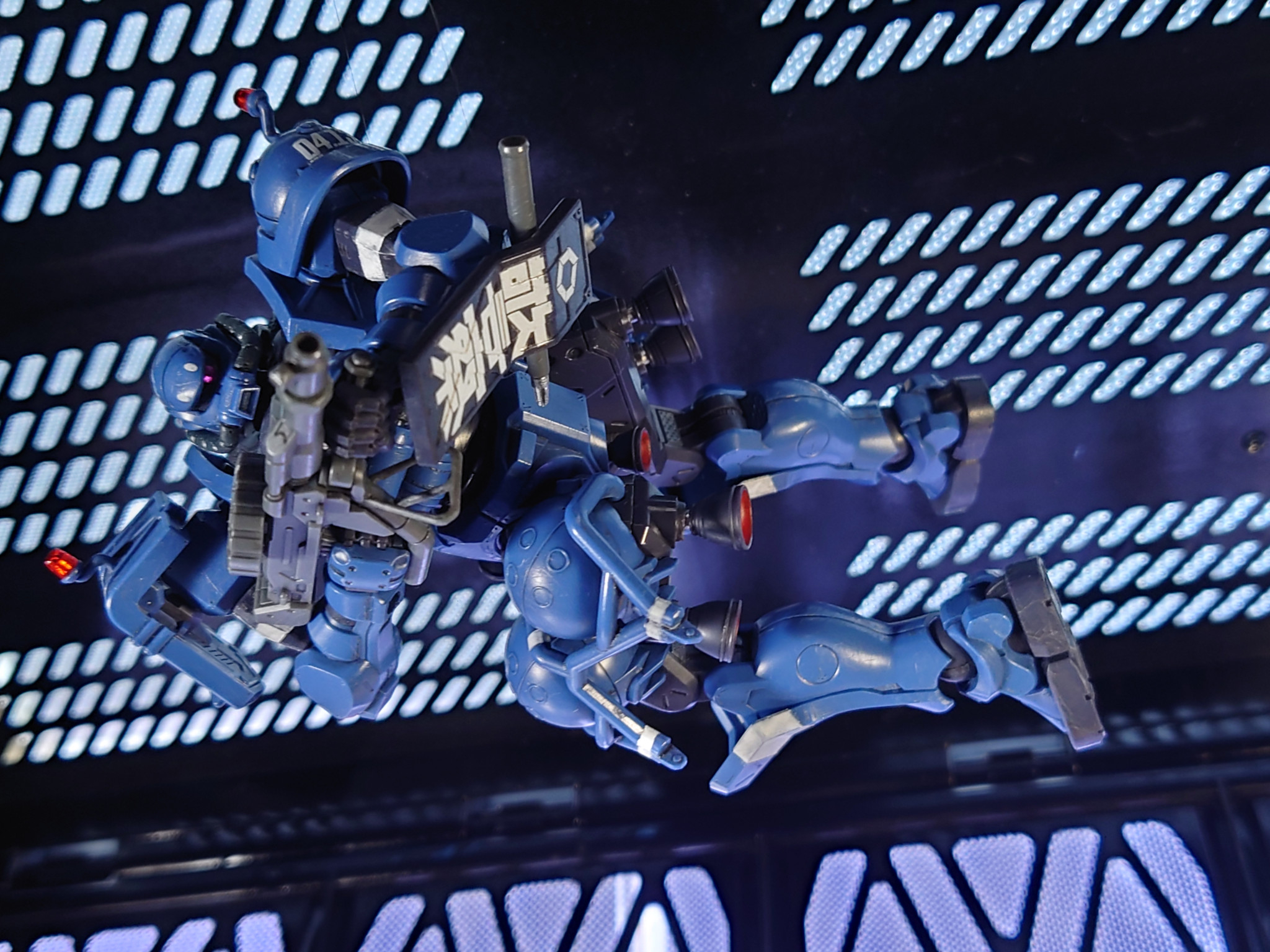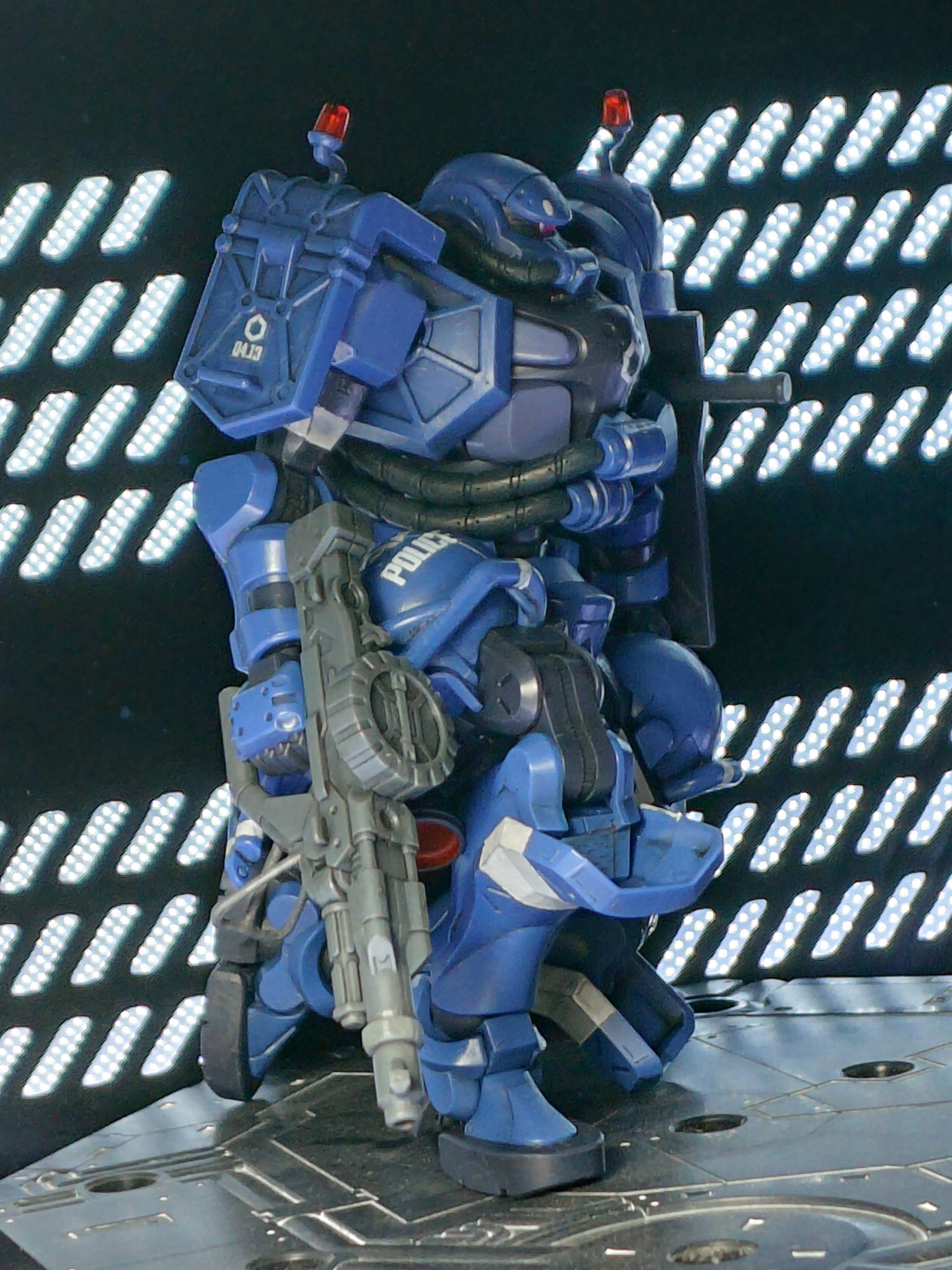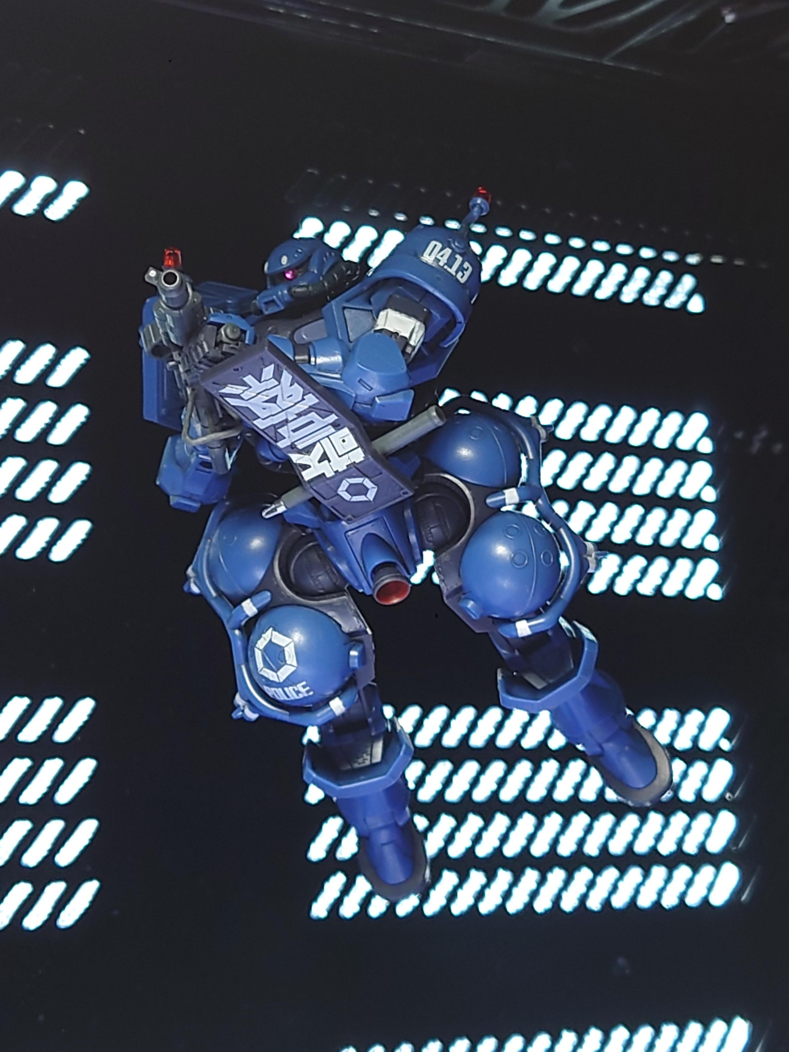細部にディティール追加、ハッチ開閉化、成形色活かしの簡略仕上げ。シールは文字番号マークを使用して、ラインは筆塗りです。かっこいい軍警ザク、観てくださいな〜