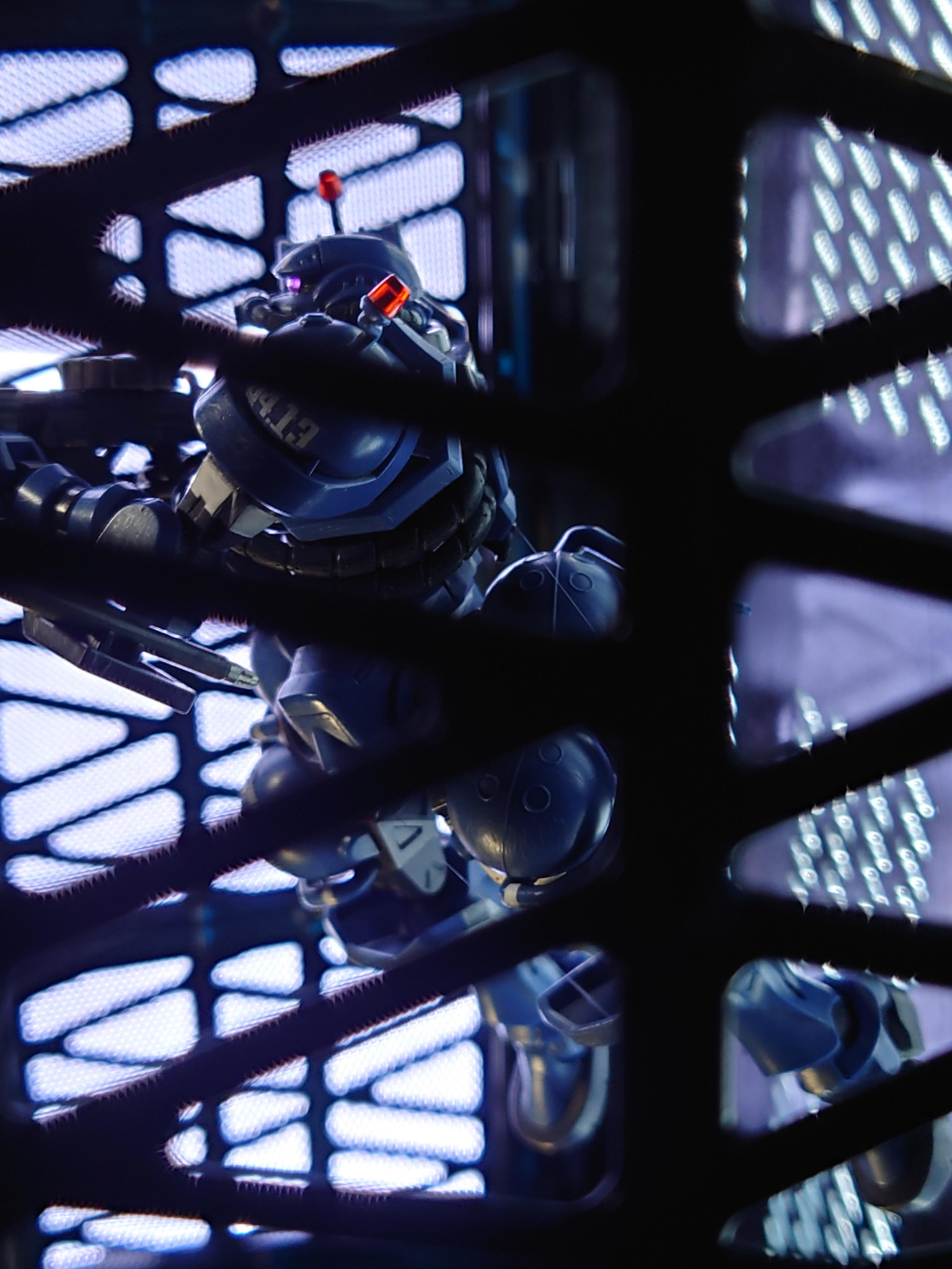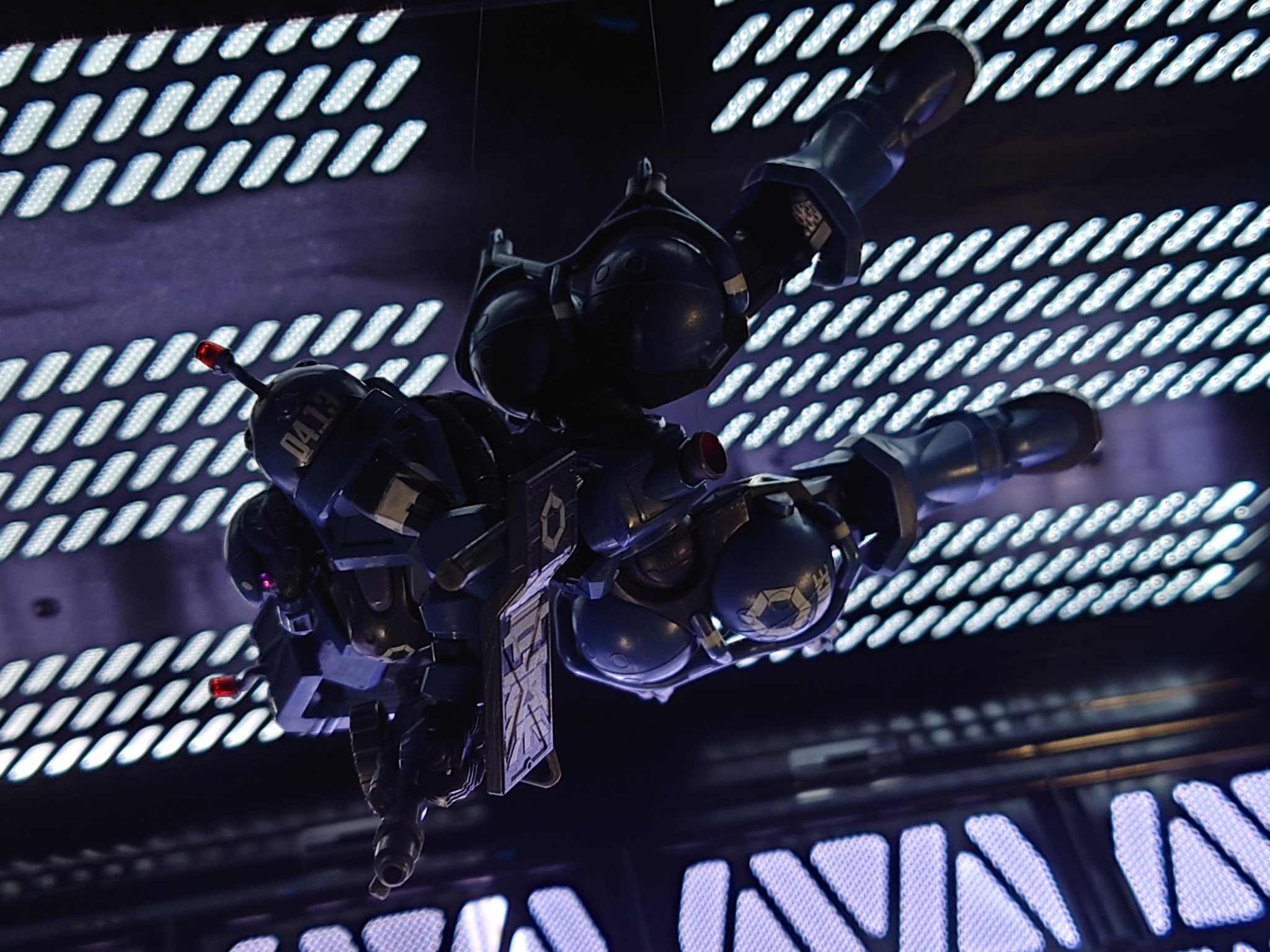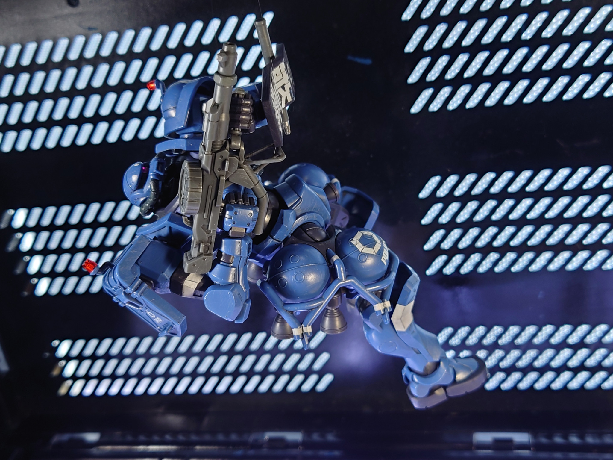 細部にディティール追加、ハッチ開閉化、成形色活かしの簡略仕上げ。シールは文字番号マークを使用して、ラインは筆塗りです。かっこいい軍警ザク、観てくださいな〜