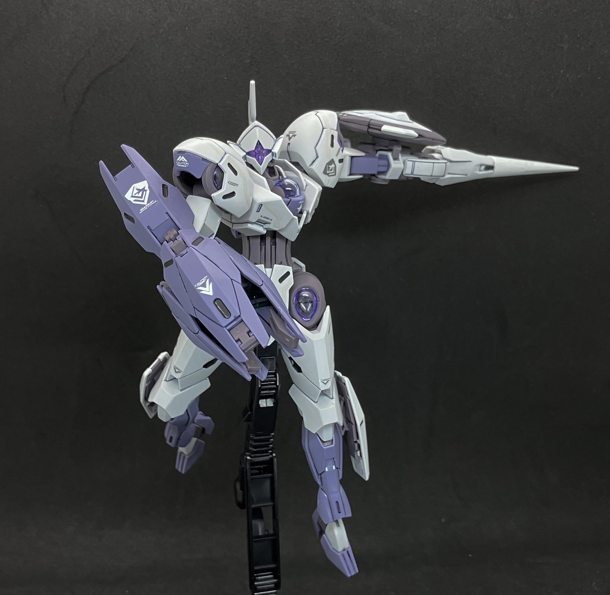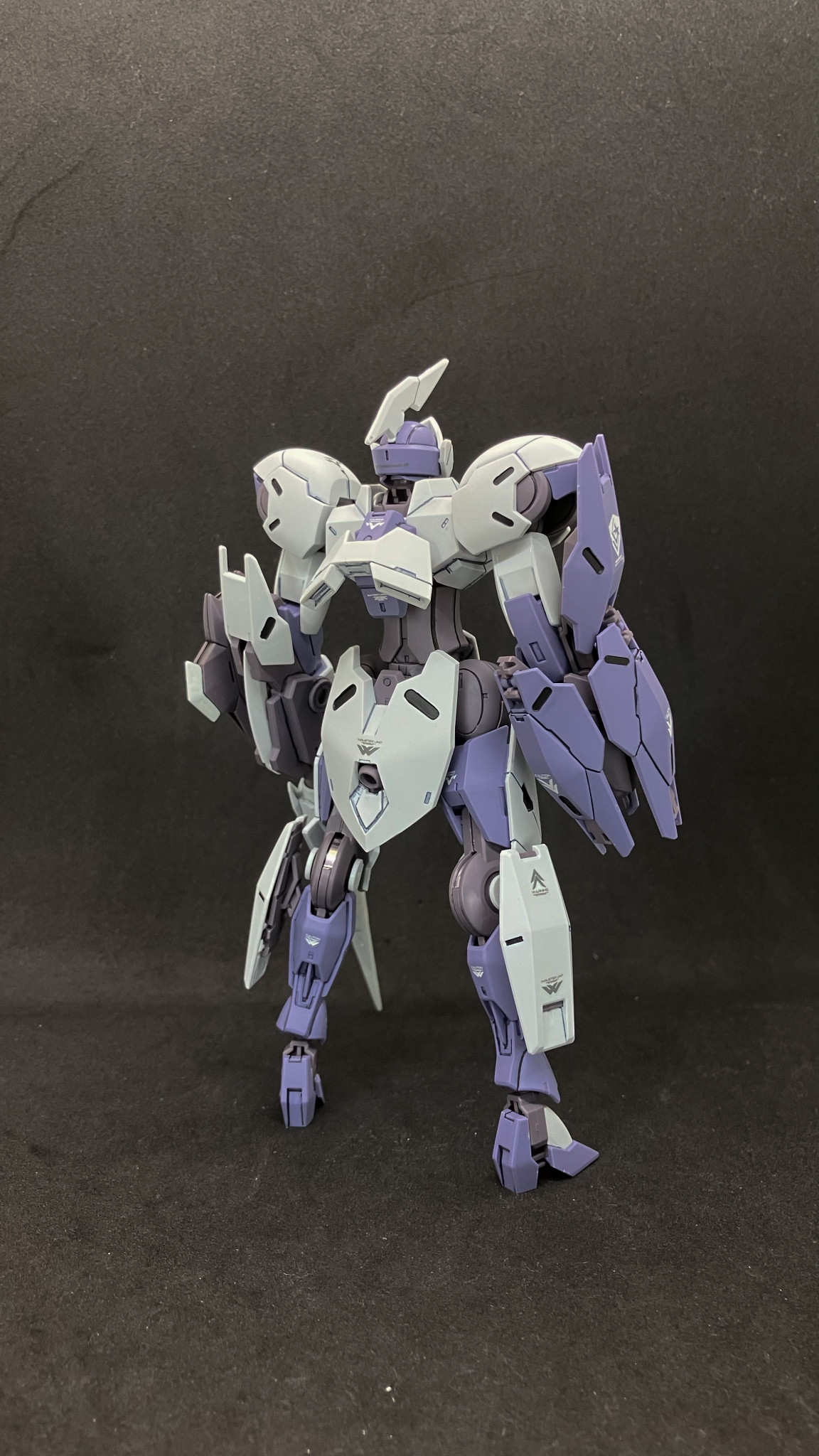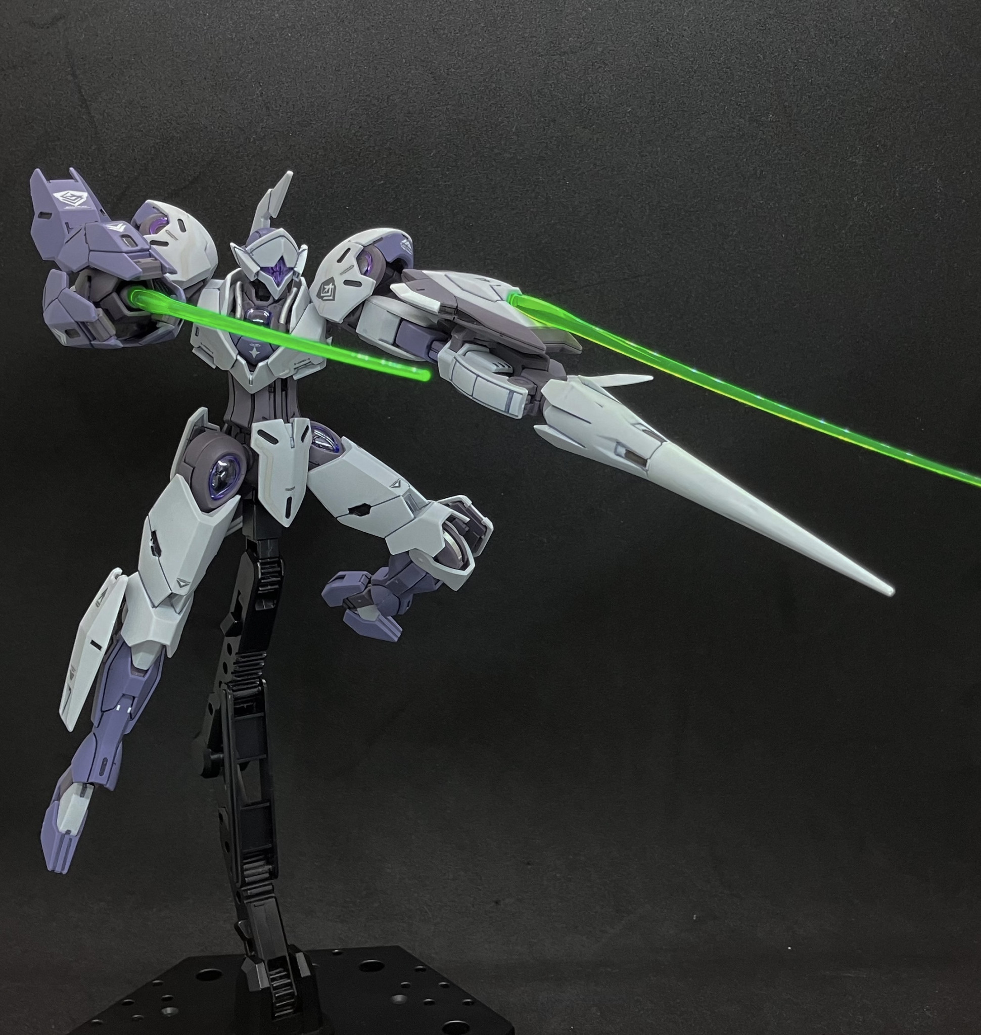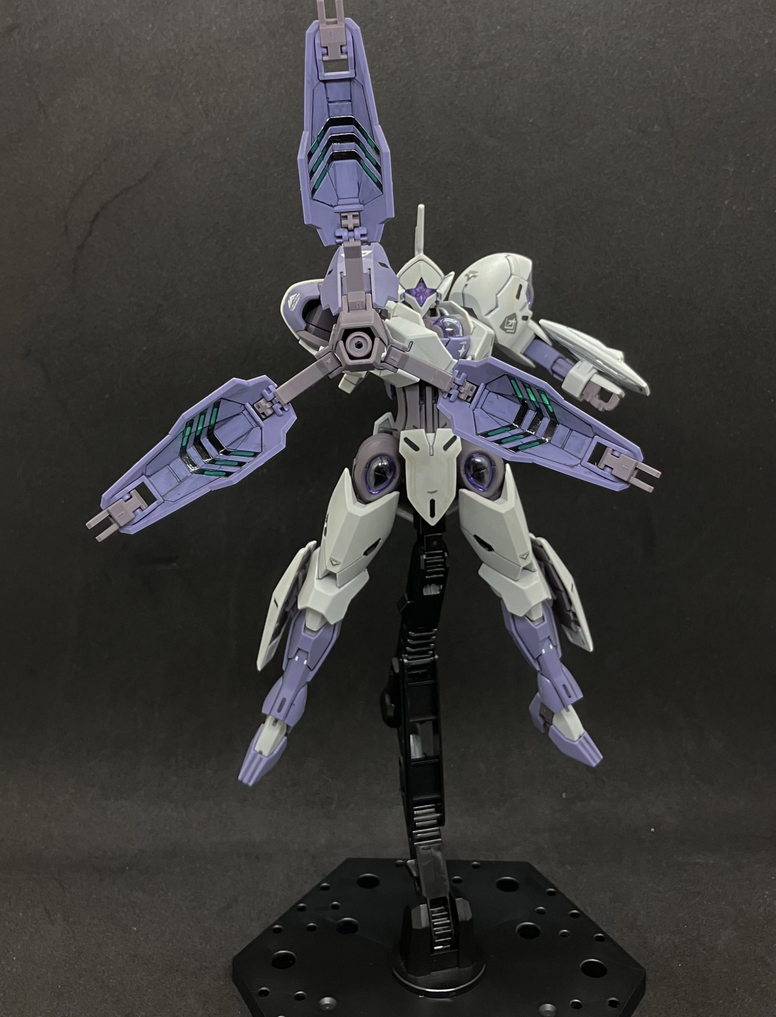 別売のガンダムデカール「水星の魔女汎用②」を貼りトップコート後にシェルユニット的なメカ部分をガンメタで塗装し、発光部のホイルシールを貼りました。当初はシルバーでの塗装予定でしたが、クリアパーツの透明度が予想以上に高く、悪目立ちしそうだったのでガンメタにしました。頭部カメラ内はシールです。