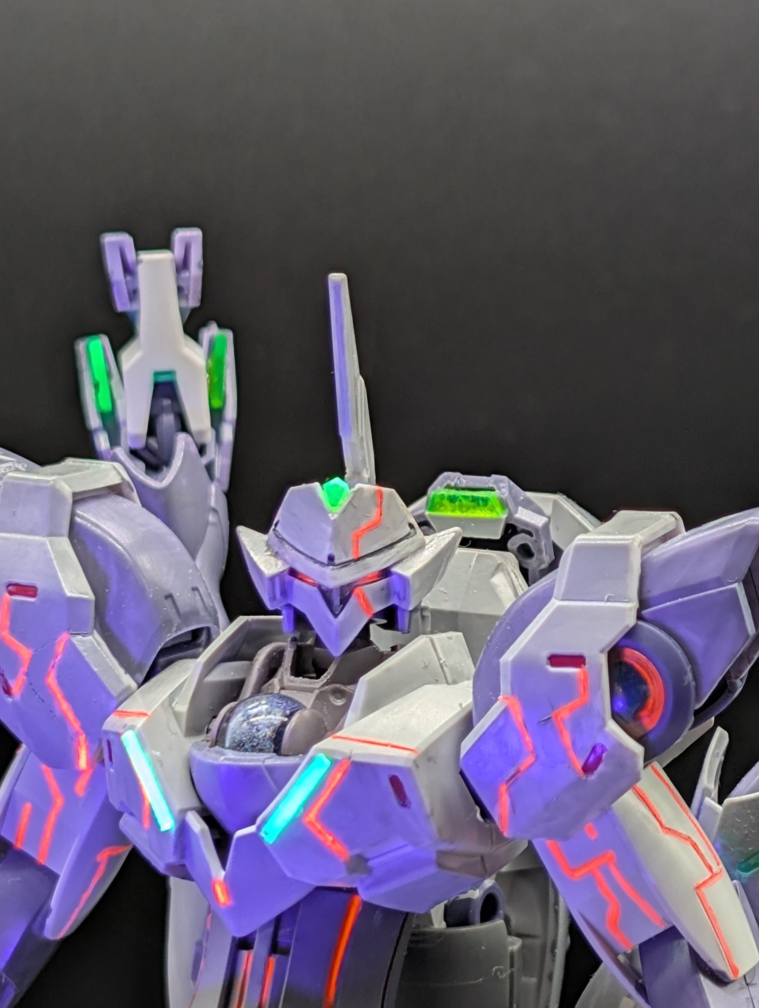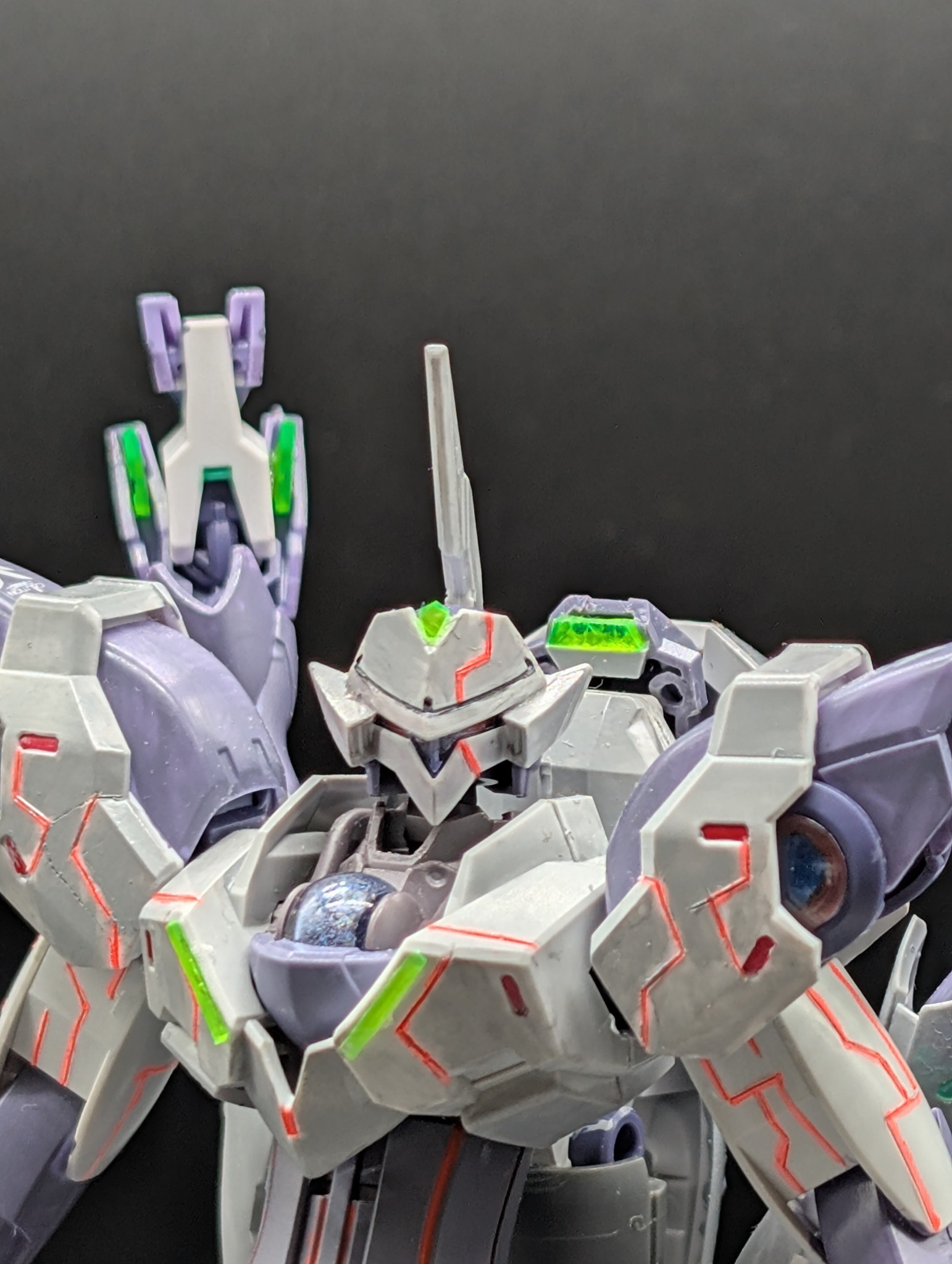 水性ホビーカラーの蛍光レッドでスミ入れ、グリーンのクリアパーツはサーベルのランナータグを切り出して接着しました。両方ともブラックライトで発光します。