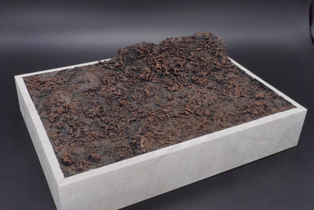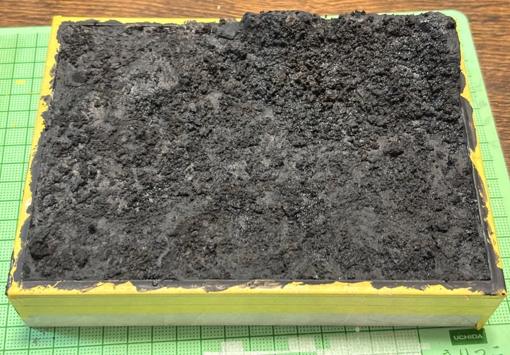スタイロフォーム+石膏粘土→砕いたコルクを接着。黒で塗りつぶしてから茶色ドライブラシで土っぽく仕上げています!製作中の写真は以下