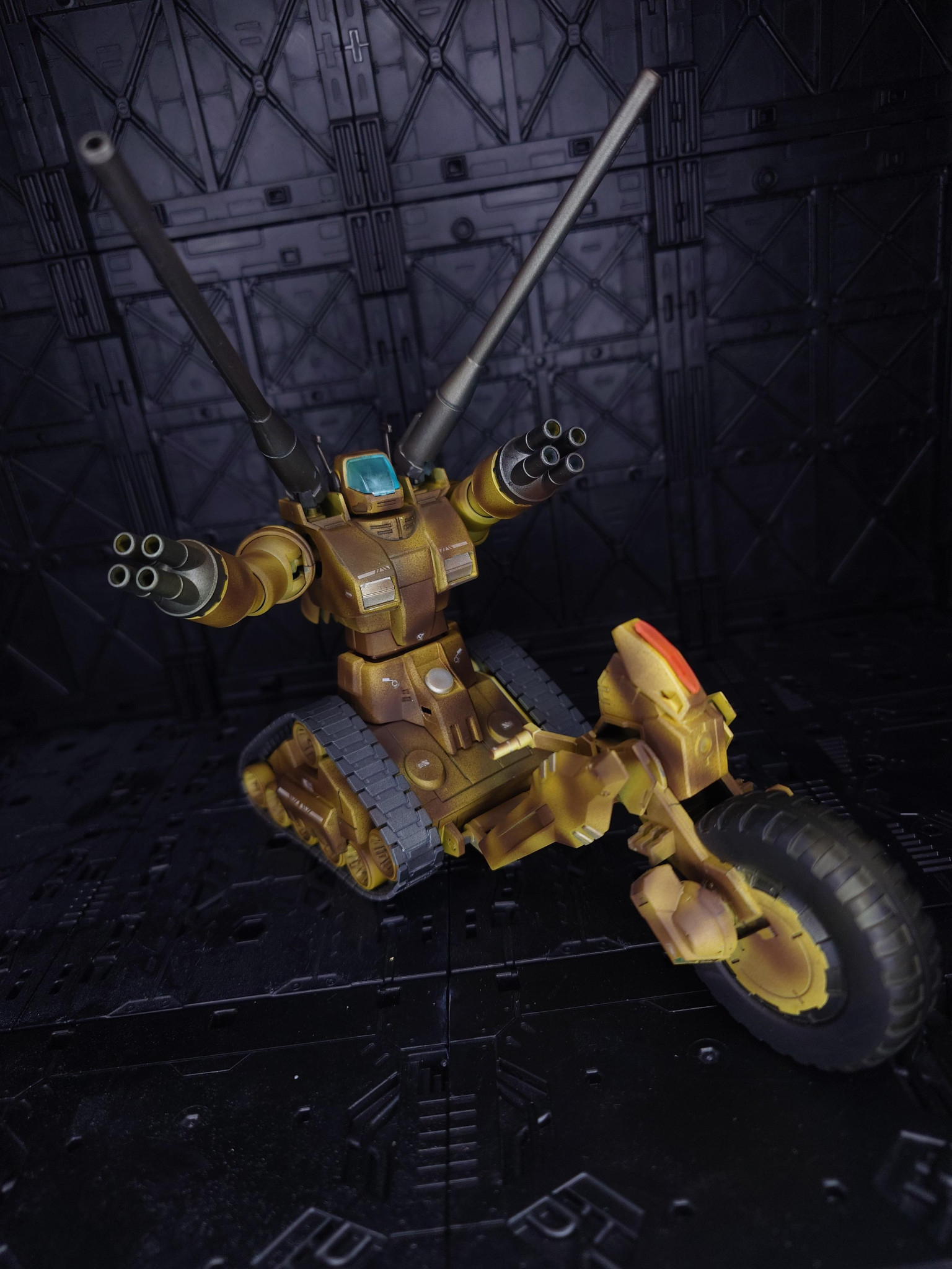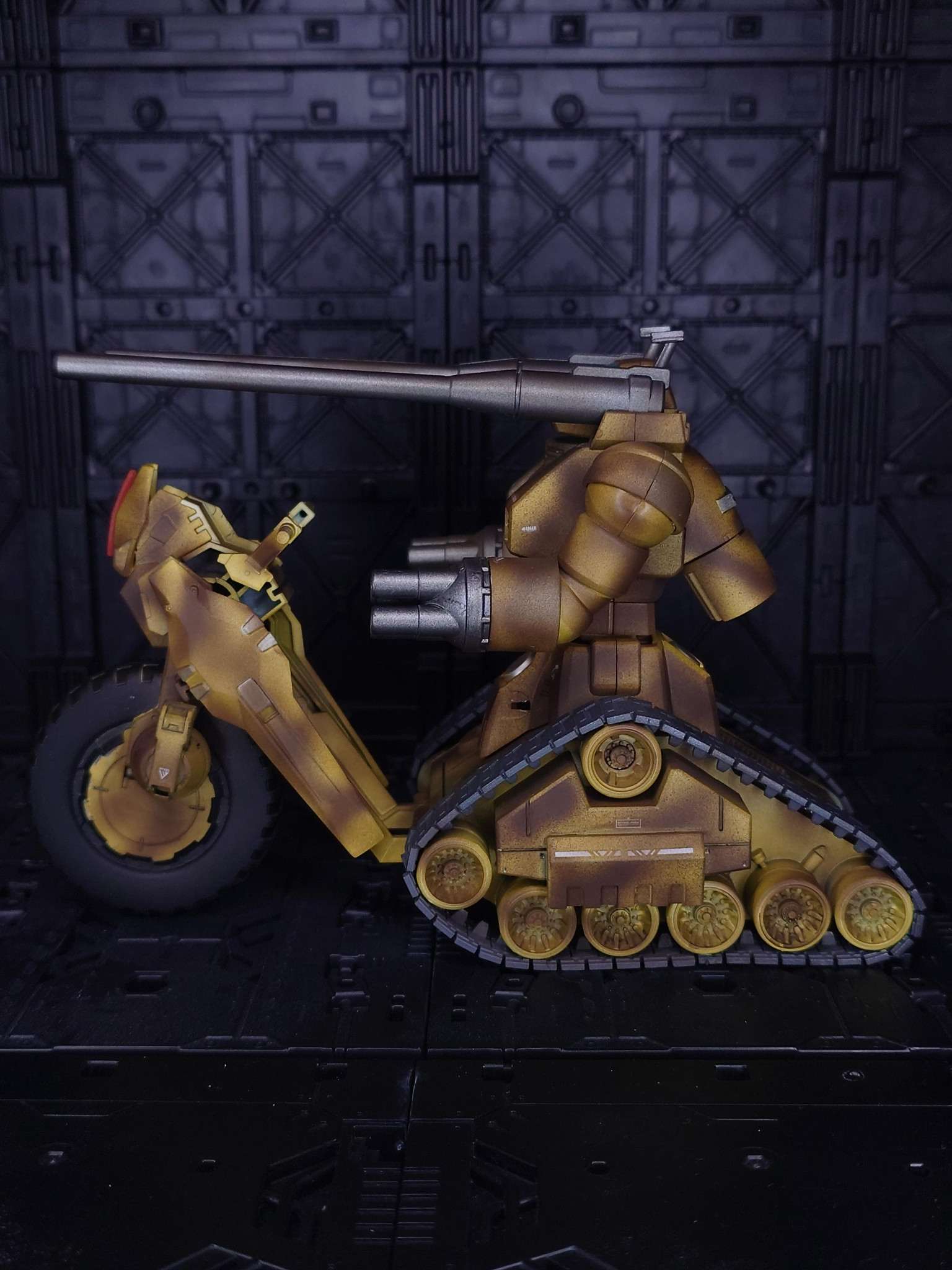 重心高めなガンタンクの陸上機動性を高める的なコンセプトで大型タイヤを前方に配置した変則三輪の本作。