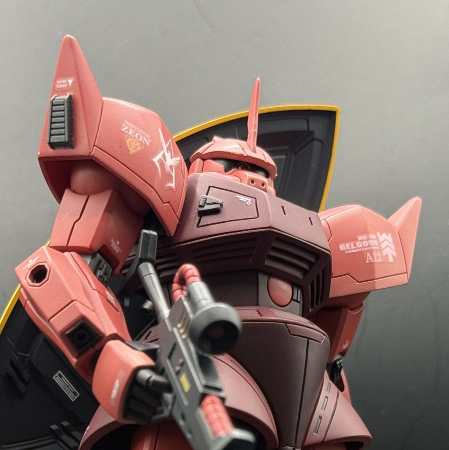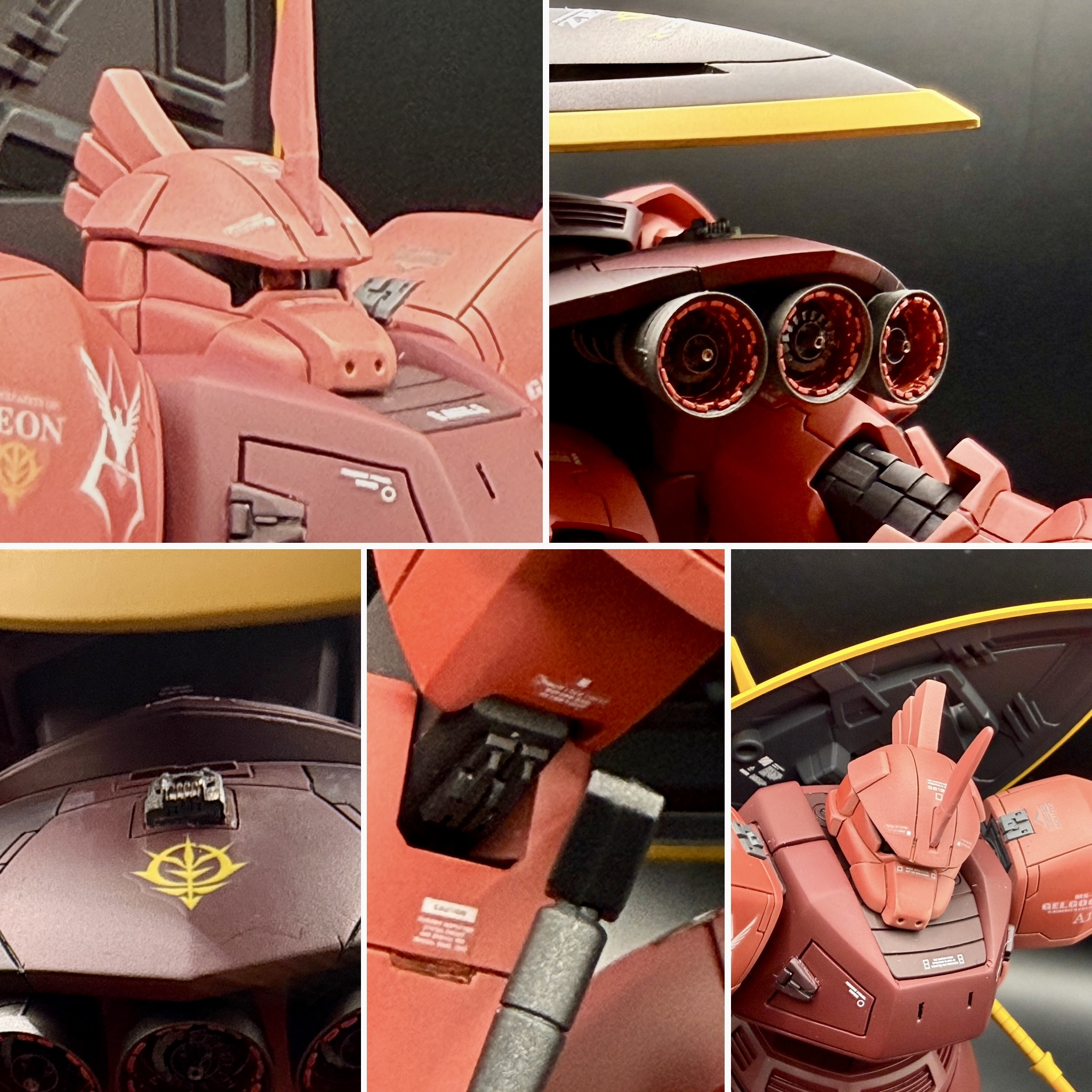 フレーム部分は、写真ではわかりにくいですが、シャアピンクのパーツに馴染むよう、黒を加えたガンメタに赤みを加えています