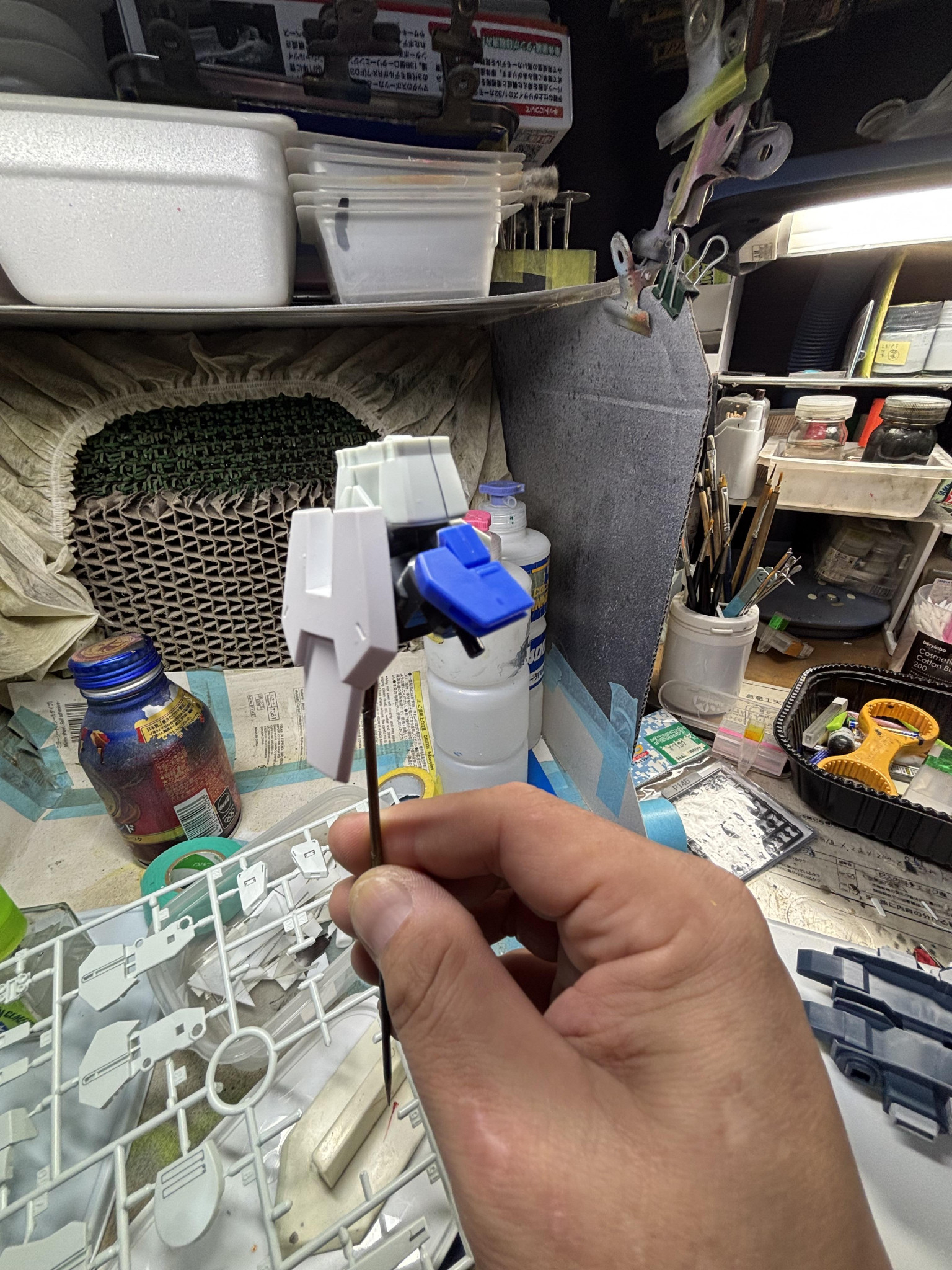 今回の工作 顔面パーツを切り離し少し奥へ入れ、顎を削って少し小型化、アンテナのシャープ化ハイメガをプラ板でボリュームアップ襟のディテール作成首を1ミリ、胴を1ミリ足首を3ミリ延長。股関節、肩関節の可動部の改良。バックパック基部の改造バーニア等ビルダーパーツに置き換え。腕バインダーの基部を作成。リアアーマーを作成。膝アーマーのパテ埋めです。