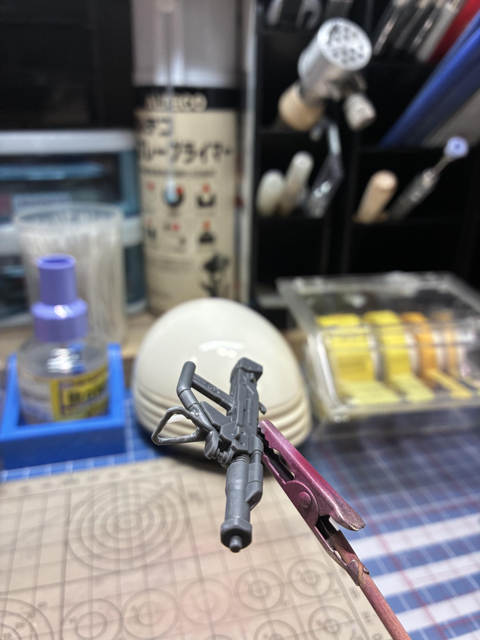 ザクマシンガンの謎の板はくり抜いてプラ棒を引っ付けて〜こういう作業は楽しい♪