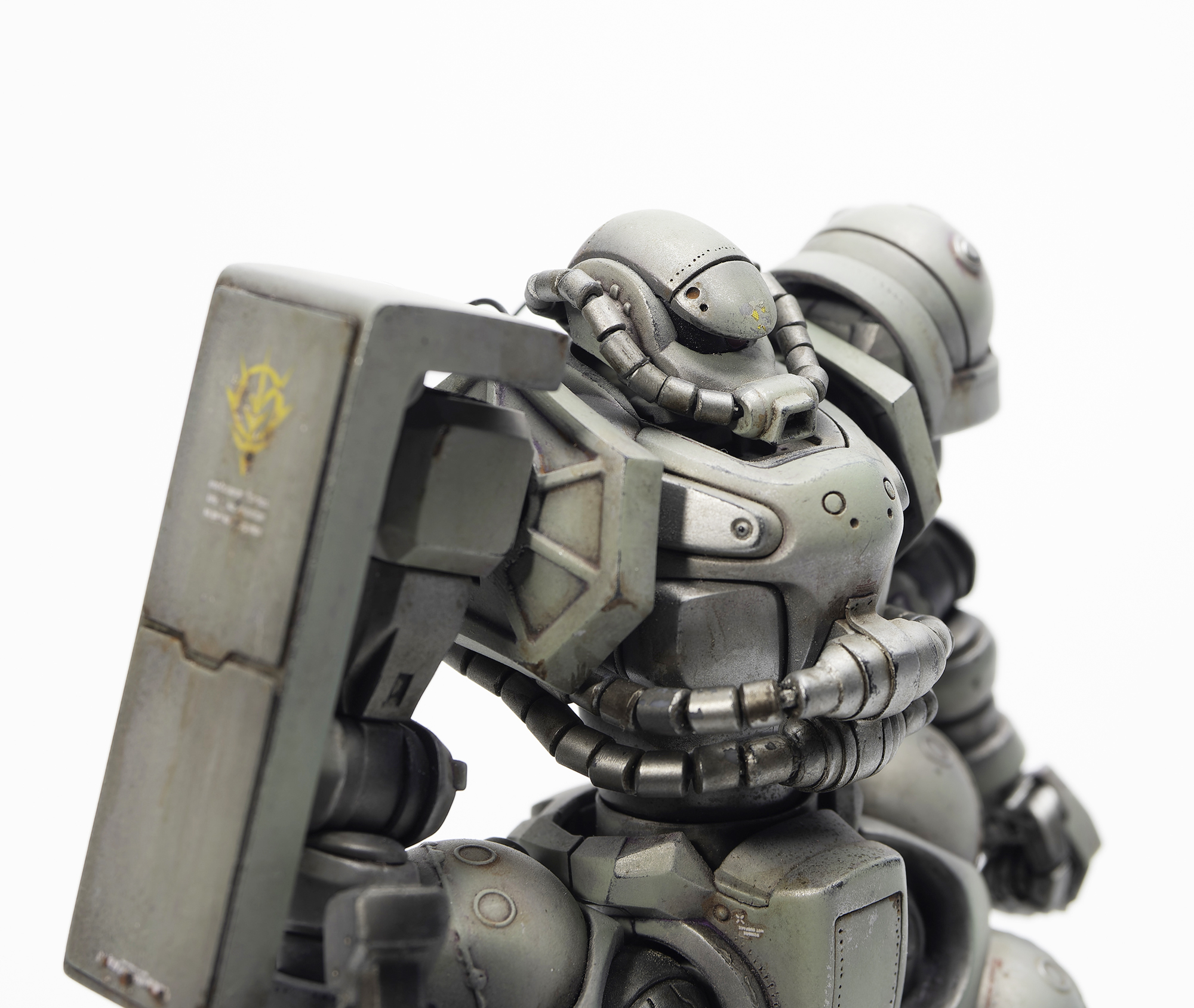 一度メタリック系シルバーで塗装した後に、クリアを混ぜたザク色で塗装。さらに補色の紫でフィルタリングしました。