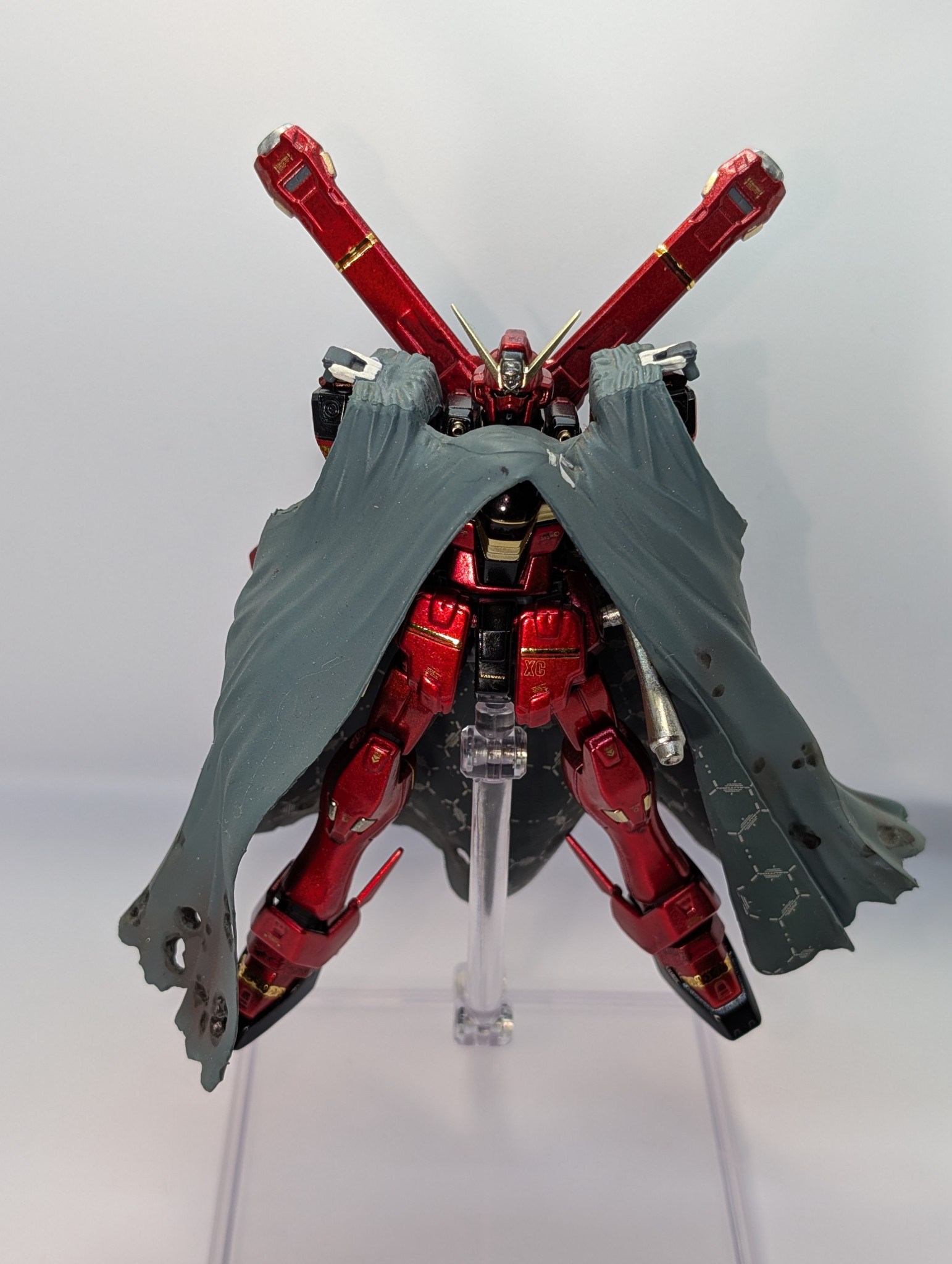 ABCマントは付属しないので、遥か昔に購入しホコリとヤニまみれだったGFF初期も初期のクロスボーンガンダムX1から拝借。裏地の幾何学模様がチャームポイント。