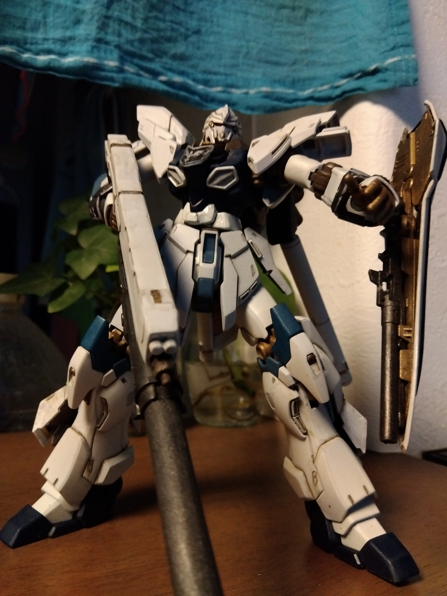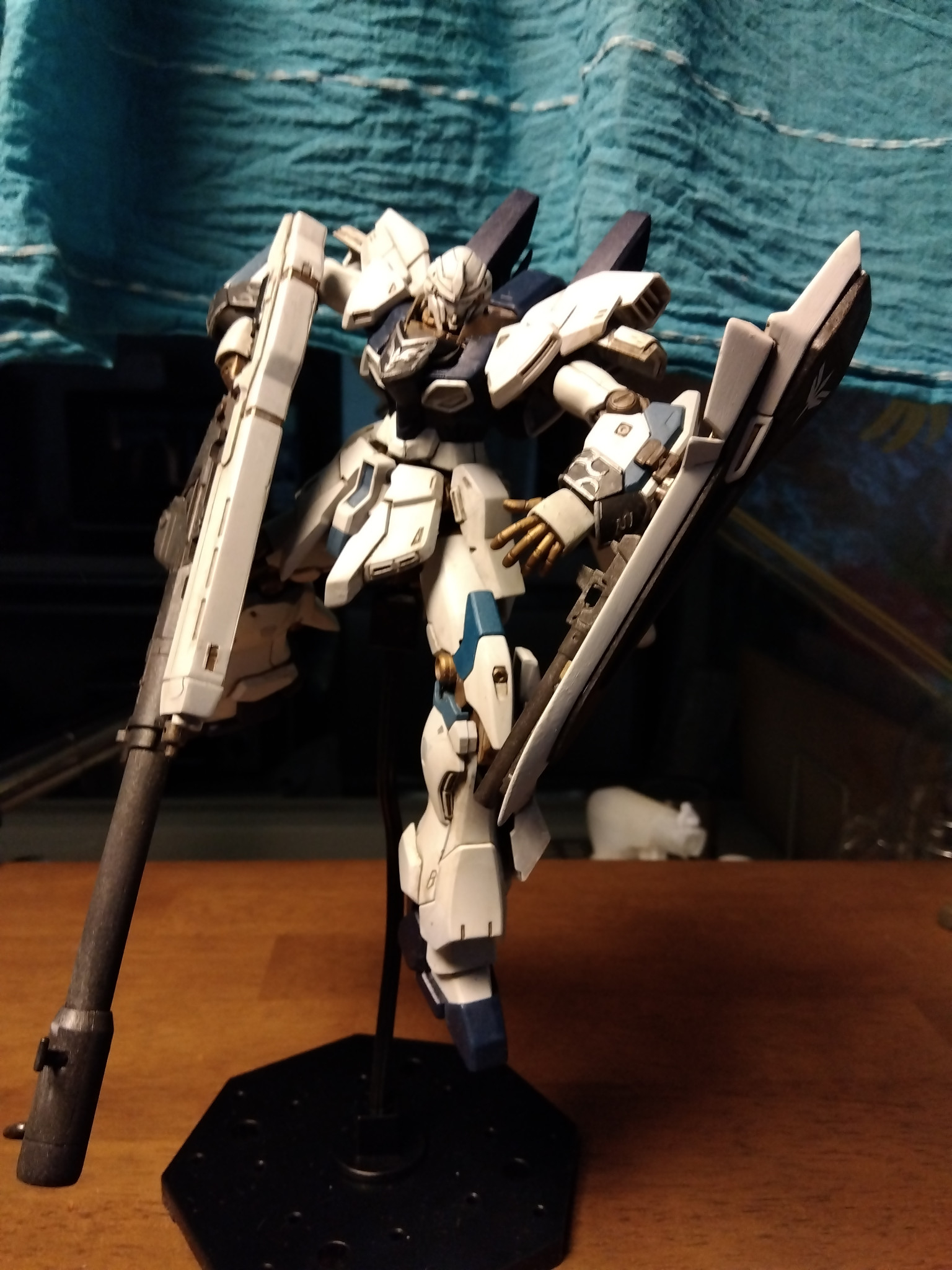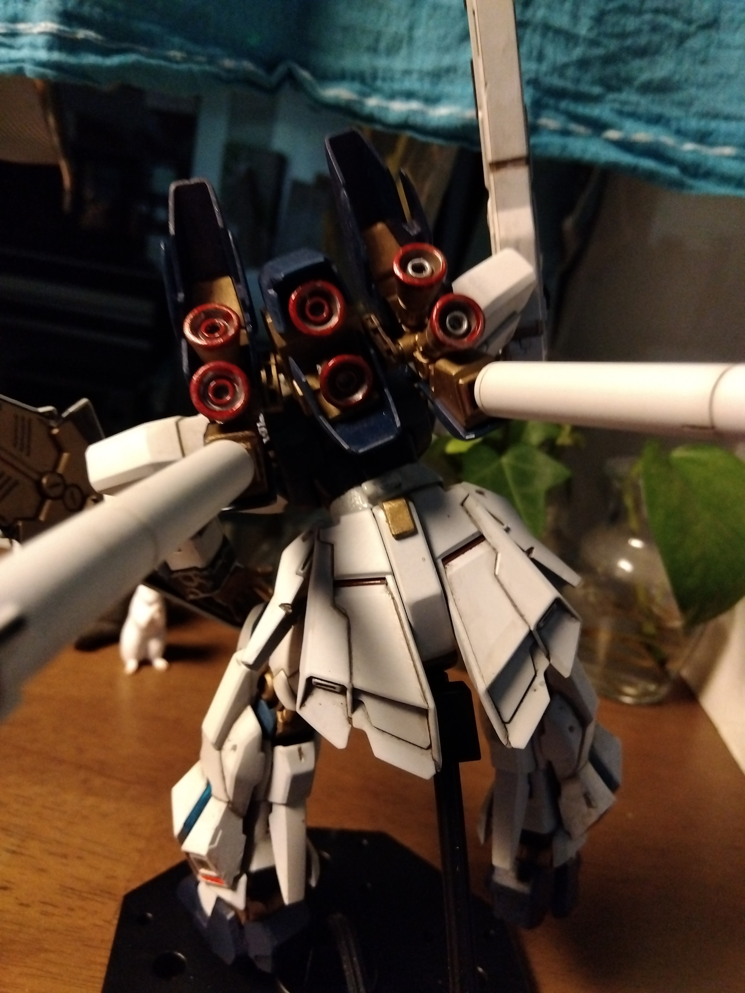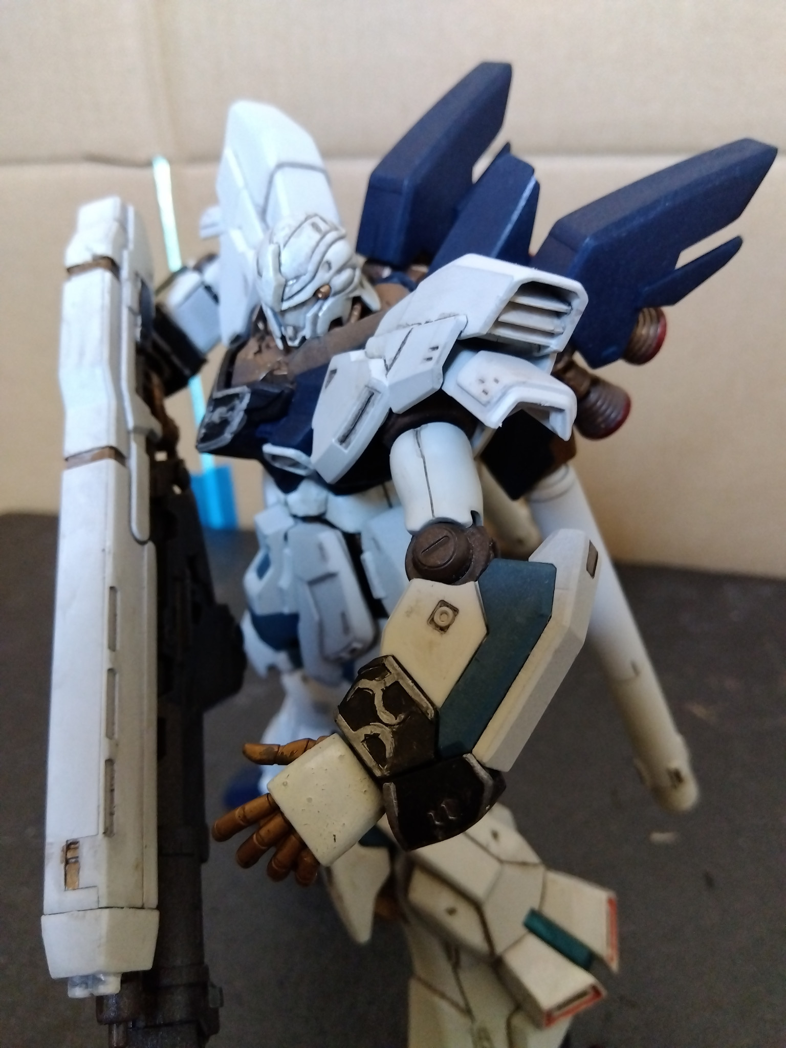 さすがに最新作のHGは、バランスが良く、完成度が高いので作るのに骨がこりました(^ν^)つや消しに見えますが、全てのパーツを紙ヤスリの400番で表面処理後に塗装すると手間がかかりますが、トップコートを散布しなけても、つや消し感と重量感が出ます。オリジナルテクニックグー👍️!!?おすすめです😊