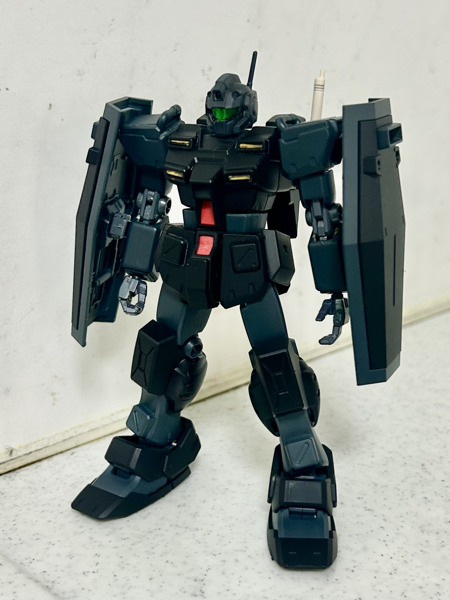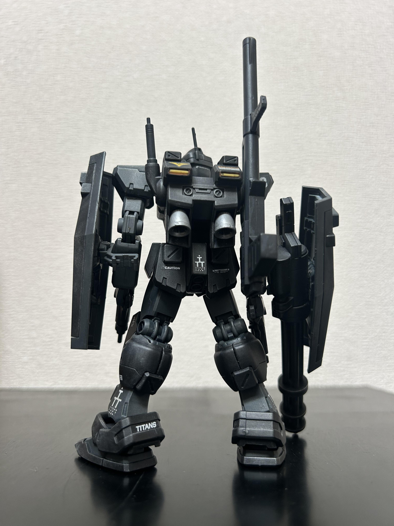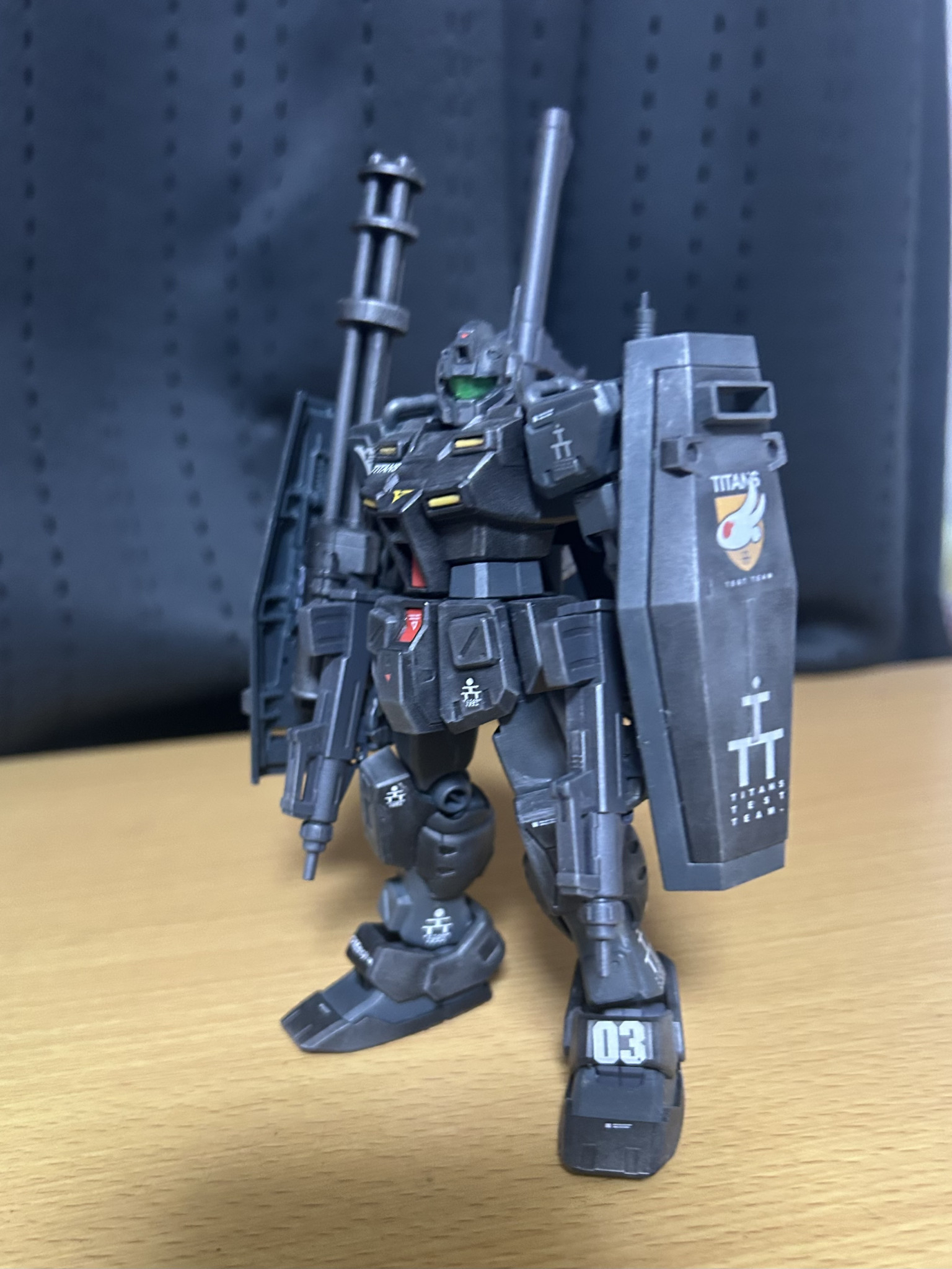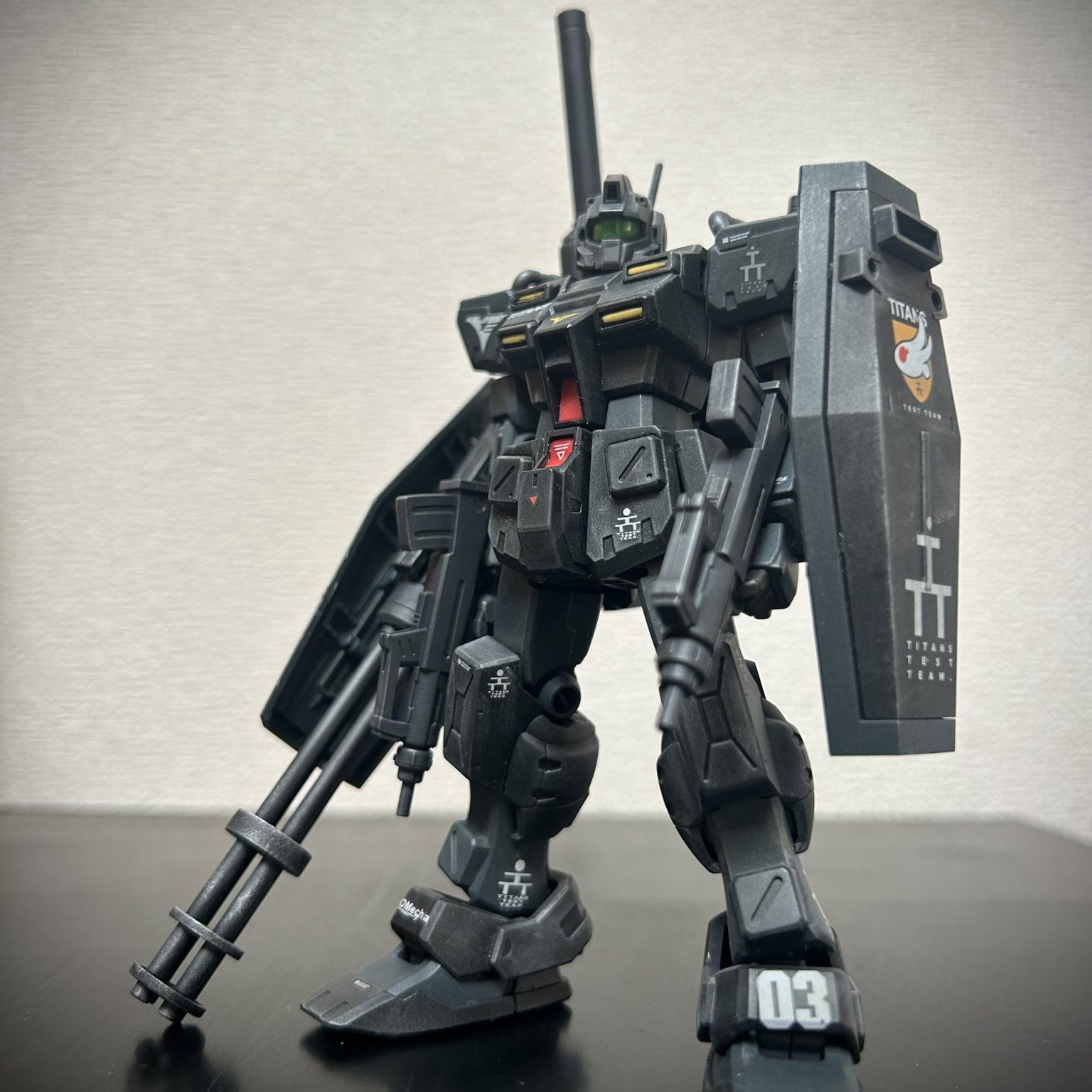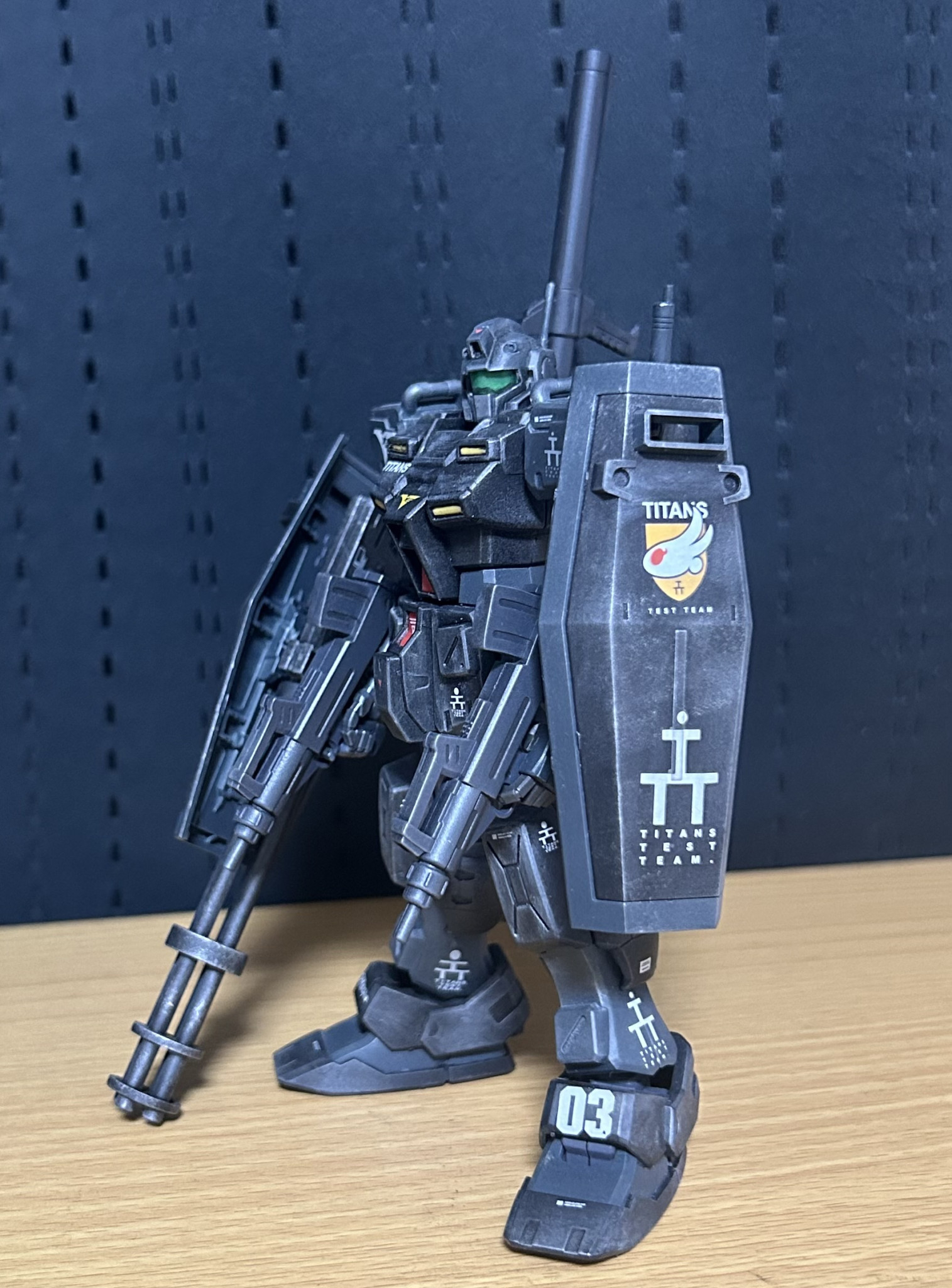 ジムクウェルに先立ちT3部隊に先行配備されたパワードジム。ブルパップマシンガン2丁、クレイバズーカ、そしてガトリングシールドを装備した強襲機として制作しました。ティターンズブルーが手に入らなかったのでダークブルーをメインカラーに全塗装、AOZデカールにドライブラシ、ウェザリングを施してます。