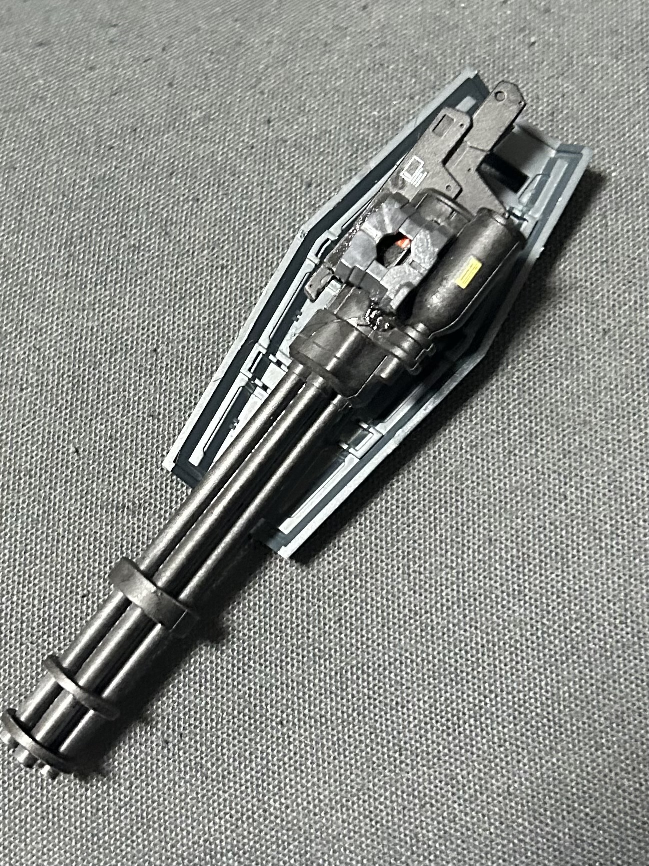 ガトリングシールドは境界戦機ウエポンセットから流用し、ジャンクパーツとポリパテで固定。接続は腕部にネオジム磁石を仕込んでます。バックパックも同様にネオジムでクレイバズーカを懸架させてます。
