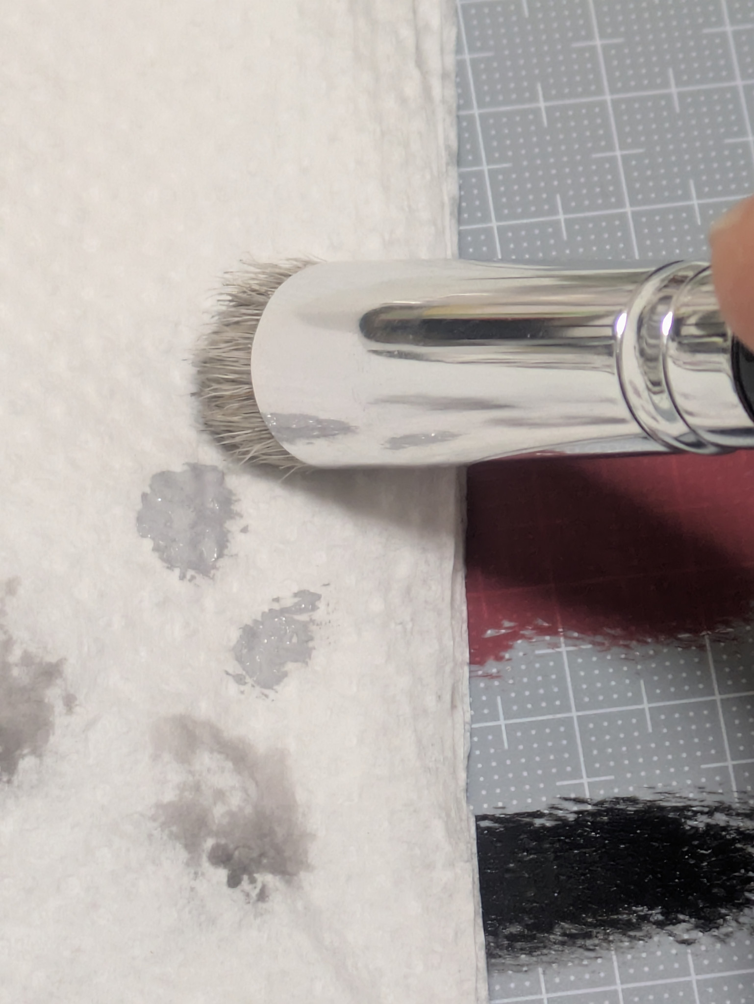 筆に塗料をつけてキッチンペーパーでかなりカサカサになるくらいまで拭き取ります。