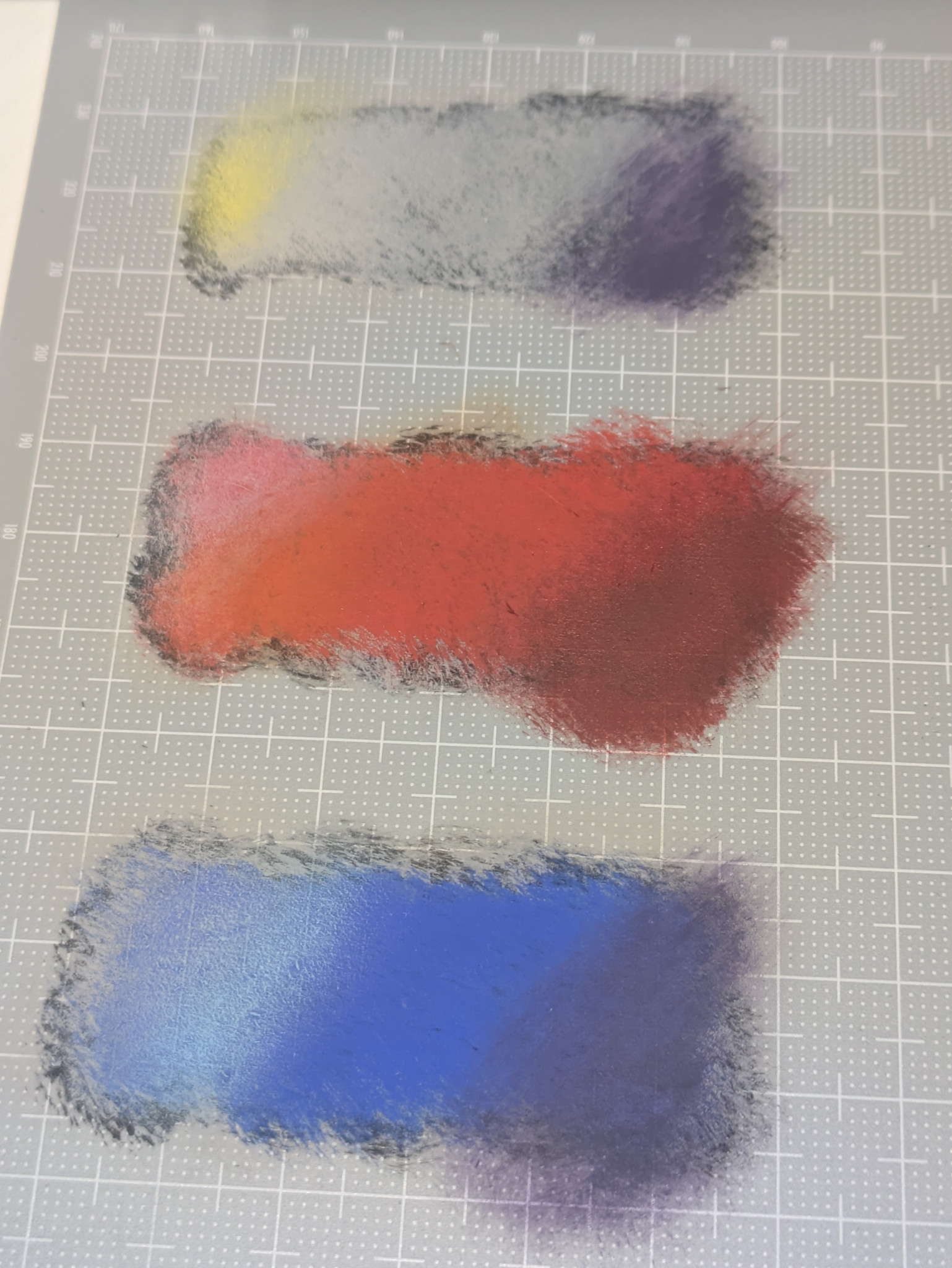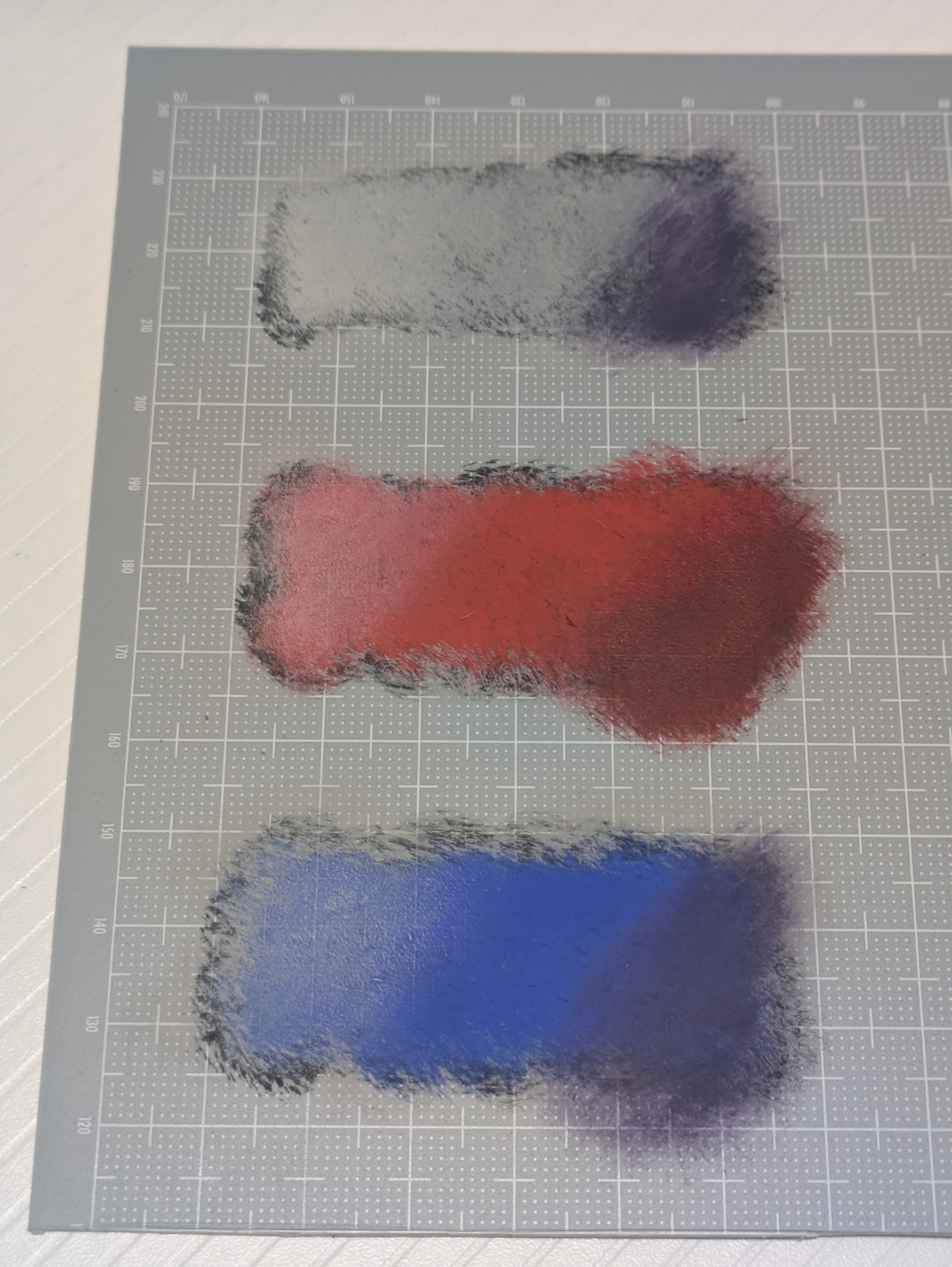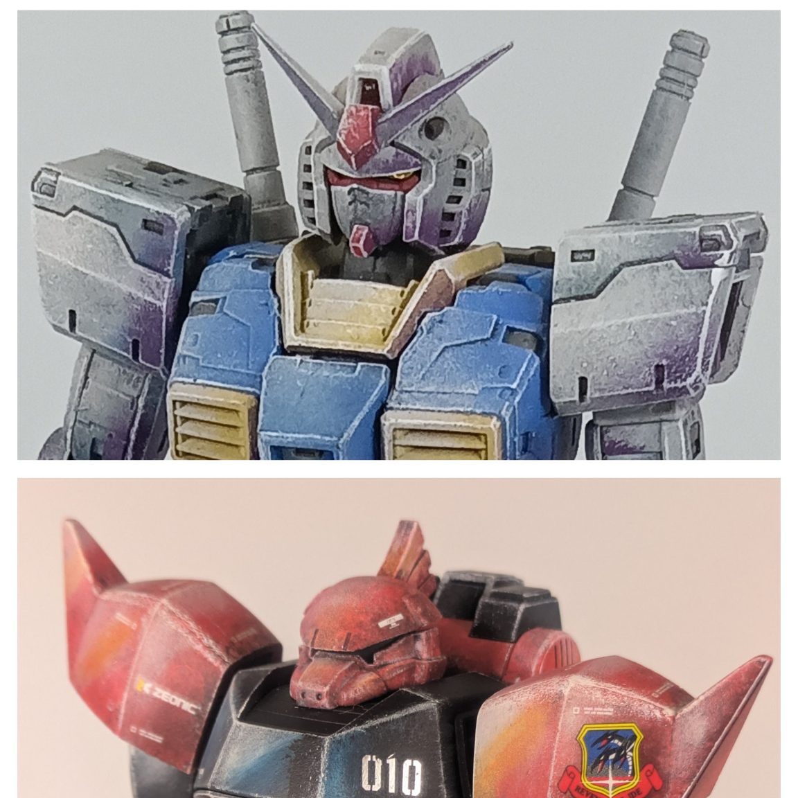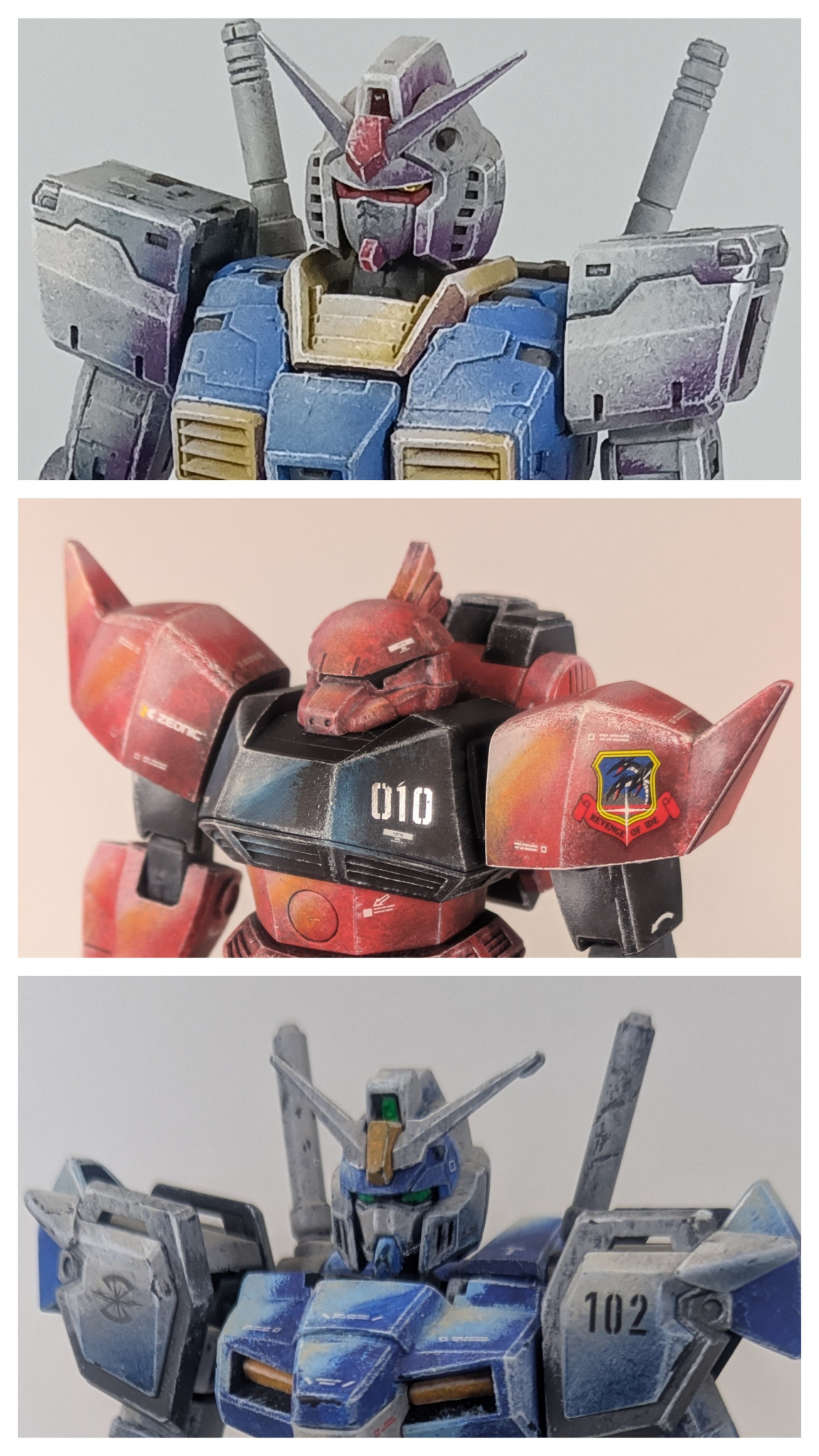 サムネに合わせて写真の上がガンダムの白部分、中がゲルググの赤、下がデュエルの青と同じ色を使って明暗をつけた結果です。