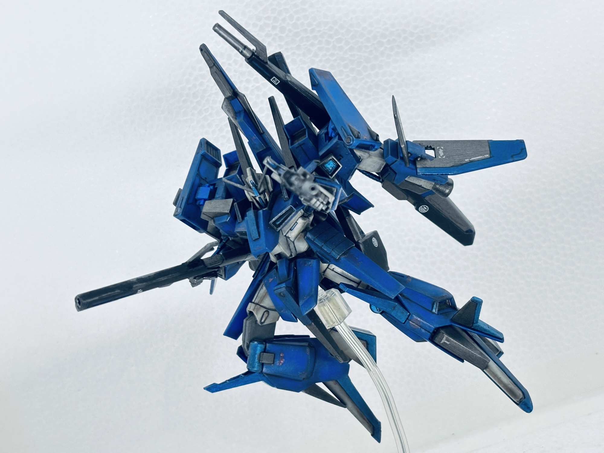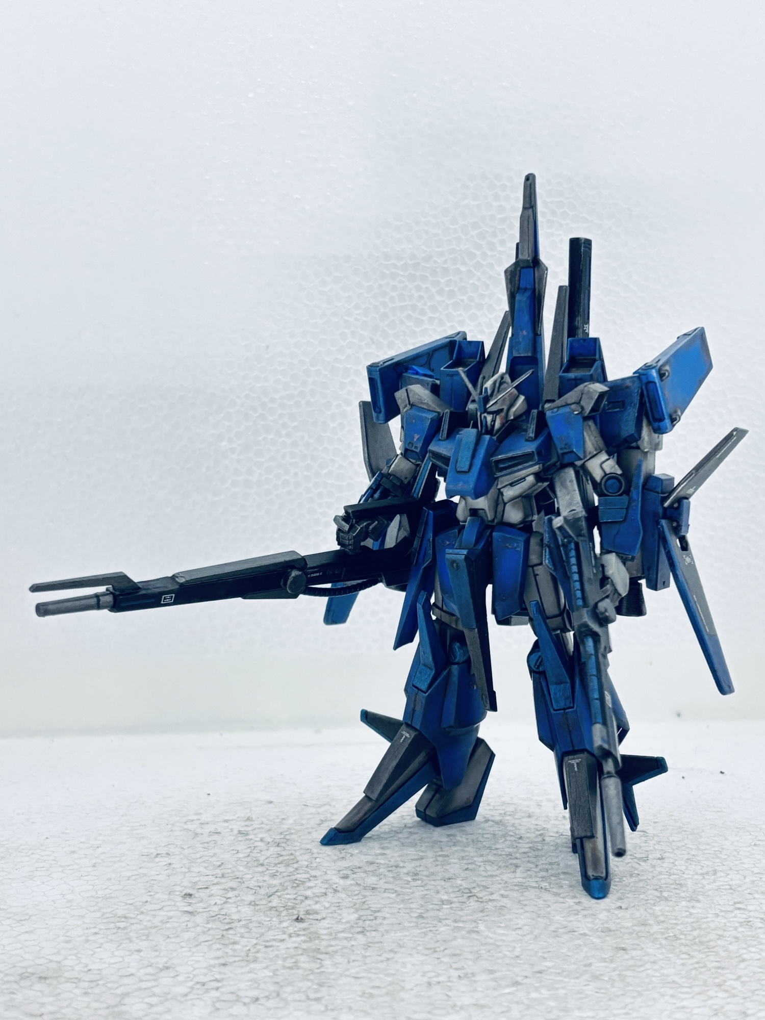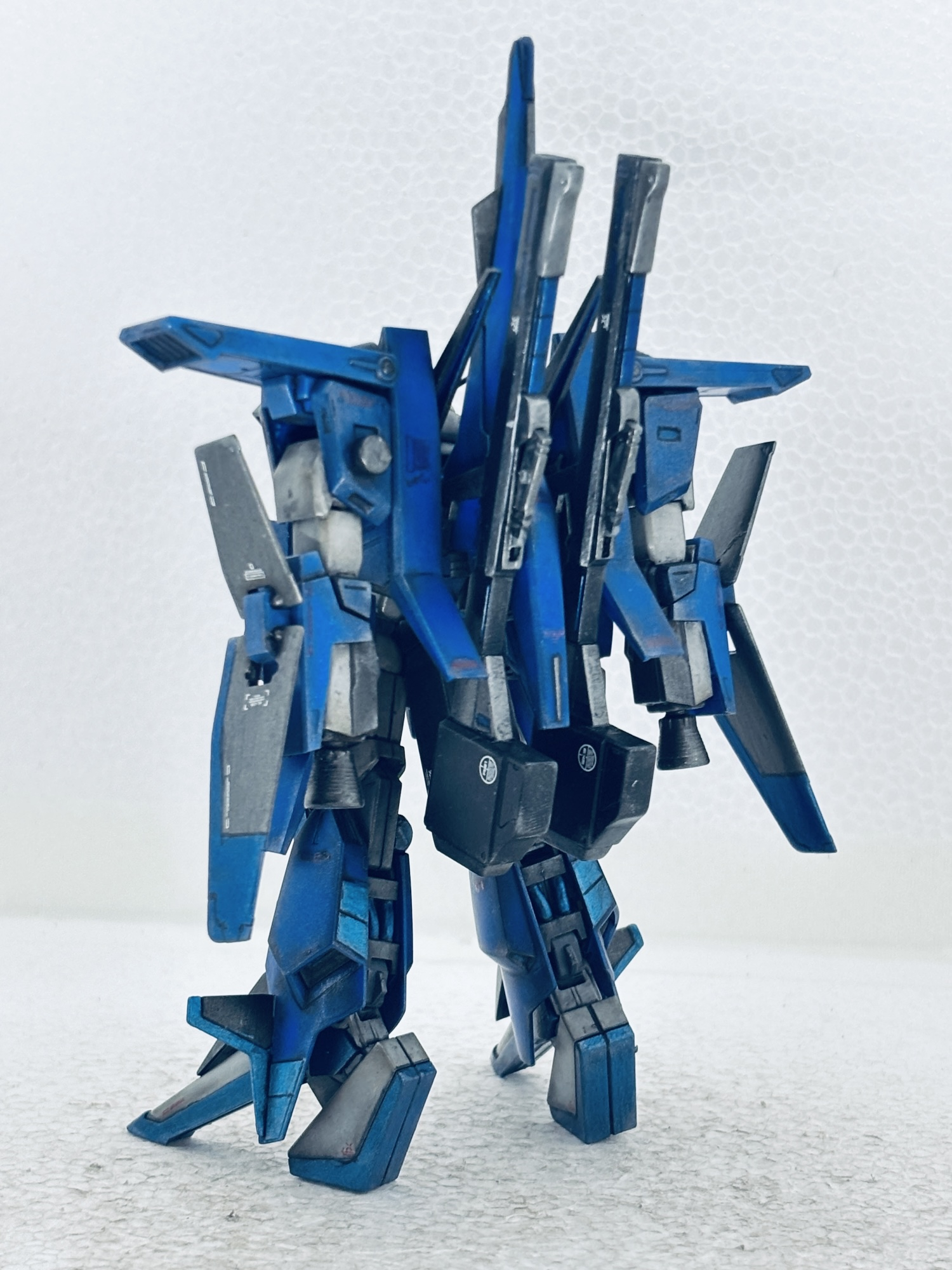 バックパックにZZの腕(Gフォートレス時のバーニア)を3mm軸を接着して取付、フレキシブルブースターとして運用する設定。ところがこのジャンク品アームの回転軸が折れて、年明け早々真鍮線オペを敢行。撮影のポージングの際も折れて2度のオペをする羽目に…最後はブチ切れて可動無しの接着の刑に処しました。トホホ…