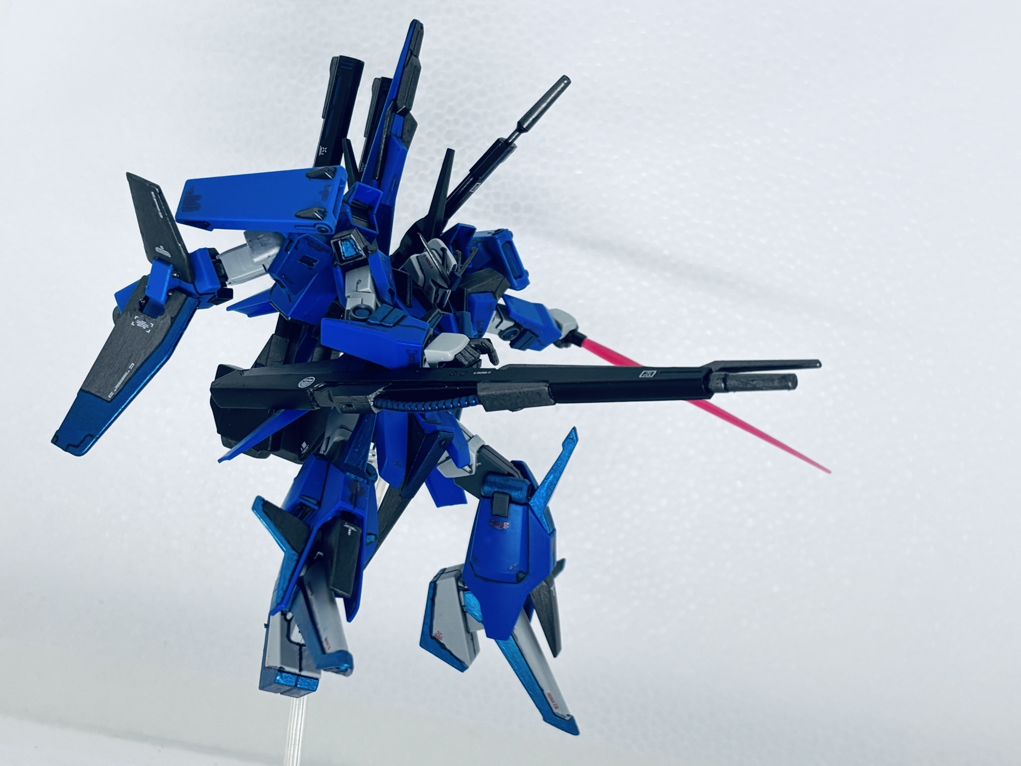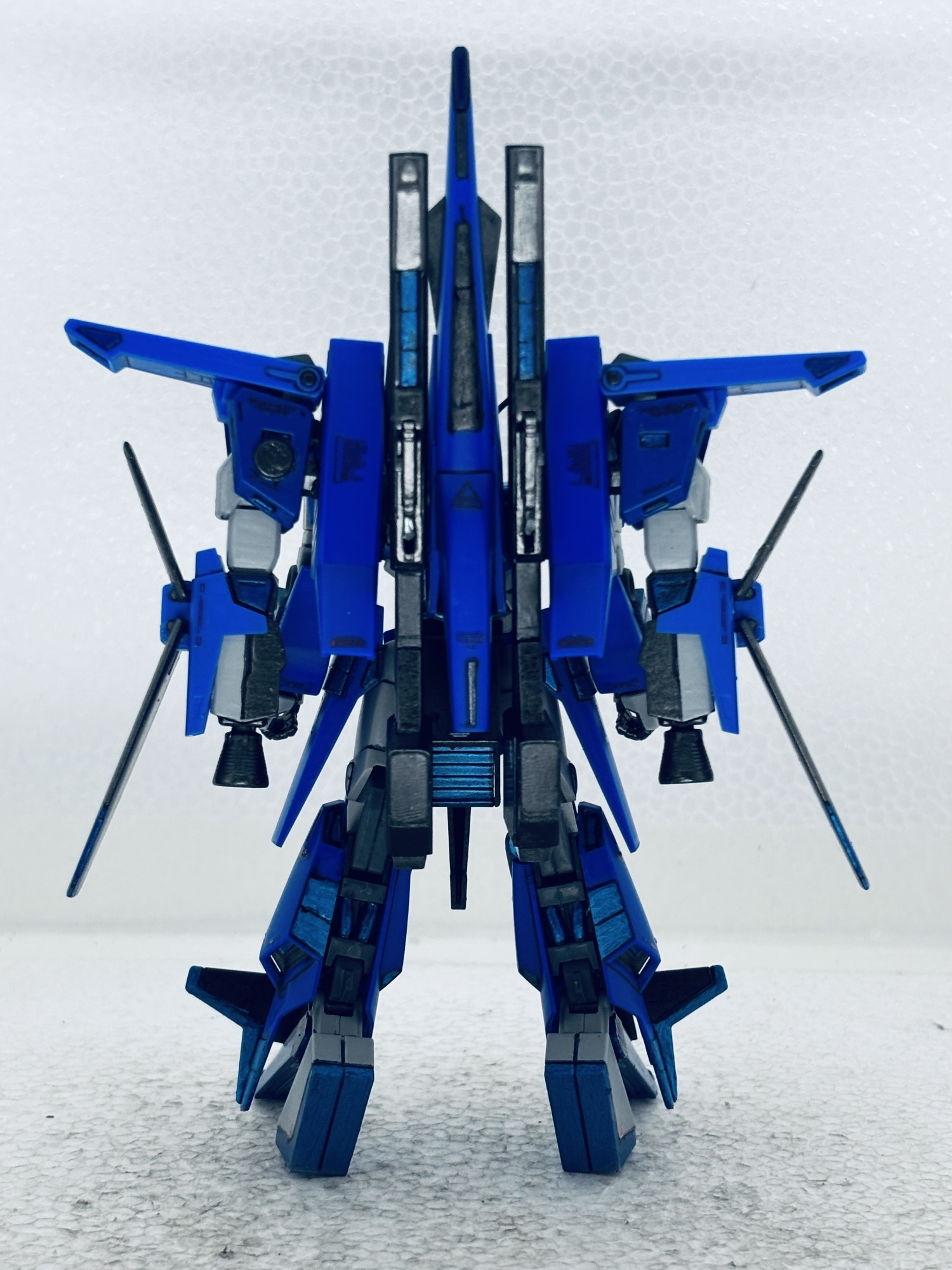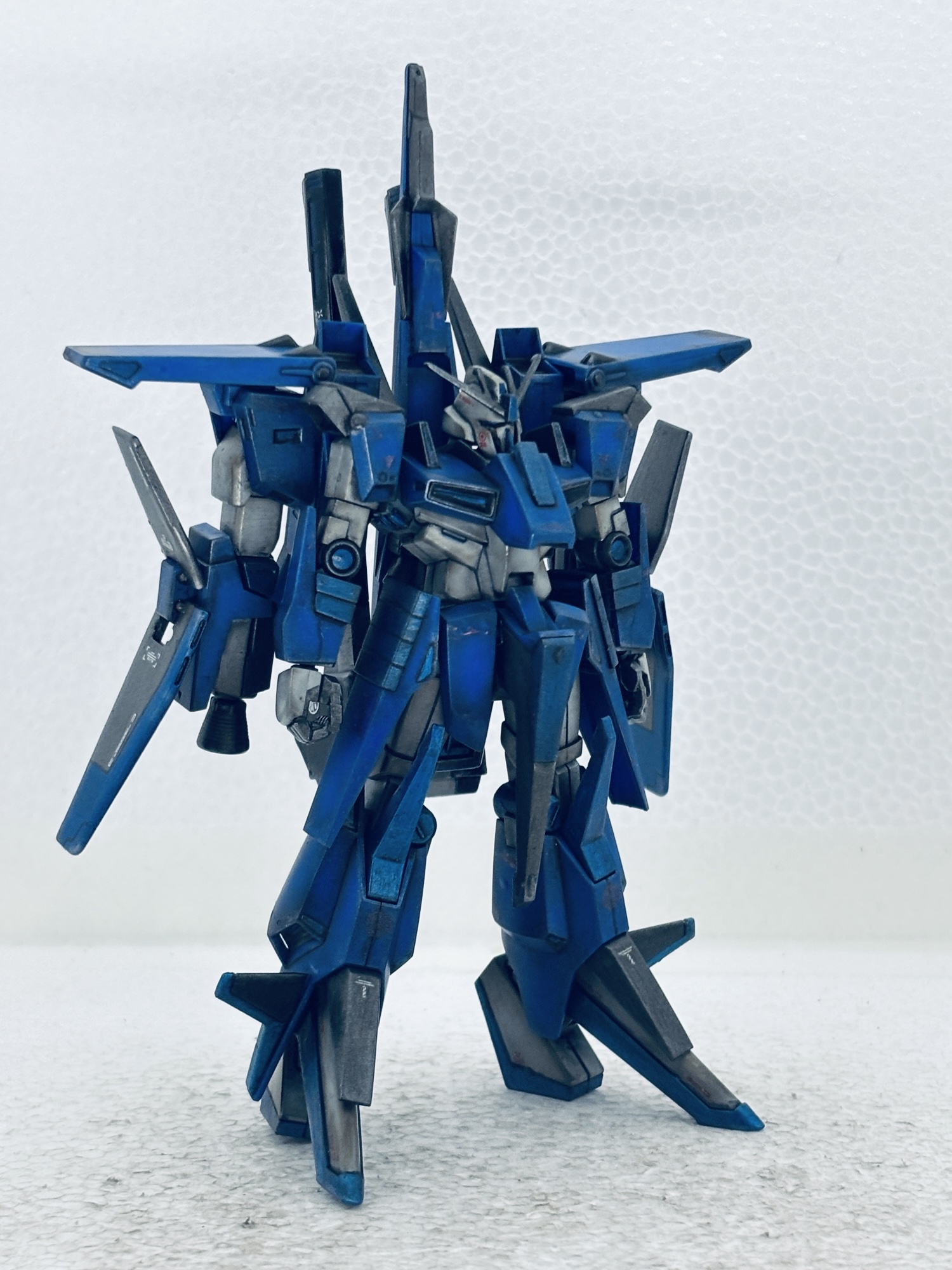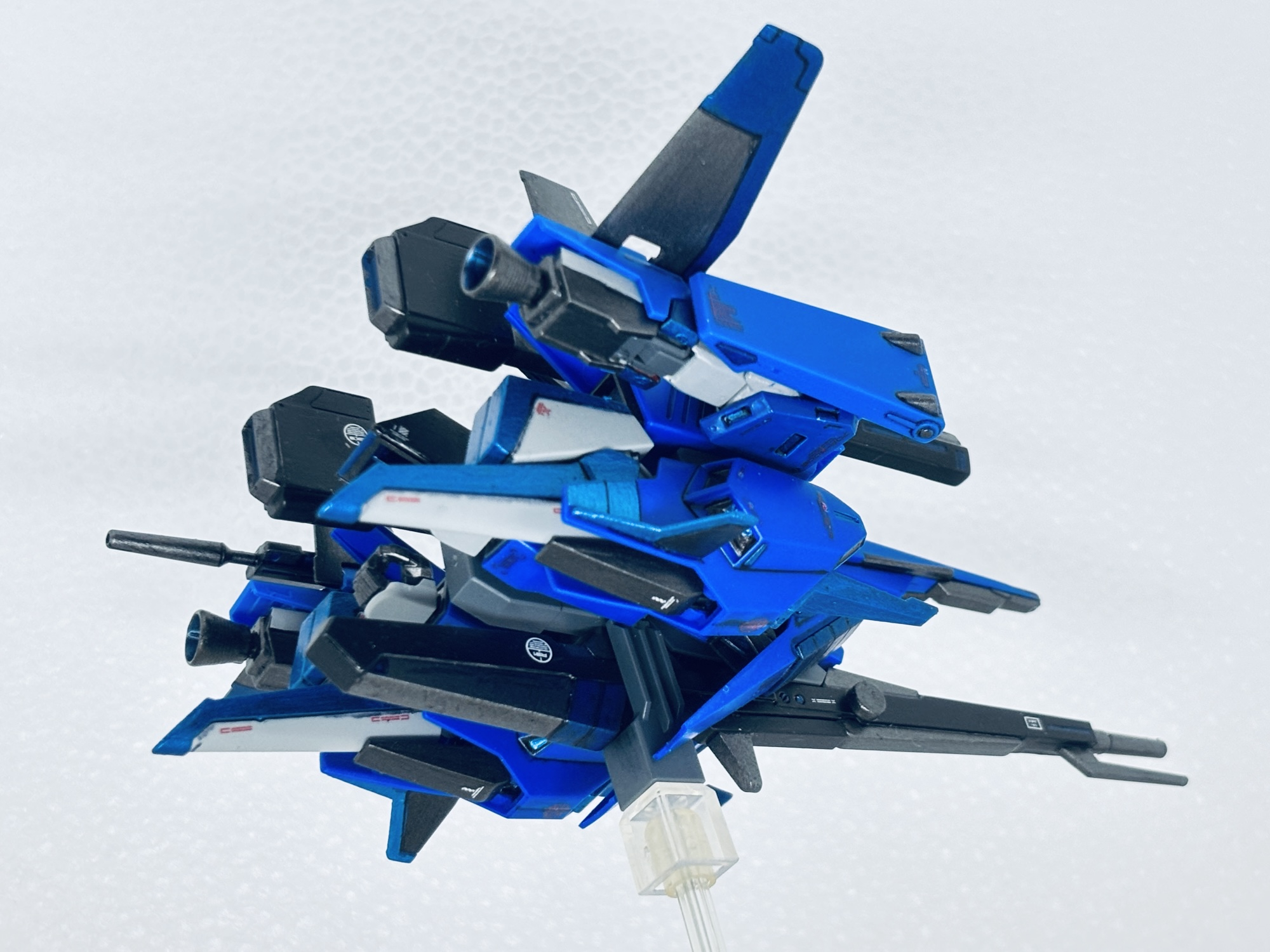 バックパックにZZの腕(Gフォートレス時のバーニア)を3mm軸を接着して取付、フレキシブルブースターとして運用する設定。ところがこのジャンク品アームの回転軸が折れて、年明け早々真鍮線オペを敢行。撮影のポージングの際も折れて2度のオペをする羽目に…最後はブチ切れて可動無しの接着の刑に処しました。トホホ…