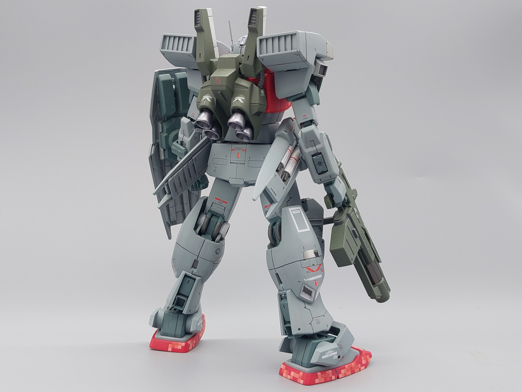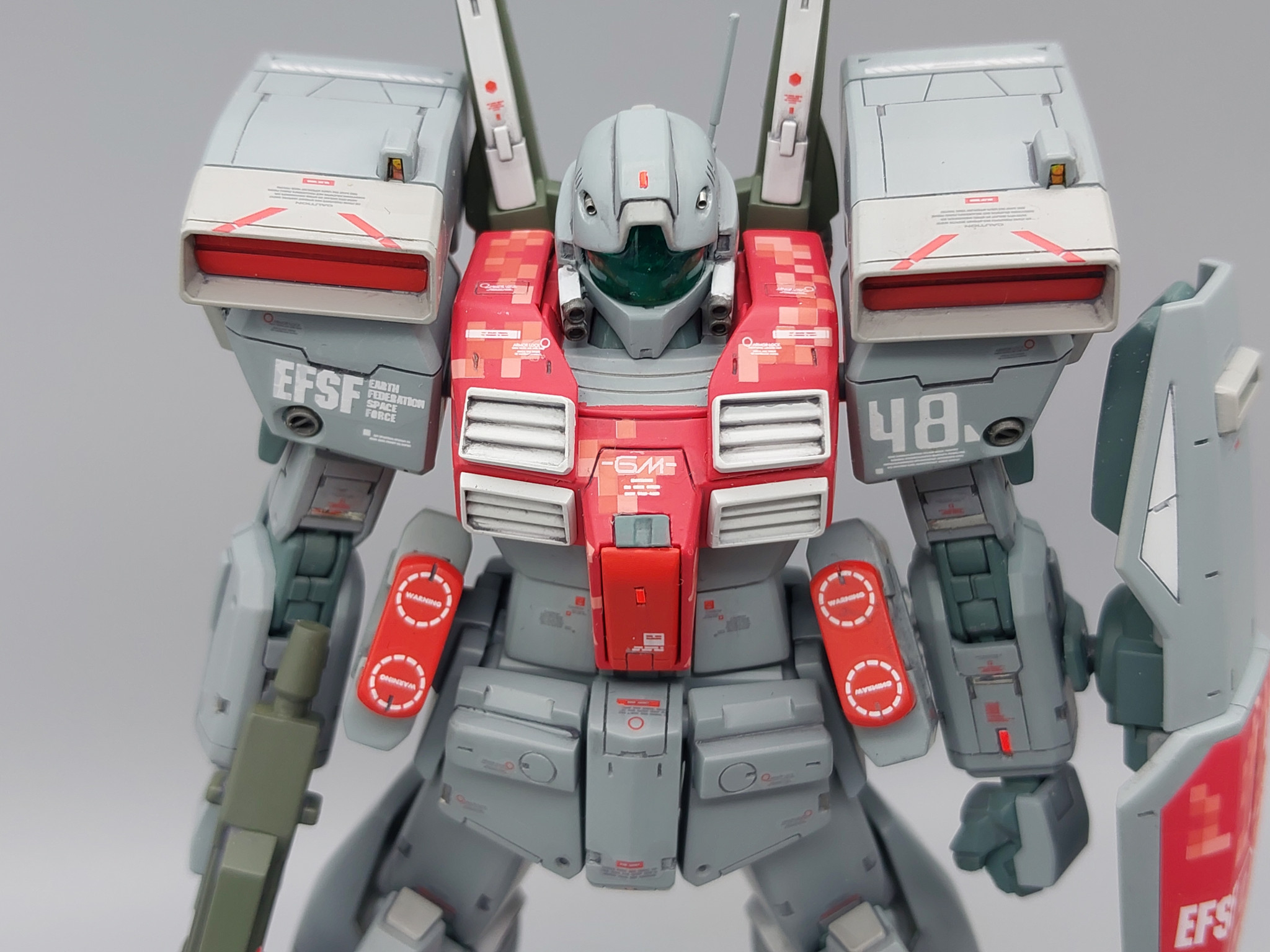 ありがとうございます、頭部はジムⅢの物をベースに前後に延長、クリアパーツも顎周り加工後の隙間部分をキットのランナーを削り出したもので塞いで使用しています。