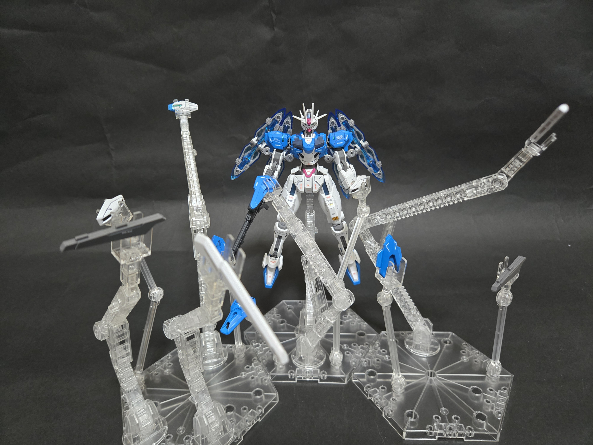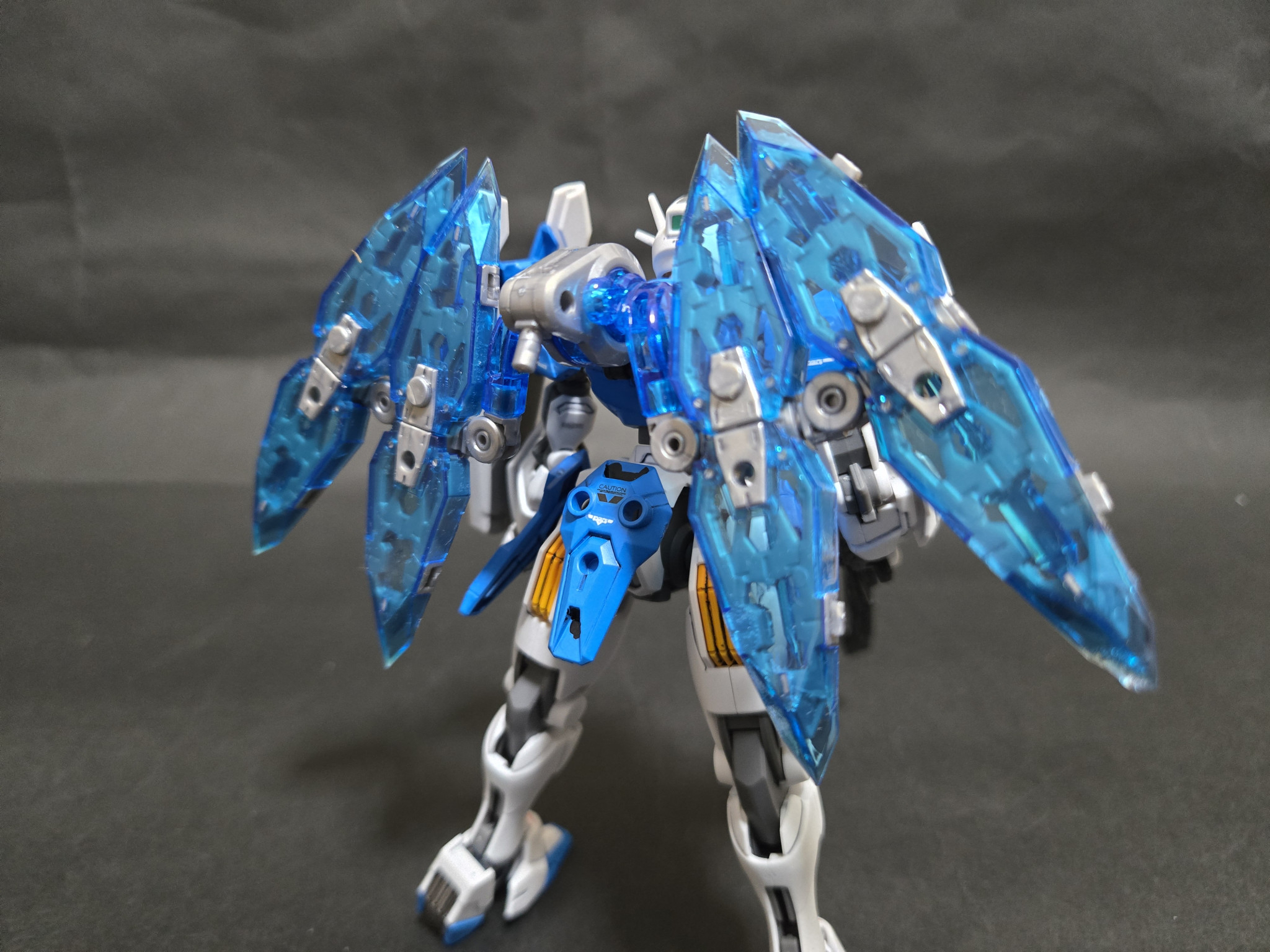 以前の愛機のガンダムファラリアルが、DG細胞に汚染された姿であるガンダムエビルエアリアルの背部に装備していた、ウイング状のシェルユニットを再現する形で製作、パーメットスコア6をイメージしたクリアーブルーに塗装されている。