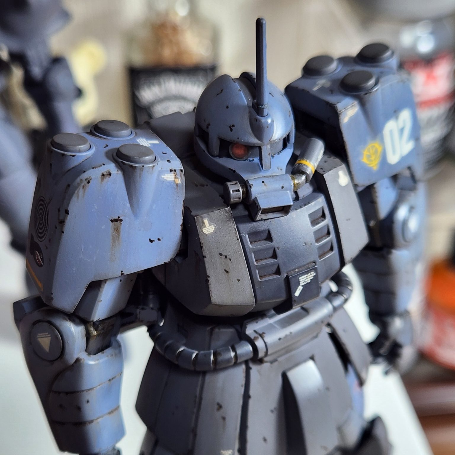 太ももと足首下をORIGINザクII、足の甲をグフカスタムからミキシングして、間接の取り付けを反対にし、胸厚みを0.5ミリプラ板で段差をつけました。カラーリングは、水中行動出来る機体っぽく見えそうな色味にし、長く運用されている事を考えて、くすんで見えるようにフィルタリング、オイル滲みや剥げや錆等のウェザリングも少し多く入れました。
