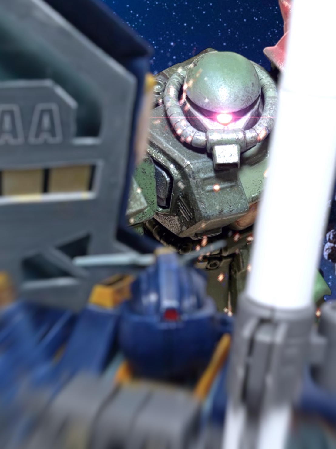 マイセンは、キラリと目を光らせると、前方にビームを放った。前に出てきた赤い肩のザクは仕留められなかったが、後続の2機を撃ち落とす。